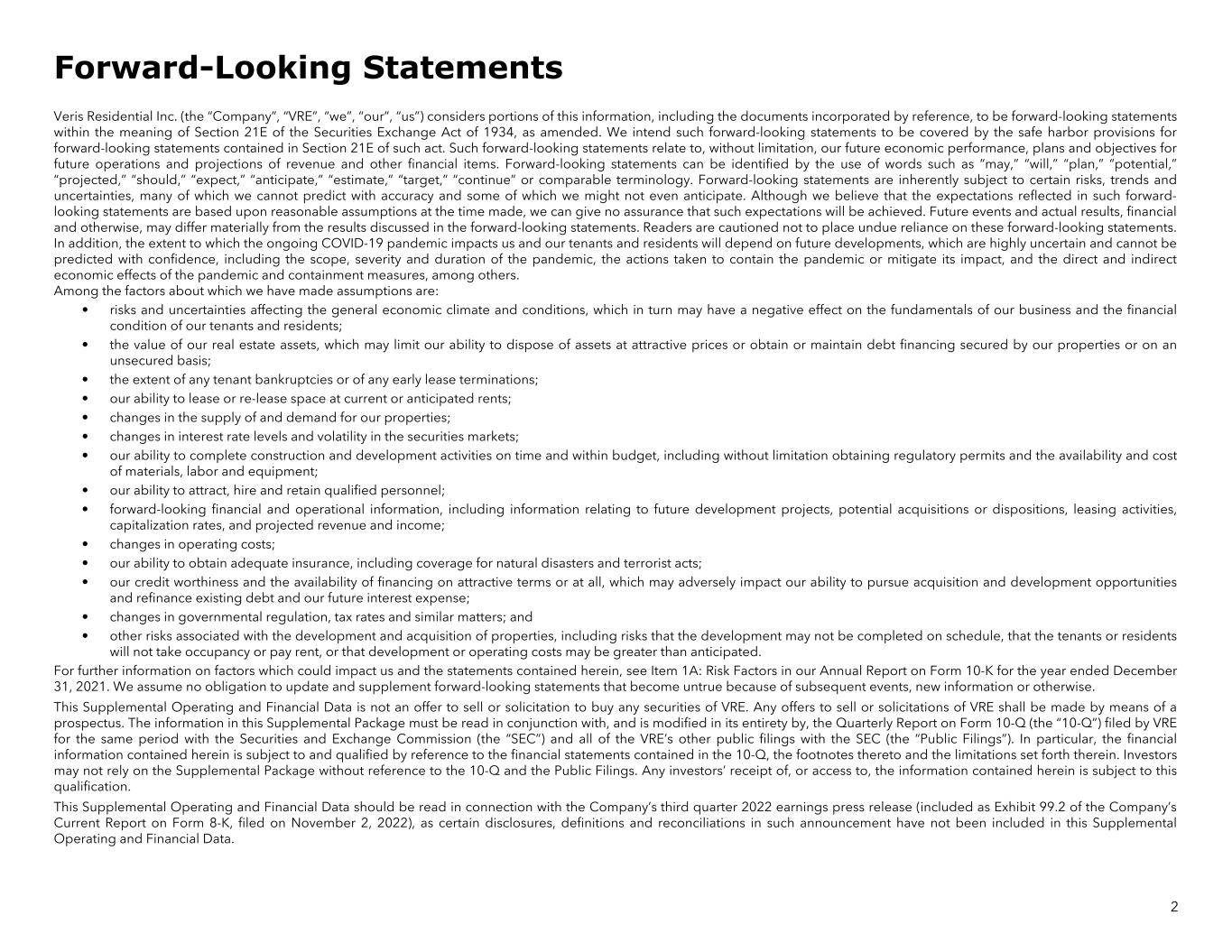 Veris Residential Inc. (the “Company”, “VRE”, “we”, “our”, “us”) considers portions of this information, including the documents incorporated by reference, to be forward-looking statements within the meaning of Section 21E of the Securities Exchange Act of 1934, as amended. We intend such forward-looking statements to be covered by the safe harbor provisions for forward-looking statements contained in Section 21E of such act. Such forward-looking statements relate to, without limitation, our future economic performance, plans and objectives for future operations and projections of revenue and other financial items. Forward-looking statements can be identified by the use of words such as “may,” “will,” “plan,” “potential,” “projected,” “should,” “expect,” “anticipate,” “estimate,” “target,” “continue” or comparable terminology. Forward-looking statements are inherently subject to certain risks, trends and uncertainties, many of which we cannot predict with accuracy and some of which we might not even anticipate. Although we believe that the expectations reflected in such forward- looking statements are based upon reasonable assumptions at the time made, we can give no assurance that such expectations will be achieved. Future events and actual results, financial and otherwise, may differ materially from the results discussed in the forward-looking statements. Readers are cautioned not to place undue reliance on these forward-looking statements. In addition, the extent to which the ongoing COVID-19 pandemic impacts us and our tenants and residents will depend on future developments, which are highly uncertain and cannot be predicted with confidence, including the scope, severity and duration of the pandemic, the actions taken to contain the pandemic or mitigate its impact, and the direct and indirect economic effects of the pandemic and containment measures, among others. Among the factors about which we have made assumptions are: • risks and uncertainties affecting the general economic climate and conditions, which in turn may have a negative effect on the fundamentals of our business and the financial condition of our tenants and residents; • the value of our real estate assets, which may limit our ability to dispose of assets at attractive prices or obtain or maintain debt financing secured by our properties or on an unsecured basis; • the extent of any tenant bankruptcies or of any early lease terminations; • our ability to lease or re-lease space at current or anticipated rents; • changes in the supply of and demand for our properties; • changes in interest rate levels and volatility in the securities markets; • our ability to complete construction and development activities on time and within budget, including without limitation obtaining regulatory permits and the availability and cost of materials, labor and equipment; • our ability to attract, hire and retain qualified personnel; • forward-looking financial and operational information, including information relating to future development projects, potential acquisitions or dispositions, leasing activities, capitalization rates, and projected revenue and income; • changes in operating costs; • our ability to obtain adequate insurance, including coverage for natural disasters and terrorist acts; • our credit worthiness and the availability of financing on attractive terms or at all, which may adversely impact our ability to pursue acquisition and development opportunities and refinance existing debt and our future interest expense; • changes in governmental regulation, tax rates and similar matters; and • other risks associated with the development and acquisition of properties, including risks that the development may not be completed on schedule, that the tenants or residents will not take occupancy or pay rent, or that development or operating costs may be greater than anticipated. For further information on factors which could impact us and the statements contained herein, see Item 1A: Risk Factors in our Annual Report on Form 10-K for the year ended December 31, 2021. We assume no obligation to update and supplement forward-looking statements that become untrue because of subsequent events, new information or otherwise. This Supplemental Operating and Financial Data is not an offer to sell or solicitation to buy any securities of VRE. Any offers to sell or solicitations of VRE shall be made by means of a prospectus. The information in this Supplemental Package must be read in conjunction with, and is modified in its entirety by, the Quarterly Report on Form 10-Q (the “10-Q”) filed by VRE for the same period with the Securities and Exchange Commission (the “SEC”) and all of the VRE’s other public filings with the SEC (the “Public Filings”). In particular, the financial information contained herein is subject to and qualified by reference to the financial statements contained in the 10-Q, the footnotes thereto and the limitations set forth therein. Investors may not rely on the Supplemental Package without reference to the 10-Q and the Public Filings. Any investors’ receipt of, or access to, the information contained herein is subject to this qualification. This Supplemental Operating and Financial Data should be read in connection with the Company’s third quarter 2022 earnings press release (included as Exhibit 99.2 of the Company’s Current Report on Form 8-K, filed on November 2, 2022), as certain disclosures, definitions and reconciliations in such announcement have not been included in this Supplemental Operating and Financial Data. Forward-Looking Statements 2