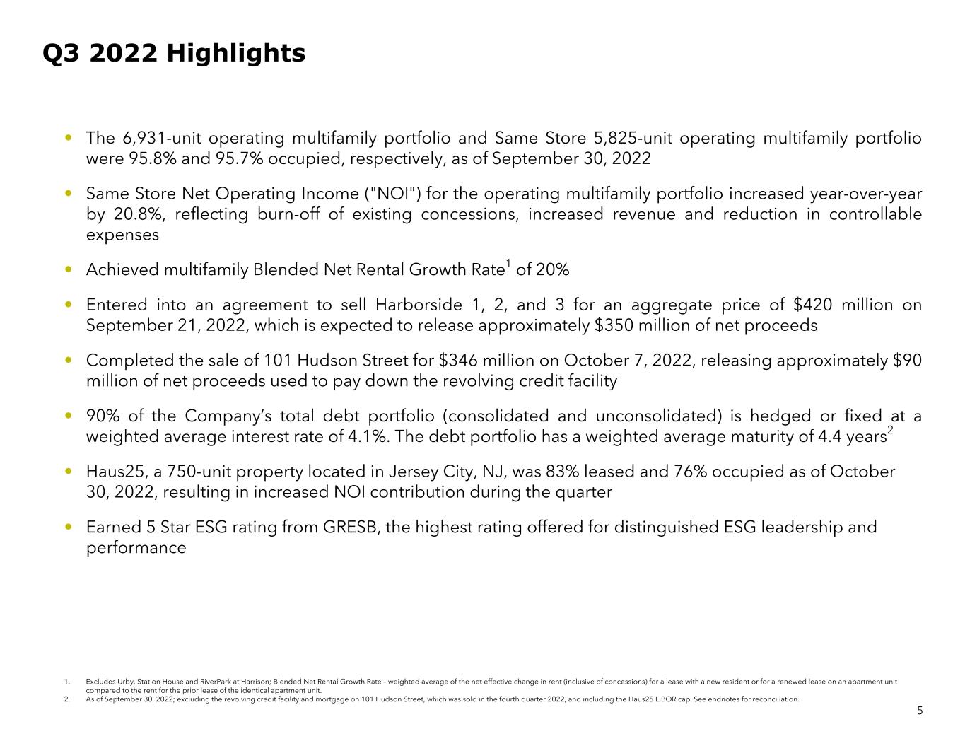5 Q3 2022 Highlights • The 6,931-unit operating multifamily portfolio and Same Store 5,825-unit operating multifamily portfolio were 95.8% and 95.7% occupied, respectively, as of September 30, 2022 • Same Store Net Operating Income ("NOI") for the operating multifamily portfolio increased year-over-year by 20.8%, reflecting burn-off of existing concessions, increased revenue and reduction in controllable expenses • Achieved multifamily Blended Net Rental Growth Rate1 of 20% • Entered into an agreement to sell Harborside 1, 2, and 3 for an aggregate price of $420 million on September 21, 2022, which is expected to release approximately $350 million of net proceeds • Completed the sale of 101 Hudson Street for $346 million on October 7, 2022, releasing approximately $90 million of net proceeds used to pay down the revolving credit facility • 90% of the Company’s total debt portfolio (consolidated and unconsolidated) is hedged or fixed at a weighted average interest rate of 4.1%. The debt portfolio has a weighted average maturity of 4.4 years2 • Haus25, a 750-unit property located in Jersey City, NJ, was 83% leased and 76% occupied as of October 30, 2022, resulting in increased NOI contribution during the quarter • Earned 5 Star ESG rating from GRESB, the highest rating offered for distinguished ESG leadership and performance 1. Excludes Urby, Station House and RiverPark at Harrison; Blended Net Rental Growth Rate – weighted average of the net effective change in rent (inclusive of concessions) for a lease with a new resident or for a renewed lease on an apartment unit compared to the rent for the prior lease of the identical apartment unit. 2. As of September 30, 2022; excluding the revolving credit facility and mortgage on 101 Hudson Street, which was sold in the fourth quarter 2022, and including the Haus25 LIBOR cap. See endnotes for reconciliation.