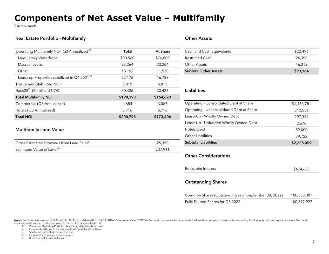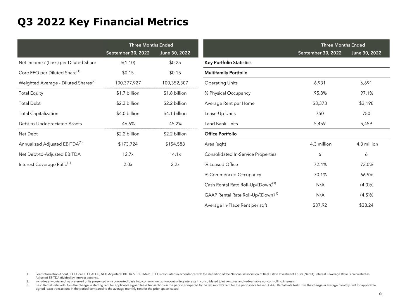 Three Months Ended Three Months Ended September 30, 2022 June 30, 2022 September 30, 2022 June 30, 2022 Net Income / (Loss) per Diluted Share $(1.10) $0.25 Key Portfolio Statistics Core FFO per Diluted Share(1) $0.15 $0.15 Multifamily Portfolio Weighted Average - Diluted Shares(2) 100,377,927 100,352,307 Operating Units 6,931 6,691 Total Equity $1.7 billion $1.8 billion % Physical Occupancy 95.8% 97.1% Total Debt $2.3 billion $2.2 billion Average Rent per Home $3,373 $3,198 Total Capitalization $4.0 billion $4.1 billion Lease-Up Units 750 750 Debt-to-Undepreciated Assets 46.6% 45.2% Land Bank Units 5,459 5,459 Net Debt $2.2 billion $2.2 billion Office Portfolio Annualized Adjusted EBITDA(1) $173,724 $154,588 Area (sqft) 4.3 million 4.3 million Net Debt-to-Adjusted EBITDA 12.7x 14.1x Consolidated In-Service Properties 6 6 Interest Coverage Ratio(1) 2.0x 2.2x % Leased Office 72.4% 73.0% % Commenced Occupancy 70.1% 66.9% Cash Rental Rate Roll-Up/(Down)(3) N/A (4.0)% GAAP Rental Rate Roll-Up/(Down)(3) N/A (4.5)% Average In-Place Rent per sqft $37.92 $38.24 6 Q3 2022 Key Financial Metrics 1. See “Information About FFO, Core FFO, AFFO, NOI, Adjusted EBITDA & EBITDAre”. FFO is calculated in accordance with the definition of the National Association of Real Estate Investment Trusts (Nareit). Interest Coverage Ratio is calculated as Adjusted EBITDA divided by interest expense. 2. Includes any outstanding preferred units presented on a converted basis into common units, noncontrolling interests in consolidated joint ventures and redeemable noncontrolling interests. 3. Cash Rental Rate Roll-Up is the change in starting rent for applicable signed lease transactions in the period compared to the last month’s rent for the prior space leased. GAAP Rental Rate Roll-Up is the change in average monthly rent for applicable signed lease transactions in the period compared to the average monthly rent for the prior space leased.