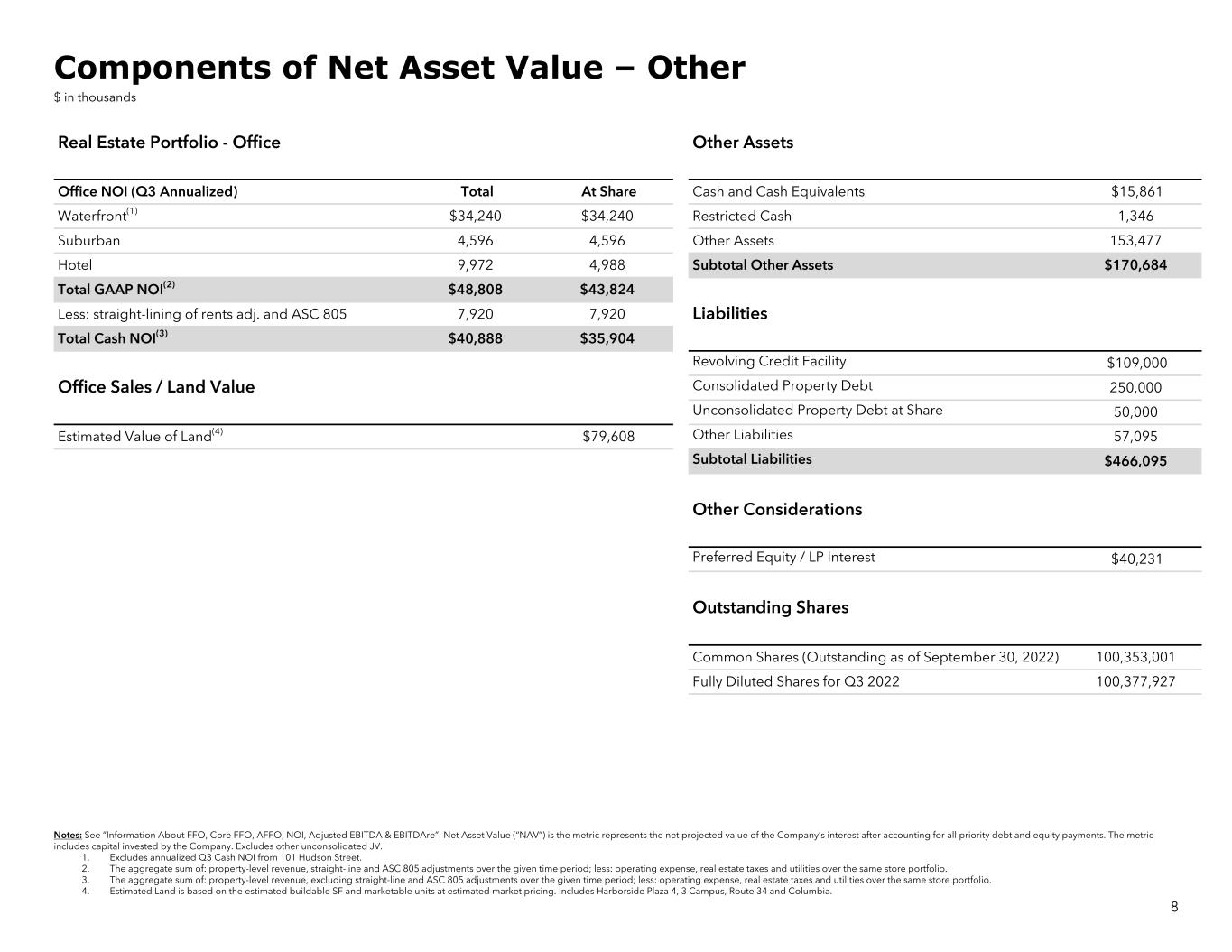Notes: See “Information About FFO, Core FFO, AFFO, NOI, Adjusted EBITDA & EBITDAre”. Net Asset Value (“NAV”) is the metric represents the net projected value of the Company’s interest after accounting for all priority debt and equity payments. The metric includes capital invested by the Company. Excludes other unconsolidated JV. 1. Please see Operating Portfolio – Multifamily details for breakdown. 2. Includes RiverHouse 9, Capstone at Port Imperial and The Upton. 3. See Lease-Up Portfolio details for costs. 4. Includes 2 land parcels under contract. 5. Based on 5,009 potential units. Real Estate Portfolio - Multifamily Other Assets Operating Multifamily NOI (Q3 Annualized)(1) Total At Share Cash and Cash Equivalents $22,496 New Jersey Waterfront $90,560 $76,800 Restricted Cash 24,356 Massachusetts 23,264 23,264 Other Assets 46,312 Other 18,152 11,530 Subtotal Other Assets $93,164 Lease-up Properties stabilized in Q4 2021(2) 22,176 16,788 The James (Stabilized NOI) 5,815 5,815 Haus25(3) (Stabilized NOI) 30,426 30,426 Liabilities Total Multifamily NOI $190,393 $164,623 Commercial (Q3 Annualized) 4,684 3,067 Operating - Consolidated Debt at Share $1,456,781 Hotels (Q3 Annualized) 5,716 5,716 Operating - Unconsolidated Debt at Share 312,556 Total NOI $200,793 $173,406 Lease-Up - Wholly Owned Debt 297,324 Lease-Up - Unfunded Wholly Owned Debt 2,676 Multifamily Land Value Hotels Debt 89,000 Other Liabilities 79,722 Gross Estimated Proceeds from Land Sales(4) 25,350 Subtotal Liabilities $2,238,059 Estimated Value of Land(5) 237,911 Other Considerations Rockpoint Interest $474,683 Outstanding Shares Common Shares (Outstanding as of September 30, 2022) 100,353,001 Fully Diluted Shares for Q3 2022 100,377,927 7 Components of Net Asset Value – Multifamily $ in thousands