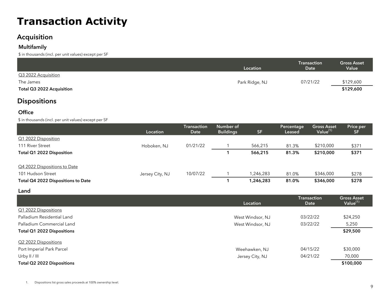 Office $ in thousands (incl. per unit values) except per SF Location Transaction Date Number of Buildings SF Percentage Leased Gross Asset Value(1) Price per SF Q1 2022 Disposition 111 River Street Hoboken, NJ 01/21/22 1 566,215 81.3% $210,000 $371 Total Q1 2022 Disposition 1 566,215 81.3% $210,000 $371 Q4 2022 Dispositions to Date 101 Hudson Street Jersey City, NJ 10/07/22 1 1,246,283 81.0% $346,000 $278 Total Q4 2022 Dispositions to Date 1 1,246,283 81.0% $346,000 $278 Land Location Transaction Date Gross Asset Value(1) Q1 2022 Dispositions Palladium Residential Land West Windsor, NJ 03/22/22 $24,250 Palladium Commercial Land West Windsor, NJ 03/22/22 5,250 Total Q1 2022 Dispositions $29,500 Q2 2022 Dispositions Port Imperial Park Parcel Weehawken, NJ 04/15/22 $30,000 Urby II / III Jersey City, NJ 04/21/22 70,000 Total Q2 2022 Dispositions $100,000 1. Dispositions list gross sales proceeds at 100% ownership level. 9 Transaction Activity Dispositions Multifamily $ in thousands (incl. per unit values) except per SF Location Transaction Date Gross Asset Value Q3 2022 Acquisition The James Park Ridge, NJ 07/21/22 $129,600 Total Q3 2022 Acquisition $129,600 Acquisition