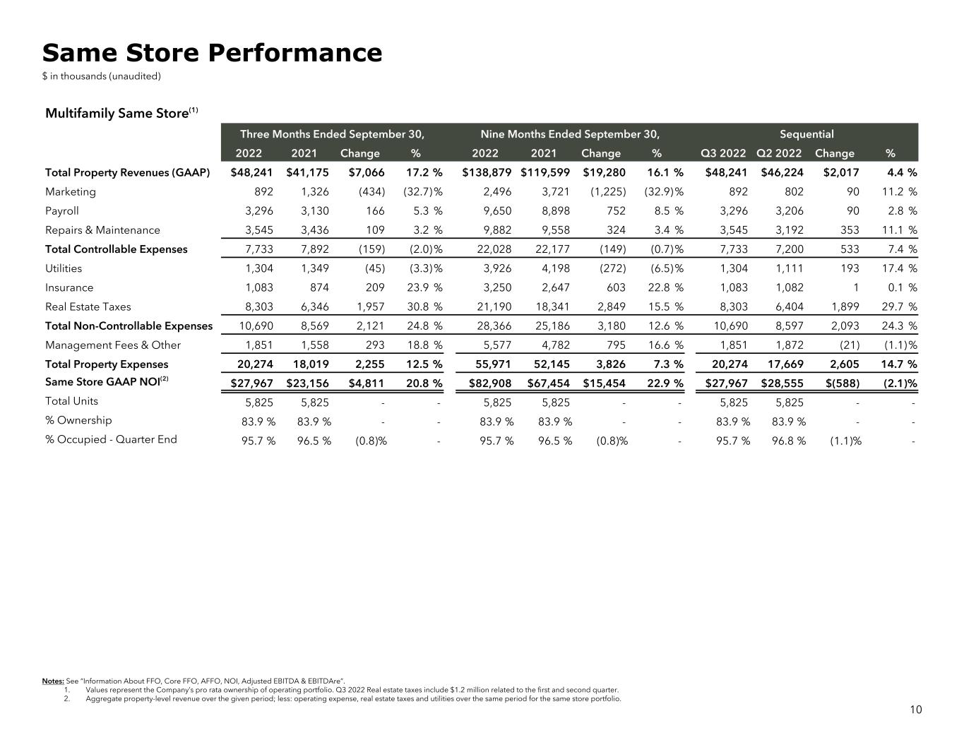 Multifamily Same Store(1) Three Months Ended September 30, Nine Months Ended September 30, Sequential 2022 2021 Change % 2022 2021 Change % Q3 2022 Q2 2022 Change % Total Property Revenues (GAAP) $48,241 $41,175 $7,066 17.2 % $138,879 $119,599 $19,280 16.1 % $48,241 $46,224 $2,017 4.4 % Marketing 892 1,326 (434) (32.7) % 2,496 3,721 (1,225) (32.9) % 892 802 90 11.2 % Payroll 3,296 3,130 166 5.3 % 9,650 8,898 752 8.5 % 3,296 3,206 90 2.8 % Repairs & Maintenance 3,545 3,436 109 3.2 % 9,882 9,558 324 3.4 % 3,545 3,192 353 11.1 % Total Controllable Expenses 7,733 7,892 (159) (2.0) % 22,028 22,177 (149) (0.7) % 7,733 7,200 533 7.4 % Utilities 1,304 1,349 (45) (3.3) % 3,926 4,198 (272) (6.5) % 1,304 1,111 193 17.4 % Insurance 1,083 874 209 23.9 % 3,250 2,647 603 22.8 % 1,083 1,082 1 0.1 % Real Estate Taxes 8,303 6,346 1,957 30.8 % 21,190 18,341 2,849 15.5 % 8,303 6,404 1,899 29.7 % Total Non-Controllable Expenses 10,690 8,569 2,121 24.8 % 28,366 25,186 3,180 12.6 % 10,690 8,597 2,093 24.3 % Management Fees & Other 1,851 1,558 293 18.8 % 5,577 4,782 795 16.6 % 1,851 1,872 (21) (1.1) % Total Property Expenses 20,274 18,019 2,255 12.5 % 55,971 52,145 3,826 7.3 % 20,274 17,669 2,605 14.7 % Same Store GAAP NOI(2) $27,967 $23,156 $4,811 20.8 % $82,908 $67,454 $15,454 22.9 % $27,967 $28,555 $(588) (2.1) % Total Units 5,825 5,825 - - 5,825 5,825 - - 5,825 5,825 - - % Ownership 83.9 % 83.9 % - - 83.9 % 83.9 % - - 83.9 % 83.9 % - - % Occupied - Quarter End 95.7 % 96.5 % (0.8) % - 95.7 % 96.5 % (0.8) % - 95.7 % 96.8 % (1.1) % - Notes: See “Information About FFO, Core FFO, AFFO, NOI, Adjusted EBITDA & EBITDAre”. 1. Values represent the Company’s pro rata ownership of operating portfolio. Q3 2022 Real estate taxes include $1.2 million related to the first and second quarter. 2. Aggregate property-level revenue over the given period; less: operating expense, real estate taxes and utilities over the same period for the same store portfolio. 10 Same Store Performance $ in thousands (unaudited)