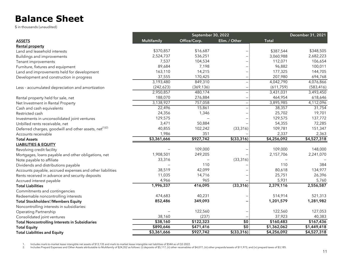 1. Includes mark-to-market lease intangible net assets of $13,135 and mark-to-market lease intangible net liabilities of $544 as of Q3 2022. 2. Includes Prepaid Expenses and Other Assets attributable to Multifamily of $24,352 as follows: (i) deposits of $5,117, (ii) other receivables of $4,077, (iii) other prepaids/assets of $11,973, and (iv) prepaid taxes of $3,185. September 30, 2022 December 31, 2021 ASSETS Multifamily Office/Corp. Elim. / Other Total Rental property Land and leasehold interests $370,857 $16,687 — $387,544 $348,505 Buildings and improvements 2,524,737 536,251 — 3,060,988 2,682,223 Tenant improvements 7,537 104,534 — 112,071 106,654 Furniture, fixtures and equipment 89,684 7,198 — 96,882 100,011 Land and improvements held for development 163,110 14,215 — 177,325 144,705 Development and construction in progress 37,555 170,425 — 207,980 694,768 3,193,480 849,310 — 4,042,790 4,076,866 Less – accumulated depreciation and amortization (242,623) (369,136) — (611,759) (583,416) 2,950,857 480,174 — 3,431,031 3,493,450 Rental property held for sale, net 188,070 276,884 — 464,954 618,646 Net Investment in Rental Property 3,138,927 757,058 — 3,895,985 4,112,096 Cash and cash equivalents 22,496 15,861 — 38,357 31,754 Restricted cash 24,356 1,346 — 25,702 19,701 Investments in unconsolidated joint ventures 129,575 — — 129,575 137,772 Unbilled rents receivable, net 3,471 50,884 — 54,355 72,285 Deferred charges, goodwill and other assets, net(1)(2) 40,855 102,242 (33,316) 109,781 151,347 Accounts receivable 1,986 351 — 2,337 2,363 Total Assets $3,361,666 $927,742 $(33,316) $4,256,092 $4,527,318 LIABILITIES & EQUITY Revolving credit facility — 109,000 — 109,000 148,000 Mortgages, loans payable and other obligations, net 1,908,501 249,205 — 2,157,706 2,241,070 Note payable to affiliate 33,316 — (33,316) — — Dividends and distributions payable — 110 — 110 384 Accounts payable, accrued expenses and other liabilities 38,519 42,099 — 80,618 134,977 Rents received in advance and security deposits 11,035 14,716 — 25,751 26,396 Accrued interest payable 4,966 965 — 5,931 5,760 Total Liabilities 1,996,337 416,095 (33,316) 2,379,116 2,556,587 Commitments and contingencies Redeemable noncontrolling interests 474,683 40,231 — 514,914 521,313 Total Stockholders’/Members Equity 852,486 349,093 — 1,201,579 1,281,982 Noncontrolling interests in subsidiaries: Operating Partnership — 122,560 — 122,560 127,053 Consolidated joint ventures 38,160 (237) — 37,923 40,383 Total Noncontrolling Interests in Subsidiaries $38,160 $122,323 $0 $160,483 $167,436 Total Equity $890,646 $471,416 $0 $1,362,062 $1,449,418 Total Liabilities and Equity $3,361,666 $927,742 $(33,316) $4,256,092 $4,527,318 11 Balance Sheet $ in thousands (unaudited)