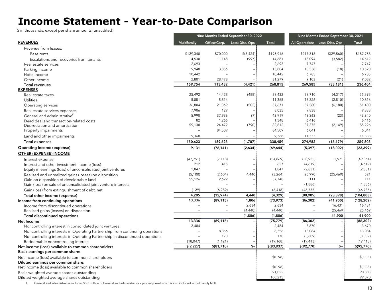 Q3 2022 Q3 2021 REVENUES Multifamily Office/Corp. Less: Disc. Ops Total Revenue from leases: Base rents $48,434 $24,981 $(1,141) $72,274 $64,866 Escalations and recoveries from tenants 1,978 3,781 (268) 5,491 5,817 Real estate services 886 — — 886 2,628 Parking income 3,498 1,375 — 4,873 3,950 Hotel income 4,489 — — 4,489 3,018 Other income 1,077 2,266 — 3,343 1,905 Total revenues 60,362 32,403 (1,409) 91,356 82,184 EXPENSES Real estate taxes 10,077 4,923 (100) 14,900 11,764 Utilities 2,199 1,756 — 3,955 3,573 Operating services 13,381 7,344 (160) 20,565 17,135 Real estate services expenses 2,704 48 — 2,752 3,307 General and administrative(1) 2,755 10,112 (4) 12,863 11,288 Dead deal and transaction-related costs — 3 — 3 3,671 Depreciation and amortization 21,578 7,481 (99) 28,960 28,950 Property impairments — 84,509 — 84,509 — Land and other impairments 2,536 — — 2,536 3,401 Total expenses 55,230 116,176 (363) 171,043 83,089 Operating Income (expense) 5,132 (83,773) (1,046) (79,687) (905) OTHER (EXPENSE) INCOME Interest expense (19,866) (2,271) — (22,137) (15,200) Interest and other investment income (loss) 152 128 — 280 (4,731) Equity in earnings (loss) of unconsolidated joint ventures (304) — — (304) (1,724) Realized and unrealized gains (losses) on disposition (5,100) — — (5,100) (3,000) Gain (loss) on sale of unconsolidated joint venture interests — — — — (1,886) Total other income (expense) (25,118) (2,143) — (27,261) (26,541) Income from continuing operations (19,986) (85,916) (1,046) (106,948) (27,446) Income from discontinued operations — — 1,046 1,046 1,045 Realized gains (losses) on disposition — — — — 609 Total discontinued operations — — 1,046 1,046 1,654 Net Income (19,986) (85,916) — (105,902) (25,792) Noncontrolling interest in consolidated joint ventures 726 — — 726 1,137 Noncontrolling interests in Operating Partnership from continuing operations — 10,420 — 10,420 2,962 Noncontrolling interests in Operating Partnership in discontinued operations — (97) — (97) (150) Redeemable noncontrolling interest (6,016) (349) — (6,365) (6,471) Net income (loss) available to common shareholders $(25,276) $(75,942) $— $(101,218) $(28,314) Basic earnings per common share: Net income (loss) available to common shareholders $(1.10) $(0.33) Diluted earnings per common share: Net income (loss) available to common shareholders $(1.10) $(0.33) Basic weighted average shares outstanding 91,087 90,941 Diluted weighted average shares outstanding 100,378 99,975 1. General and administrative includes $1.4 million of General and administrative – property level which is also included in multifamily NOI. 12 Income Statement - Quarterly Comparison $ in thousands, except per share amounts (unaudited)