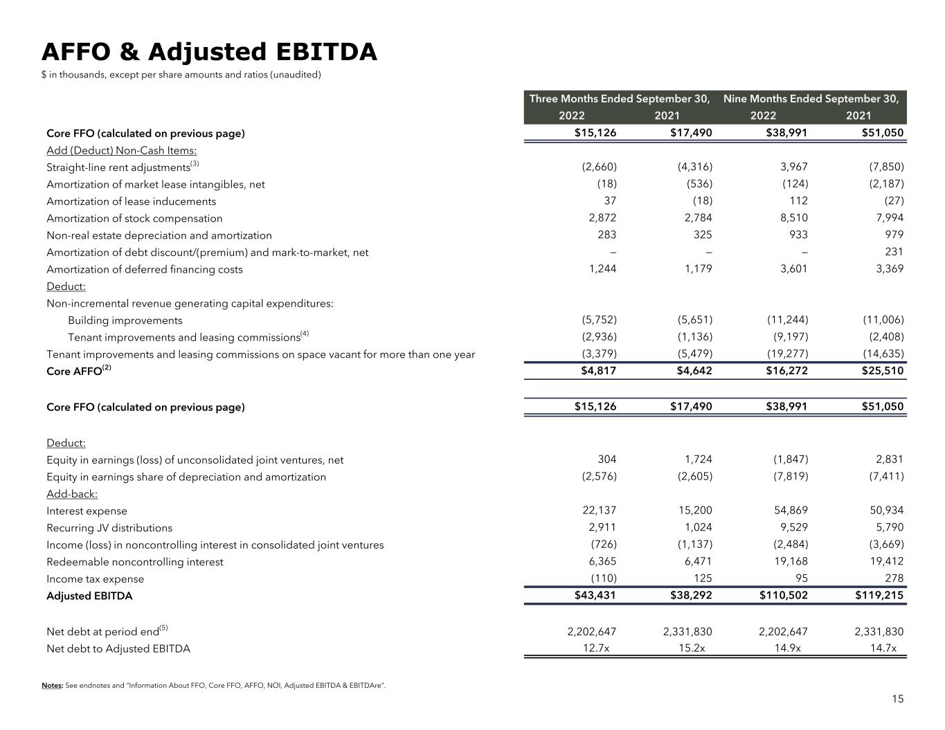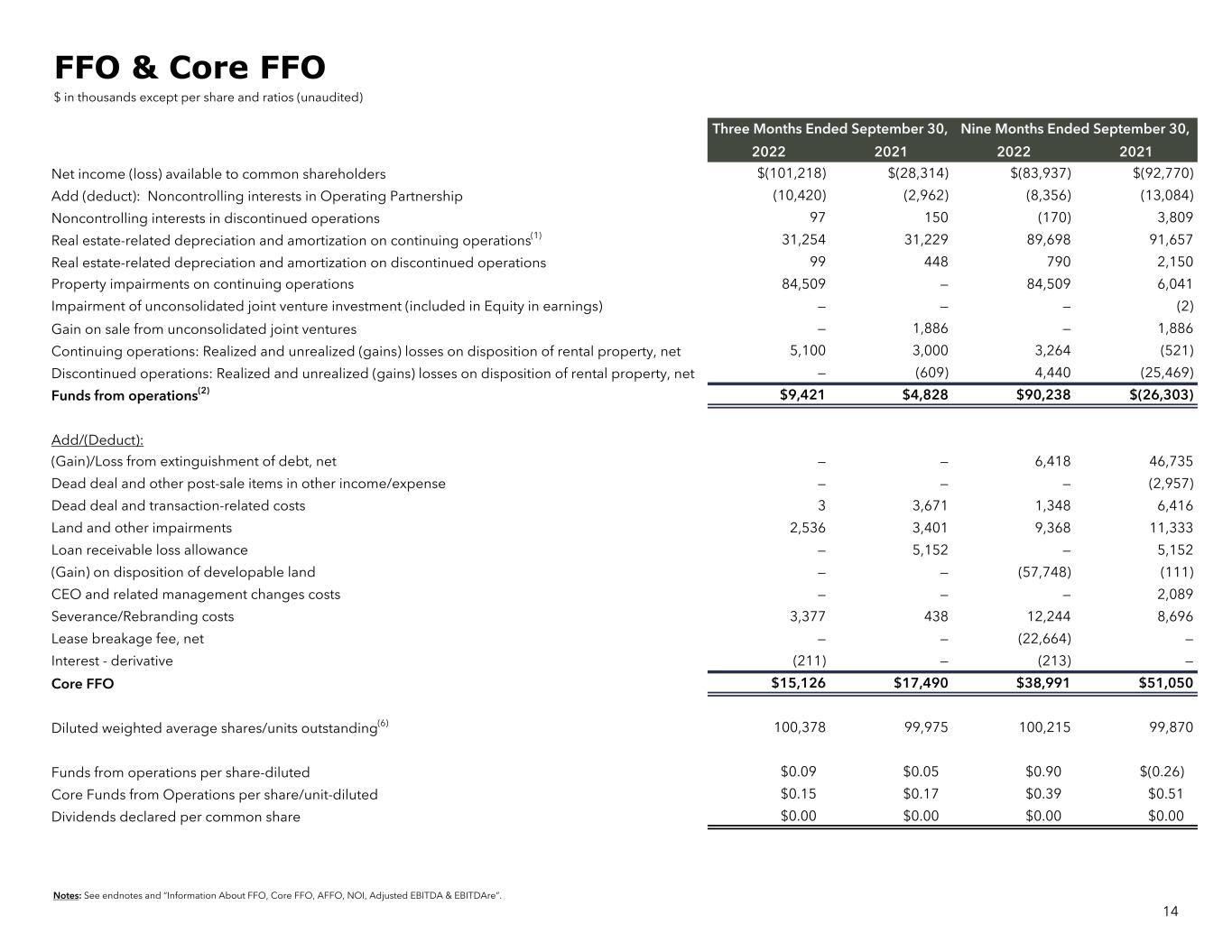 Notes: See endnotes and “Information About FFO, Core FFO, AFFO, NOI, Adjusted EBITDA & EBITDAre”. Three Months Ended September 30, Nine Months Ended September 30, 2022 2021 2022 2021 Net income (loss) available to common shareholders $(101,218) $(28,314) $(83,937) $(92,770) Add (deduct): Noncontrolling interests in Operating Partnership (10,420) (2,962) (8,356) (13,084) Noncontrolling interests in discontinued operations 97 150 (170) 3,809 Real estate-related depreciation and amortization on continuing operations(1) 31,254 31,229 89,698 91,657 Real estate-related depreciation and amortization on discontinued operations 99 448 790 2,150 Property impairments on continuing operations 84,509 — 84,509 6,041 Impairment of unconsolidated joint venture investment (included in Equity in earnings) — — — (2) Gain on sale from unconsolidated joint ventures — 1,886 — 1,886 Continuing operations: Realized and unrealized (gains) losses on disposition of rental property, net 5,100 3,000 3,264 (521) Discontinued operations: Realized and unrealized (gains) losses on disposition of rental property, net — (609) 4,440 (25,469) Funds from operations(2) $9,421 $4,828 $90,238 $(26,303) Add/(Deduct): (Gain)/Loss from extinguishment of debt, net — — 6,418 46,735 Dead deal and other post-sale items in other income/expense — — — (2,957) Dead deal and transaction-related costs 3 3,671 1,348 6,416 Land and other impairments 2,536 3,401 9,368 11,333 Loan receivable loss allowance — 5,152 — 5,152 (Gain) on disposition of developable land — — (57,748) (111) CEO and related management changes costs — — — 2,089 Severance/Rebranding costs 3,377 438 12,244 8,696 Lease breakage fee, net — — (22,664) — Interest - derivative (211) — (213) — Core FFO $15,126 $17,490 $38,991 $51,050 Diluted weighted average shares/units outstanding(6) 100,378 99,975 100,215 99,870 Funds from operations per share-diluted $0.09 $0.05 $0.90 $(0.26) Core Funds from Operations per share/unit-diluted $0.15 $0.17 $0.39 $0.51 Dividends declared per common share $0.00 $0.00 $0.00 $0.00 FFO & Core FFO $ in thousands except per share and ratios (unaudited) 14