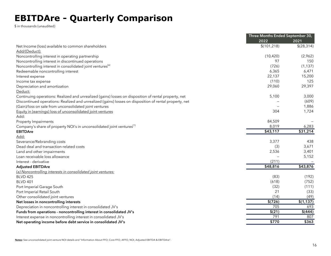 Notes: See endnotes and “Information About FFO, Core FFO, AFFO, NOI, Adjusted EBITDA & EBITDAre”. 15 Three Months Ended September 30, Nine Months Ended September 30, 2022 2021 2022 2021 Core FFO (calculated on previous page) $15,126 $17,490 $38,991 $51,050 Add (Deduct) Non-Cash Items: Straight-line rent adjustments(3) (2,660) (4,316) 3,967 (7,850) Amortization of market lease intangibles, net (18) (536) (124) (2,187) Amortization of lease inducements 37 (18) 112 (27) Amortization of stock compensation 2,872 2,784 8,510 7,994 Non-real estate depreciation and amortization 283 325 933 979 Amortization of debt discount/(premium) and mark-to-market, net — — — 231 Amortization of deferred financing costs 1,244 1,179 3,601 3,369 Deduct: Non-incremental revenue generating capital expenditures: Building improvements (5,752) (5,651) (11,244) (11,006) Tenant improvements and leasing commissions(4) (2,936) (1,136) (9,197) (2,408) Tenant improvements and leasing commissions on space vacant for more than one year (3,379) (5,479) (19,277) (14,635) Core AFFO(2) $4,817 $4,642 $16,272 $25,510 Core FFO (calculated on previous page) $15,126 $17,490 $38,991 $51,050 Deduct: Equity in earnings (loss) of unconsolidated joint ventures, net 304 1,724 (1,847) 2,831 Equity in earnings share of depreciation and amortization (2,576) (2,605) (7,819) (7,411) Add-back: Interest expense 22,137 15,200 54,869 50,934 Recurring JV distributions 2,911 1,024 9,529 5,790 Income (loss) in noncontrolling interest in consolidated joint ventures (726) (1,137) (2,484) (3,669) Redeemable noncontrolling interest 6,365 6,471 19,168 19,412 Income tax expense (110) 125 95 278 Adjusted EBITDA $43,431 $38,292 $110,502 $119,215 Net debt at period end(5) 2,202,647 2,331,830 2,202,647 2,331,830 Net debt to Adjusted EBITDA 12.7x 15.2x 14.9x 14.7x AFFO & Adjusted EBITDA $ in thousands, except per share amounts and ratios (unaudited)