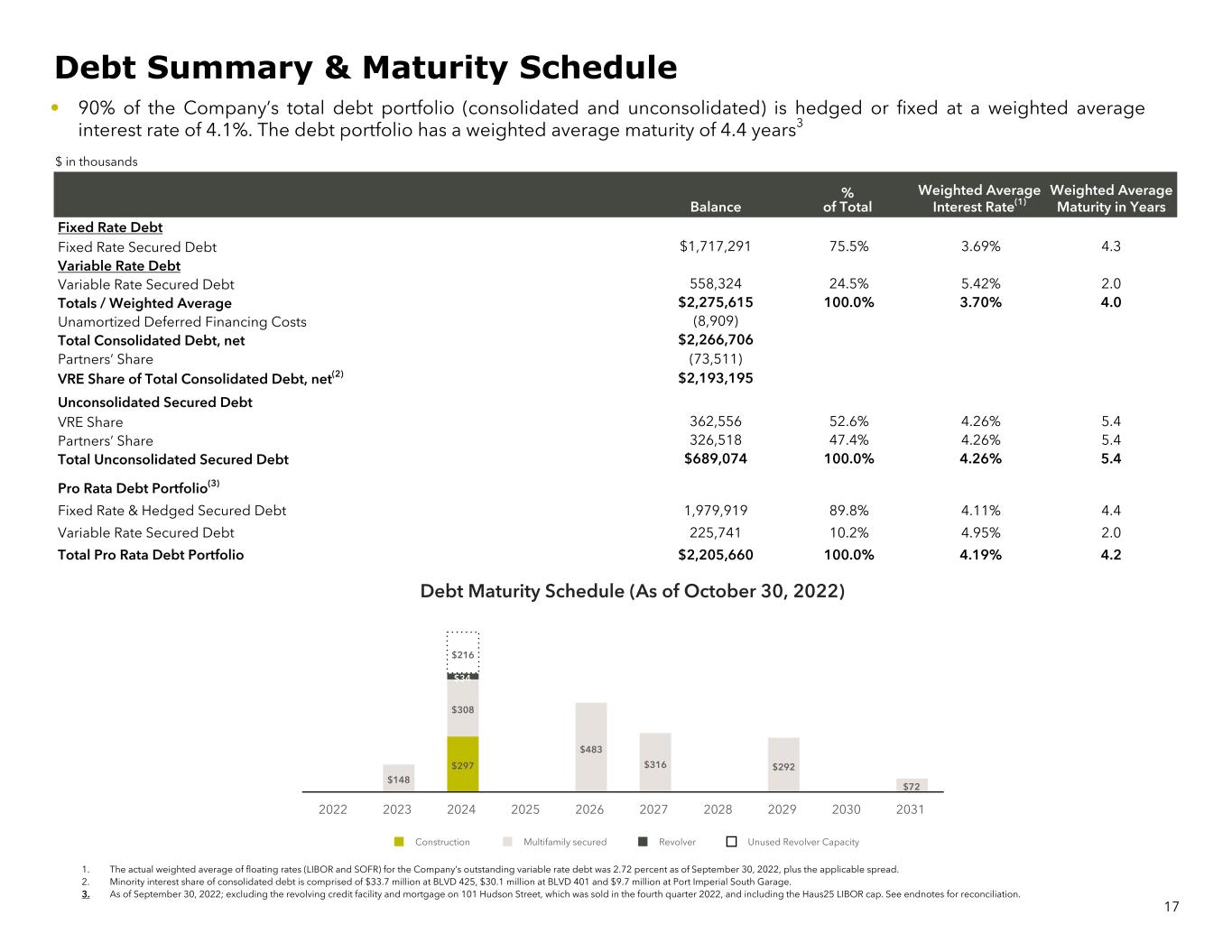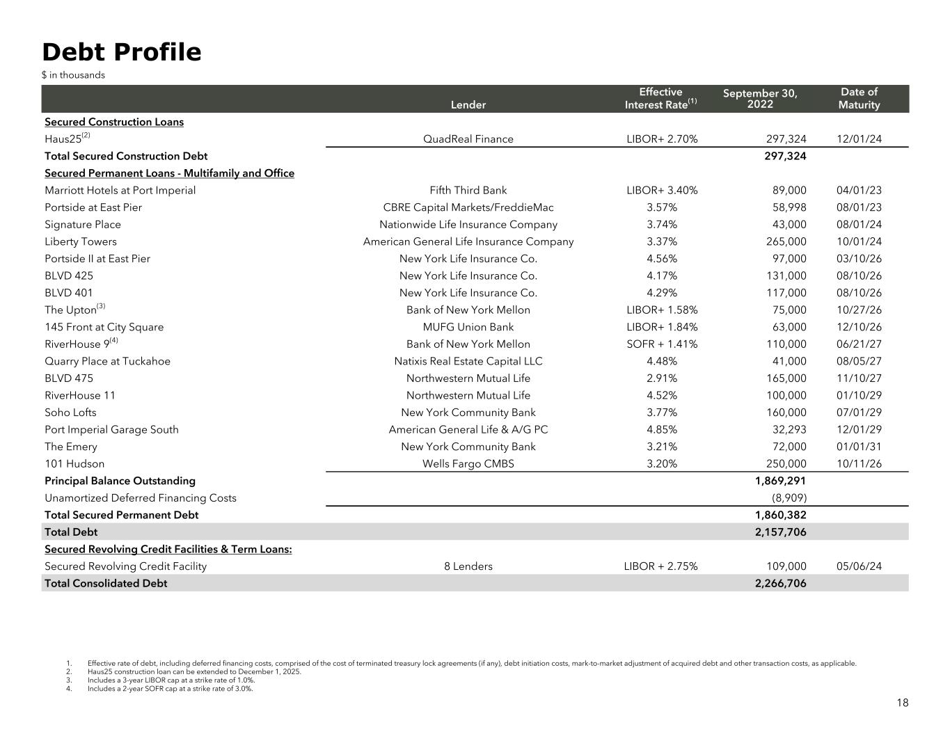 • 90% of the Company’s total debt portfolio (consolidated and unconsolidated) is hedged or fixed at a weighted average interest rate of 4.1%. The debt portfolio has a weighted average maturity of 4.4 years3 $ in thousands Debt Maturity Schedule (As of October 30, 2022) $297 $148 $308 $483 $316 $292 $72 $34 $216 Construction Multifamily secured Revolver Unused Revolver Capacity 2022 2023 2024 2025 2026 2027 2028 2029 2030 2031 17 Balance % of Total Weighted Average Interest Rate(1) Weighted Average Maturity in Years Fixed Rate Debt Fixed Rate Secured Debt $1,717,291 75.5% 3.69% 4.3 Variable Rate Debt Variable Rate Secured Debt 558,324 24.5% 5.42% 2.0 Totals / Weighted Average $2,275,615 100.0% 3.70% 4.0 Unamortized Deferred Financing Costs (8,909) Total Consolidated Debt, net $2,266,706 Partners’ Share (73,511) VRE Share of Total Consolidated Debt, net(2) $2,193,195 Unconsolidated Secured Debt VRE Share 362,556 52.6% 4.26% 5.4 Partners’ Share 326,518 47.4% 4.26% 5.4 Total Unconsolidated Secured Debt $689,074 100.0% 4.26% 5.4 Pro Rata Debt Portfolio(3) Fixed Rate & Hedged Secured Debt 1,979,919 89.8% 4.11% 4.4 Variable Rate Secured Debt 225,741 10.2% 4.95% 2.0 Total Pro Rata Debt Portfolio $2,205,660 100.0% 4.19% 4.2 Debt Summary & Maturity Schedule 1. The actual weighted average of floating rates (LIBOR and SOFR) for the Company’s outstanding variable rate debt was 2.72 percent as of September 30, 2022, plus the applicable spread. 2. Minority interest share of consolidated debt is comprised of $33.7 million at BLVD 425, $30.1 million at BLVD 401 and $9.7 million at Port Imperial South Garage. 3. As of September 30, 2022; excluding the revolving credit facility and mortgage on 101 Hudson Street, which was sold in the fourth quarter 2022, and including the Haus25 LIBOR cap. See endnotes for reconciliation.