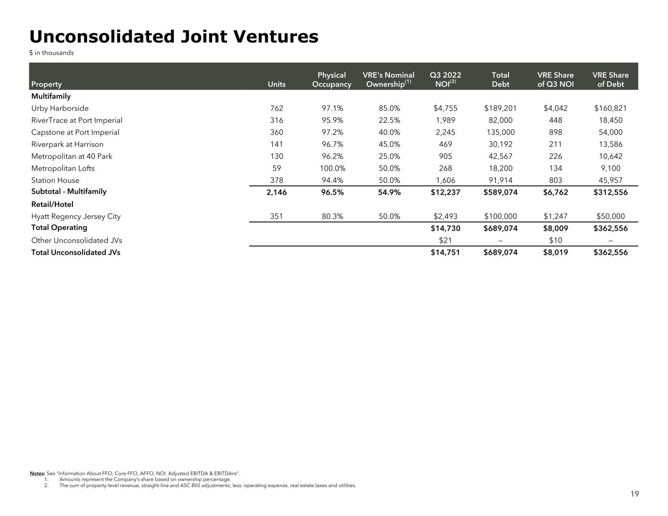 Property Units Physical Occupancy VRE's Nominal Ownership(1) Q3 2022 NOI(2) Total Debt VRE Share of Q3 NOI VRE Share of Debt Multifamily Urby Harborside 762 97.1% 85.0% $4,755 $189,201 $4,042 $160,821 RiverTrace at Port Imperial 316 95.9% 22.5% 1,989 82,000 448 18,450 Capstone at Port Imperial 360 97.2% 40.0% 2,245 135,000 898 54,000 Riverpark at Harrison 141 96.7% 45.0% 469 30,192 211 13,586 Metropolitan at 40 Park 130 96.2% 25.0% 905 42,567 226 10,642 Metropolitan Lofts 59 100.0% 50.0% 268 18,200 134 9,100 Station House 378 94.4% 50.0% 1,606 91,914 803 45,957 Subtotal - Multifamily 2,146 96.5% 54.9% $12,237 $589,074 $6,762 $312,556 Retail/Hotel Hyatt Regency Jersey City 351 80.3% 50.0% $2,493 $100,000 $1,247 $50,000 Total Operating $14,730 $689,074 $8,009 $362,556 Other Unconsolidated JVs $21 — $10 — Total Unconsolidated JVs $14,751 $689,074 $8,019 $362,556 Notes: See “Information About FFO, Core FFO, AFFO, NOI, Adjusted EBITDA & EBITDAre”. 1. Amounts represent the Company’s share based on ownership percentage. 2. The sum of property-level revenue, straight-line and ASC 805 adjustments; less: operating expense, real estate taxes and utilities. 19 Unconsolidated Joint Ventures $ in thousands