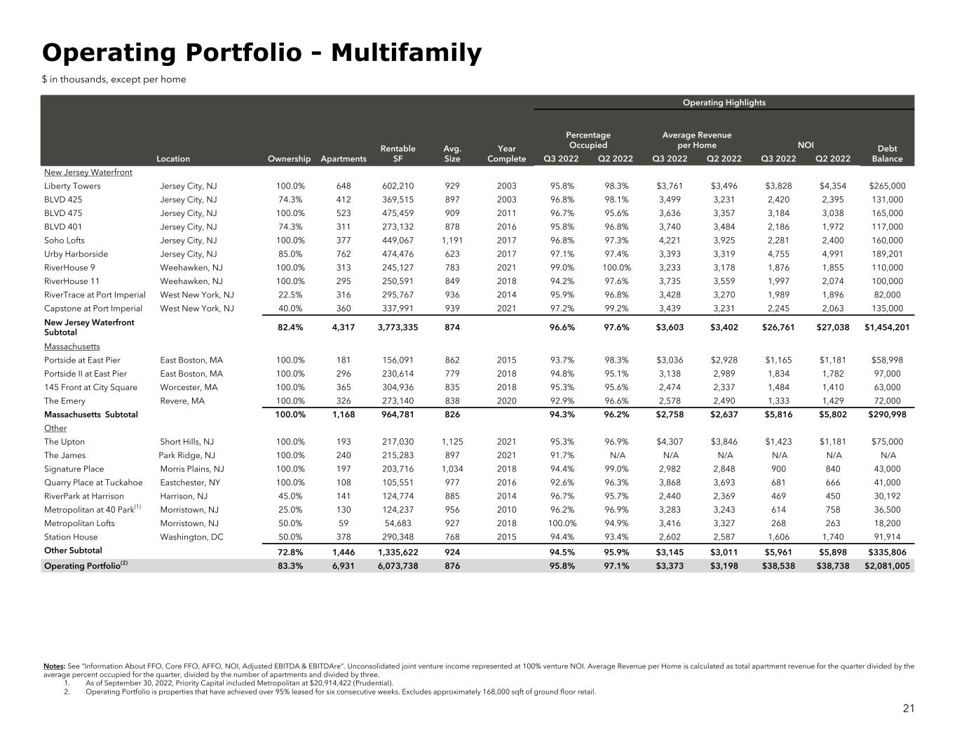 Operating Highlights Rentable SF Avg. Size Year Complete Percentage Occupied Average Revenue per Home NOI Debt BalanceLocation Ownership Apartments Q3 2022 Q2 2022 Q3 2022 Q2 2022 Q3 2022 Q2 2022 New Jersey Waterfront Liberty Towers Jersey City, NJ 100.0% 648 602,210 929 2003 95.8% 98.3% $3,761 $3,496 $3,828 $4,354 $265,000 BLVD 425 Jersey City, NJ 74.3% 412 369,515 897 2003 96.8% 98.1% 3,499 3,231 2,420 2,395 131,000 BLVD 475 Jersey City, NJ 100.0% 523 475,459 909 2011 96.7% 95.6% 3,636 3,357 3,184 3,038 165,000 BLVD 401 Jersey City, NJ 74.3% 311 273,132 878 2016 95.8% 96.8% 3,740 3,484 2,186 1,972 117,000 Soho Lofts Jersey City, NJ 100.0% 377 449,067 1,191 2017 96.8% 97.3% 4,221 3,925 2,281 2,400 160,000 Urby Harborside Jersey City, NJ 85.0% 762 474,476 623 2017 97.1% 97.4% 3,393 3,319 4,755 4,991 189,201 RiverHouse 9 Weehawken, NJ 100.0% 313 245,127 783 2021 99.0% 100.0% 3,233 3,178 1,876 1,855 110,000 RiverHouse 11 Weehawken, NJ 100.0% 295 250,591 849 2018 94.2% 97.6% 3,735 3,559 1,997 2,074 100,000 RiverTrace at Port Imperial West New York, NJ 22.5% 316 295,767 936 2014 95.9% 96.8% 3,428 3,270 1,989 1,896 82,000 Capstone at Port Imperial West New York, NJ 40.0% 360 337,991 939 2021 97.2% 99.2% 3,439 3,231 2,245 2,063 135,000 New Jersey Waterfront Subtotal 82.4% 4,317 3,773,335 874 96.6% 97.6% $3,603 $3,402 $26,761 $27,038 $1,454,201 Massachusetts Portside at East Pier East Boston, MA 100.0% 181 156,091 862 2015 93.7% 98.3% $3,036 $2,928 $1,165 $1,181 $58,998 Portside II at East Pier East Boston, MA 100.0% 296 230,614 779 2018 94.8% 95.1% 3,138 2,989 1,834 1,782 97,000 145 Front at City Square Worcester, MA 100.0% 365 304,936 835 2018 95.3% 95.6% 2,474 2,337 1,484 1,410 63,000 The Emery Revere, MA 100.0% 326 273,140 838 2020 92.9% 96.6% 2,578 2,490 1,333 1,429 72,000 Massachusetts Subtotal 100.0% 1,168 964,781 826 94.3% 96.2% $2,758 $2,637 $5,816 $5,802 $290,998 Other The Upton Short Hills, NJ 100.0% 193 217,030 1,125 2021 95.3% 96.9% $4,307 $3,846 $1,423 $1,181 $75,000 The James Park Ridge, NJ 100.0% 240 215,283 897 2021 91.7% N/A N/A N/A N/A N/A N/A Signature Place Morris Plains, NJ 100.0% 197 203,716 1,034 2018 94.4% 99.0% 2,982 2,848 900 840 43,000 Quarry Place at Tuckahoe Eastchester, NY 100.0% 108 105,551 977 2016 92.6% 96.3% 3,868 3,693 681 666 41,000 RiverPark at Harrison Harrison, NJ 45.0% 141 124,774 885 2014 96.7% 95.7% 2,440 2,369 469 450 30,192 Metropolitan at 40 Park(1) Morristown, NJ 25.0% 130 124,237 956 2010 96.2% 96.9% 3,283 3,243 614 758 36,500 Metropolitan Lofts Morristown, NJ 50.0% 59 54,683 927 2018 100.0% 94.9% 3,416 3,327 268 263 18,200 Station House Washington, DC 50.0% 378 290,348 768 2015 94.4% 93.4% 2,602 2,587 1,606 1,740 91,914 Other Subtotal 72.8% 1,446 1,335,622 924 94.5% 95.9% $3,145 $3,011 $5,961 $5,898 $335,806 Operating Portfolio(2) 83.3% 6,931 6,073,738 876 95.8% 97.1% $3,373 $3,198 $38,538 $38,738 $2,081,005 Notes: See “Information About FFO, Core FFO, AFFO, NOI, Adjusted EBITDA & EBITDAre”. Unconsolidated joint venture income represented at 100% venture NOI. Average Revenue per Home is calculated as total apartment revenue for the quarter divided by the average percent occupied for the quarter, divided by the number of apartments and divided by three. 1. As of September 30, 2022, Priority Capital included Metropolitan at $20,914,422 (Prudential). 2. Operating Portfolio is properties that have achieved over 95% leased for six consecutive weeks. Excludes approximately 168,000 sqft of ground floor retail. 21 Operating Portfolio - Multifamily $ in thousands, except per home