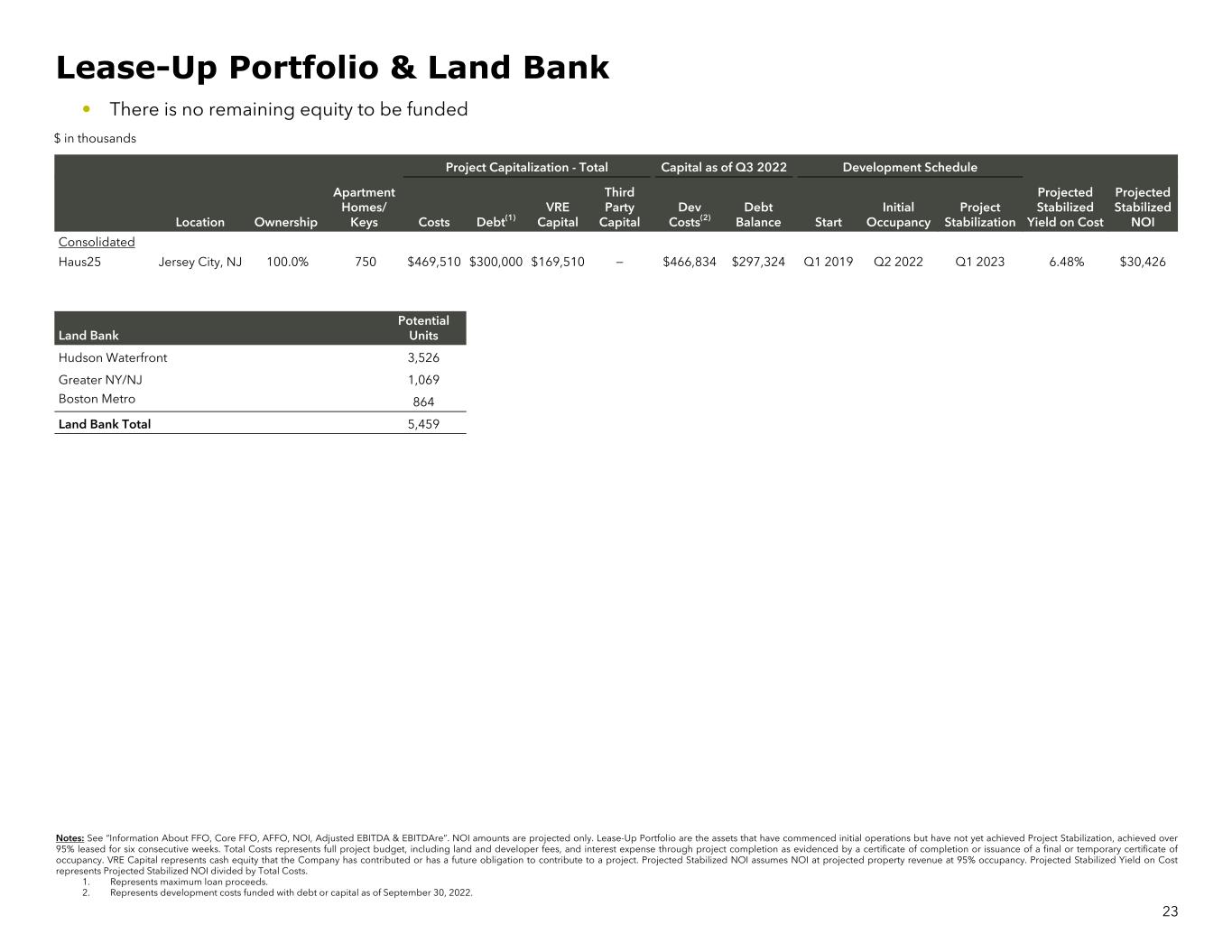 Project Capitalization - Total Capital as of Q3 2022 Development Schedule Location Ownership Apartment Homes/ Keys Costs Debt(1) VRE Capital Third Party Capital Dev Costs(2) Debt Balance Start Initial Occupancy Project Stabilization Projected Stabilized Yield on Cost Projected Stabilized NOI Consolidated Haus25 Jersey City, NJ 100.0% 750 $469,510 $300,000 $169,510 — $466,834 $297,324 Q1 2019 Q2 2022 Q1 2023 6.48% $30,426 Land Bank Potential Units Hudson Waterfront 3,526 Greater NY/NJ 1,069 Boston Metro 864 Land Bank Total 5,459 23 Notes: See “Information About FFO, Core FFO, AFFO, NOI, Adjusted EBITDA & EBITDAre”. NOI amounts are projected only. Lease-Up Portfolio are the assets that have commenced initial operations but have not yet achieved Project Stabilization, achieved over 95% leased for six consecutive weeks. Total Costs represents full project budget, including land and developer fees, and interest expense through project completion as evidenced by a certificate of completion or issuance of a final or temporary certificate of occupancy. VRE Capital represents cash equity that the Company has contributed or has a future obligation to contribute to a project. Projected Stabilized NOI assumes NOI at projected property revenue at 95% occupancy. Projected Stabilized Yield on Cost represents Projected Stabilized NOI divided by Total Costs. 1. Represents maximum loan proceeds. 2. Represents development costs funded with debt or capital as of September 30, 2022. Lease-Up Portfolio & Land Bank • There is no remaining equity to be funded $ in thousands