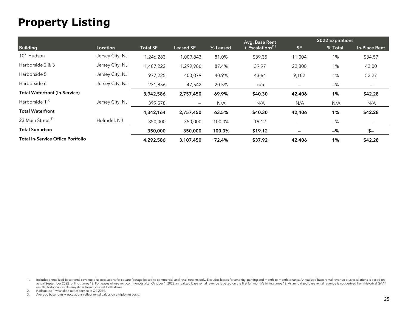 1. Includes annualized base rental revenue plus escalations for square footage leased to commercial and retail tenants only. Excludes leases for amenity, parking and month-to-month tenants. Annualized base rental revenue plus escalations is based on actual September 2022 billings times 12. For leases whose rent commences after October 1, 2022 annualized base rental revenue is based on the first full month’s billing times 12. As annualized base rental revenue is not derived from historical GAAP results, historical results may differ from those set forth above. 2. Harborside 1 was taken out of service in Q4 2019. 3. Average base rents + escalations reflect rental values on a triple net basis. Avg. Base Rent + Escalations(1) 2022 Expirations Building Location Total SF Leased SF % Leased SF % Total In-Place Rent 101 Hudson Jersey City, NJ 1,246,283 1,009,843 81.0% $39.35 11,004 1% $34.57 Harborside 2 & 3 Jersey City, NJ 1,487,222 1,299,986 87.4% 39.97 22,300 1% 42.00 Harborside 5 Jersey City, NJ 977,225 400,079 40.9% 43.64 9,102 1% 52.27 Harborside 6 Jersey City, NJ 231,856 47,542 20.5% n/a — —% — Total Waterfront (In-Service) 3,942,586 2,757,450 69.9% $40.30 42,406 1% $42.28 Harborside 1(2) Jersey City, NJ 399,578 — N/A N/A N/A N/A N/A Total Waterfront 4,342,164 2,757,450 63.5% $40.30 42,406 1% $42.28 23 Main Street(3) Holmdel, NJ 350,000 350,000 100.0% 19.12 — —% — Total Suburban 350,000 350,000 100.0% $19.12 — —% $— Total In-Service Office Portfolio 4,292,586 3,107,450 72.4% $37.92 42,406 1% $42.28 25 Property Listing
