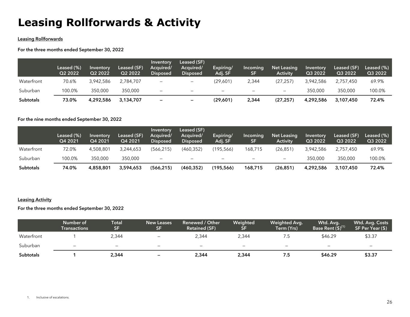 1. Inclusive of escalations. Leasing Rollforwards For the three months ended September 30, 2022 Leased (%) Q2 2022 Inventory Q2 2022 Leased (SF) Q2 2022 Inventory Acquired/ Disposed Leased (SF) Acquired/ Disposed Expiring/ Adj. SF Incoming SF Net Leasing Activity Inventory Q3 2022 Leased (SF) Q3 2022 Leased (%) Q3 2022 Waterfront 70.6% 3,942,586 2,784,707 — — (29,601) 2,344 (27,257) 3,942,586 2,757,450 69.9% Suburban 100.0% 350,000 350,000 — — — — — 350,000 350,000 100.0% Subtotals 73.0% 4,292,586 3,134,707 — — (29,601) 2,344 (27,257) 4,292,586 3,107,450 72.4% Leasing Activity For the three months ended September 30, 2022 Number of Transactions Total SF New Leases SF Renewed / Other Retained (SF) Weighted SF Weighted Avg. Term (Yrs) Wtd. Avg. Base Rent ($)(1) Wtd. Avg. Costs SF Per Year ($) Waterfront 1 2,344 — 2,344 2,344 7.5 $46.29 $3.37 Suburban — — — — — — — — Subtotals 1 2,344 — 2,344 2,344 7.5 $46.29 $3.37 26 Leasing Rollforwards & Activity For the nine months ended September 30, 2022 Leased (%) Q4 2021 Inventory Q4 2021 Leased (SF) Q4 2021 Inventory Acquired/ Disposed Leased (SF) Acquired/ Disposed Expiring/ Adj. SF Incoming SF Net Leasing Activity Inventory Q3 2022 Leased (SF) Q3 2022 Leased (%) Q3 2022 Waterfront 72.0% 4,508,801 3,244,653 (566,215) (460,352) (195,566) 168,715 (26,851) 3,942,586 2,757,450 69.9% Suburban 100.0% 350,000 350,000 — — — — — 350,000 350,000 100.0% Subtotals 74.0% 4,858,801 3,594,653 (566,215) (460,352) (195,566) 168,715 (26,851) 4,292,586 3,107,450 72.4%