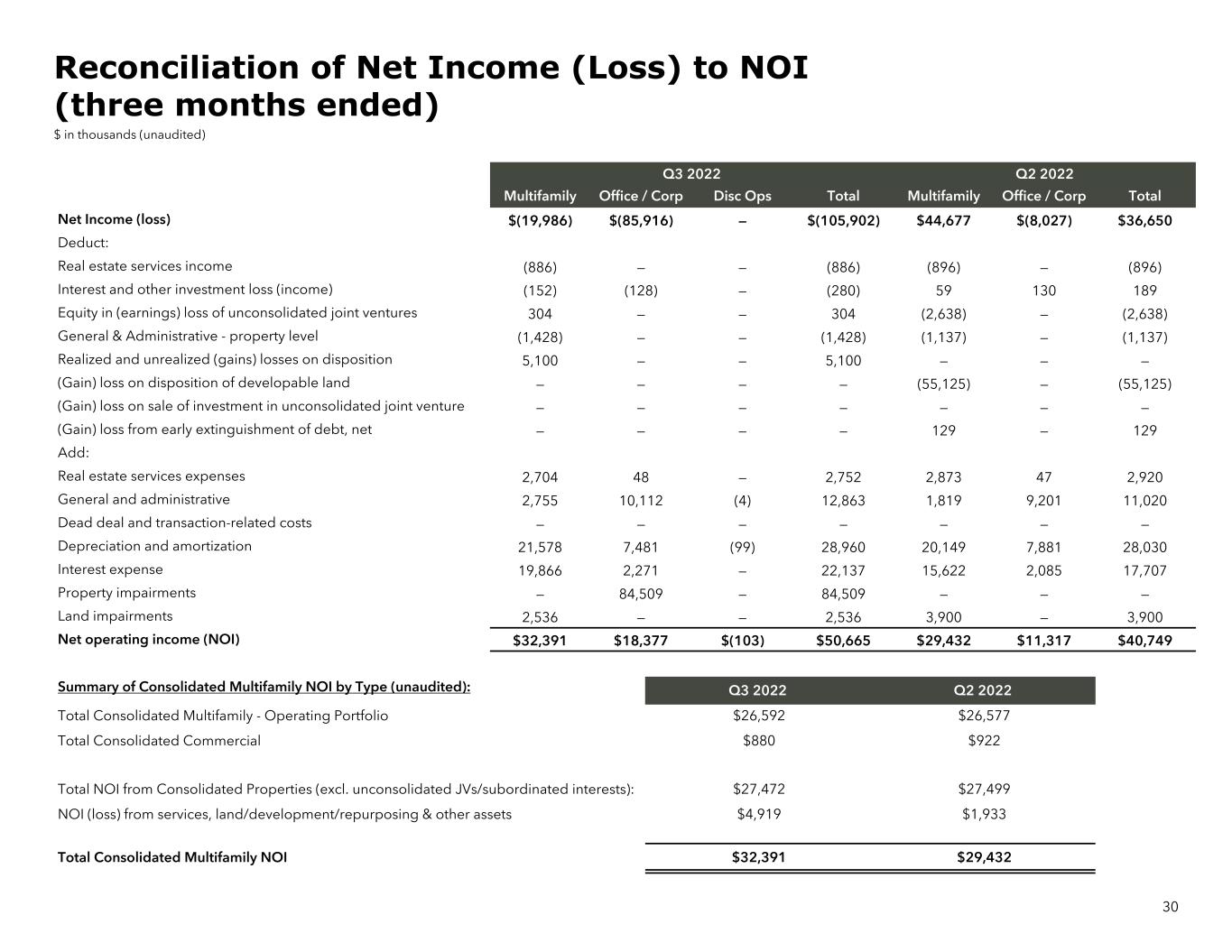 30 Q3 2022 Q2 2022 Multifamily Office / Corp Disc Ops Total Multifamily Office / Corp Total Net Income (loss) $(19,986) $(85,916) — $(105,902) $44,677 $(8,027) $36,650 Deduct: Real estate services income (886) — — (886) (896) — (896) Interest and other investment loss (income) (152) (128) — (280) 59 130 189 Equity in (earnings) loss of unconsolidated joint ventures 304 — — 304 (2,638) — (2,638) General & Administrative - property level (1,428) — — (1,428) (1,137) — (1,137) Realized and unrealized (gains) losses on disposition 5,100 — — 5,100 — — — (Gain) loss on disposition of developable land — — — — (55,125) — (55,125) (Gain) loss on sale of investment in unconsolidated joint venture — — — — — — — (Gain) loss from early extinguishment of debt, net — — — — 129 — 129 Add: Real estate services expenses 2,704 48 — 2,752 2,873 47 2,920 General and administrative 2,755 10,112 (4) 12,863 1,819 9,201 11,020 Dead deal and transaction-related costs — — — — — — — Depreciation and amortization 21,578 7,481 (99) 28,960 20,149 7,881 28,030 Interest expense 19,866 2,271 — 22,137 15,622 2,085 17,707 Property impairments — 84,509 — 84,509 — — — Land impairments 2,536 — — 2,536 3,900 — 3,900 Net operating income (NOI) $32,391 $18,377 $(103) $50,665 $29,432 $11,317 $40,749 Summary of Consolidated Multifamily NOI by Type (unaudited): Q3 2022 Q2 2022 Total Consolidated Multifamily - Operating Portfolio $26,592 $26,577 Total Consolidated Commercial $880 $922 Total NOI from Consolidated Properties (excl. unconsolidated JVs/subordinated interests): $27,472 $27,499 NOI (loss) from services, land/development/repurposing & other assets $4,919 $1,933 Total Consolidated Multifamily NOI $32,391 $29,432 Reconciliation of Net Income (Loss) to NOI (three months ended) $ in thousands (unaudited)
