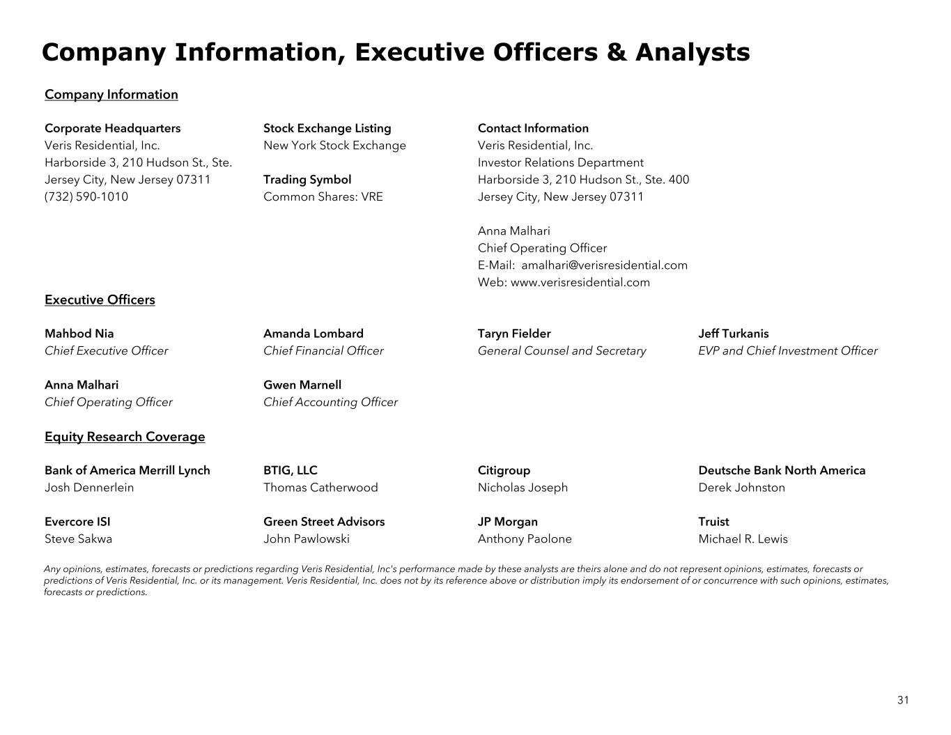 31 Company Information Corporate Headquarters Stock Exchange Listing Contact Information Veris Residential, Inc. New York Stock Exchange Veris Residential, Inc. Harborside 3, 210 Hudson St., Ste. Investor Relations Department Jersey City, New Jersey 07311 Trading Symbol Harborside 3, 210 Hudson St., Ste. 400 (732) 590-1010 Common Shares: VRE Jersey City, New Jersey 07311 Anna Malhari Chief Operating Officer E-Mail: amalhari@verisresidential.com Web: www.verisresidential.com Executive Officers Mahbod Nia Amanda Lombard Taryn Fielder Jeff Turkanis Chief Executive Officer Chief Financial Officer General Counsel and Secretary EVP and Chief Investment Officer Anna Malhari Gwen Marnell Chief Operating Officer Chief Accounting Officer Equity Research Coverage Bank of America Merrill Lynch BTIG, LLC Citigroup Deutsche Bank North America Josh Dennerlein Thomas Catherwood Nicholas Joseph Derek Johnston Evercore ISI Green Street Advisors JP Morgan Truist Steve Sakwa John Pawlowski Anthony Paolone Michael R. Lewis Any opinions, estimates, forecasts or predictions regarding Veris Residential, Inc's performance made by these analysts are theirs alone and do not represent opinions, estimates, forecasts or predictions of Veris Residential, Inc. or its management. Veris Residential, Inc. does not by its reference above or distribution imply its endorsement of or concurrence with such opinions, estimates, forecasts or predictions. Company Information, Executive Officers & Analysts