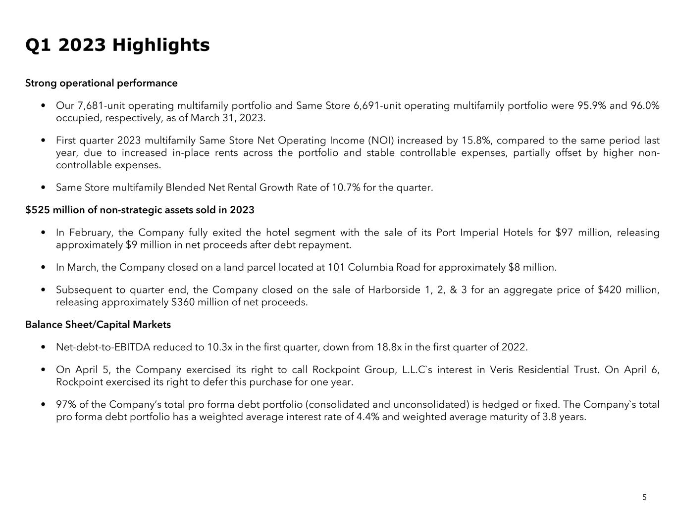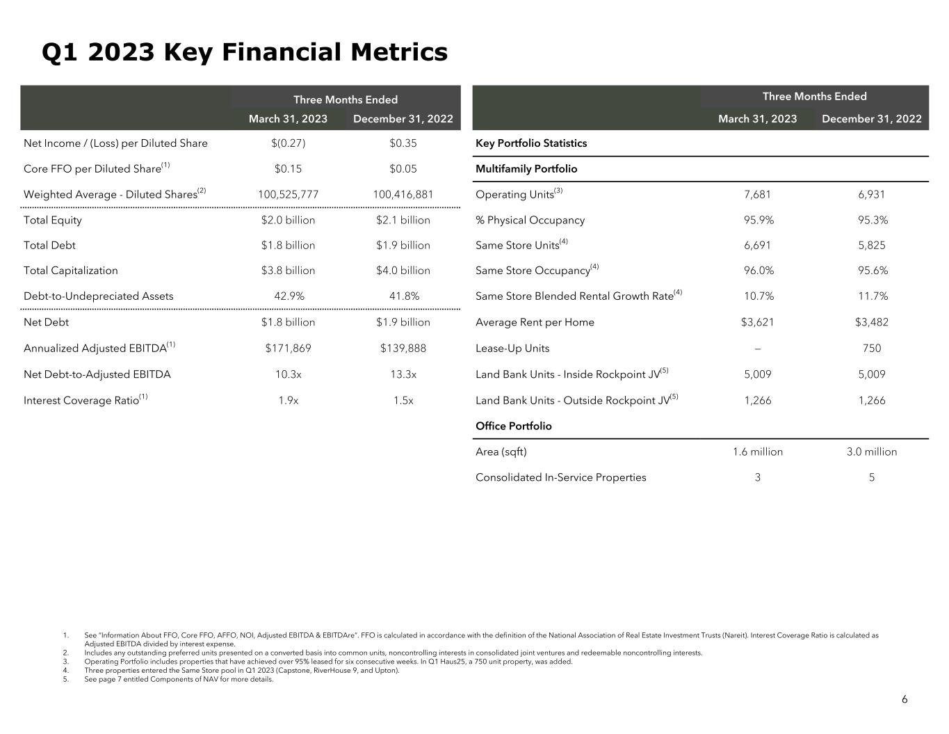 Three Months Ended Three Months Ended March 31, 2023 December 31, 2022 March 31, 2023 December 31, 2022 Net Income / (Loss) per Diluted Share $(0.27) $0.35 Key Portfolio Statistics Core FFO per Diluted Share(1) $0.15 $0.05 Multifamily Portfolio Weighted Average - Diluted Shares(2) 100,525,777 100,416,881 Operating Units(3) 7,681 6,931 Total Equity $2.0 billion $2.1 billion % Physical Occupancy 95.9% 95.3% Total Debt $1.8 billion $1.9 billion Same Store Units(4) 6,691 5,825 Total Capitalization $3.8 billion $4.0 billion Same Store Occupancy(4) 96.0% 95.6% Debt-to-Undepreciated Assets 42.9% 41.8% Same Store Blended Rental Growth Rate(4) 10.7% 11.7% Net Debt $1.8 billion $1.9 billion Average Rent per Home $3,621 $3,482 Annualized Adjusted EBITDA(1) $171,869 $139,888 Lease-Up Units — 750 Net Debt-to-Adjusted EBITDA 10.3x 13.3x Land Bank Units - Inside Rockpoint JV(5) 5,009 5,009 Interest Coverage Ratio(1) 1.9x 1.5x Land Bank Units - Outside Rockpoint JV(5) 1,266 1,266 Office Portfolio Area (sqft) 1.6 million 3.0 million Consolidated In-Service Properties 3 5 6 Q1 2023 Key Financial Metrics 1. See “Information About FFO, Core FFO, AFFO, NOI, Adjusted EBITDA & EBITDAre”. FFO is calculated in accordance with the definition of the National Association of Real Estate Investment Trusts (Nareit). Interest Coverage Ratio is calculated as Adjusted EBITDA divided by interest expense. 2. Includes any outstanding preferred units presented on a converted basis into common units, noncontrolling interests in consolidated joint ventures and redeemable noncontrolling interests. 3. Operating Portfolio includes properties that have achieved over 95% leased for six consecutive weeks. In Q1 Haus25, a 750 unit property, was added. 4. Three properties entered the Same Store pool in Q1 2023 (Capstone, RiverHouse 9, and Upton). 5. See page 7 entitled Components of NAV for more details.