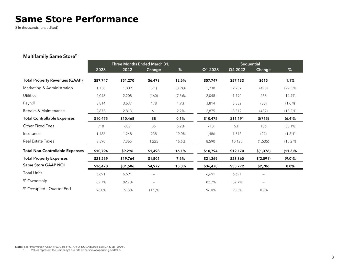 Multifamily Same Store(1) Three Months Ended March 31, Sequential 2023 2022 Change % Q1 2023 Q4 2022 Change % Total Property Revenues (GAAP) $57,747 $51,270 $6,478 12.6% $57,747 $57,133 $615 1.1% Marketing & Administration 1,738 1,809 (71) (3.9)% 1,738 2,237 (498) (22.3)% Utilities 2,048 2,208 (160) (7.3)% 2,048 1,790 258 14.4% Payroll 3,814 3,637 178 4.9% 3,814 3,852 (38) (1.0)% Repairs & Maintenance 2,875 2,813 61 2.2% 2,875 3,312 (437) (13.2)% Total Controllable Expenses $10,475 $10,468 $8 0.1% $10,475 $11,191 $(715) (6.4)% Other Fixed Fees 718 682 35 5.2% 718 531 186 35.1% Insurance 1,486 1,248 238 19.0% 1,486 1,513 (27) (1.8)% Real Estate Taxes 8,590 7,365 1,225 16.6% 8,590 10,125 (1,535) (15.2)% Total Non-Controllable Expenses $10,794 $9,296 $1,498 16.1% $10,794 $12,170 $(1,376) (11.3)% Total Property Expenses $21,269 $19,764 $1,505 7.6% $21,269 $23,360 $(2,091) (9.0)% Same Store GAAP NOI $36,478 $31,506 $4,972 15.8% $36,478 $33,772 $2,706 8.0% Total Units 6,691 6,691 — 6,691 6,691 — % Ownership 82.7% 82.7% — 82.7% 82.7% — % Occupied - Quarter End 96.0% 97.5% (1.5)% 96.0% 95.3% 0.7% Notes: See “Information About FFO, Core FFO, AFFO, NOI, Adjusted EBITDA & EBITDAre”. 1. Values represent the Company’s pro rata ownership of operating portfolio. 8 Same Store Performance $ in thousands (unaudited)