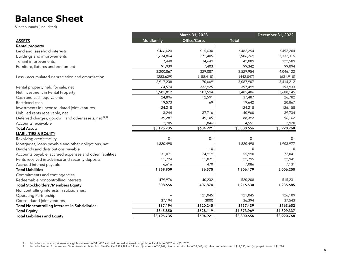 1. Includes mark-to-market lease intangible net assets of $11,462 and mark-to-market lease intangible net liabilities of $426 as of Q1 2023. 2. Includes Prepaid Expenses and Other Assets attributable to Multifamily of $23,484 as follows: (i) deposits of $5,207, (ii) other receivables of $4,643, (iii) other prepaid/assets of $12,590, and (iv) prepaid taxes of $1,224. March 31, 2023 December 31, 2022 ASSETS Multifamily Office/Corp. Total Rental property Land and leasehold interests $466,624 $15,630 $482,254 $492,204 Buildings and improvements 2,634,864 271,405 2,906,269 3,332,315 Tenant improvements 7,440 34,649 42,089 122,509 Furniture, fixtures and equipment 91,939 7,403 99,342 99,094 3,200,867 329,087 3,529,954 4,046,122 Less – accumulated depreciation and amortization (283,629) (158,418) (442,047) (631,910) 2,917,238 170,669 3,087,907 3,414,212 Rental property held for sale, net 64,574 332,925 397,499 193,933 Net Investment in Rental Property 2,981,812 503,594 3,485,406 3,608,145 Cash and cash equivalents 24,896 12,591 37,487 26,782 Restricted cash 19,573 69 19,642 20,867 Investments in unconsolidated joint ventures 124,218 — 124,218 126,158 Unbilled rents receivable, net 3,244 37,716 40,960 39,734 Deferred charges, goodwill and other assets, net(1)(2) 39,287 49,105 88,392 96,162 Accounts receivable 2,705 1,846 4,551 2,920 Total Assets $3,195,735 $604,921 $3,800,656 $3,920,768 LIABILITIES & EQUITY Revolving credit facility $— $— $— $— Mortgages, loans payable and other obligations, net 1,820,498 — 1,820,498 1,903,977 Dividends and distributions payable — 110 110 110 Accounts payable, accrued expenses and other liabilities 31,071 24,919 55,990 72,041 Rents received in advance and security deposits 11,724 11,071 22,795 22,941 Accrued interest payable 6,616 470 7,086 7,131 Total Liabilities 1,869,909 36,570 1,906,479 2,006,200 Commitments and contingencies — — — — Redeemable noncontrolling interests 479,976 40,232 520,208 515,231 Total Stockholders’/Members Equity 808,656 407,874 1,216,530 1,235,685 Noncontrolling interests in subsidiaries: Operating Partnership — 121,045 121,045 126,109 Consolidated joint ventures 37,194 (800) 36,394 37,543 Total Noncontrolling Interests in Subsidiaries $37,194 $120,245 $157,439 $163,652 Total Equity $845,850 $528,119 $1,373,969 $1,399,337 Total Liabilities and Equity $3,195,735 $604,921 $3,800,656 $3,920,768 9 Balance Sheet $ in thousands (unaudited)