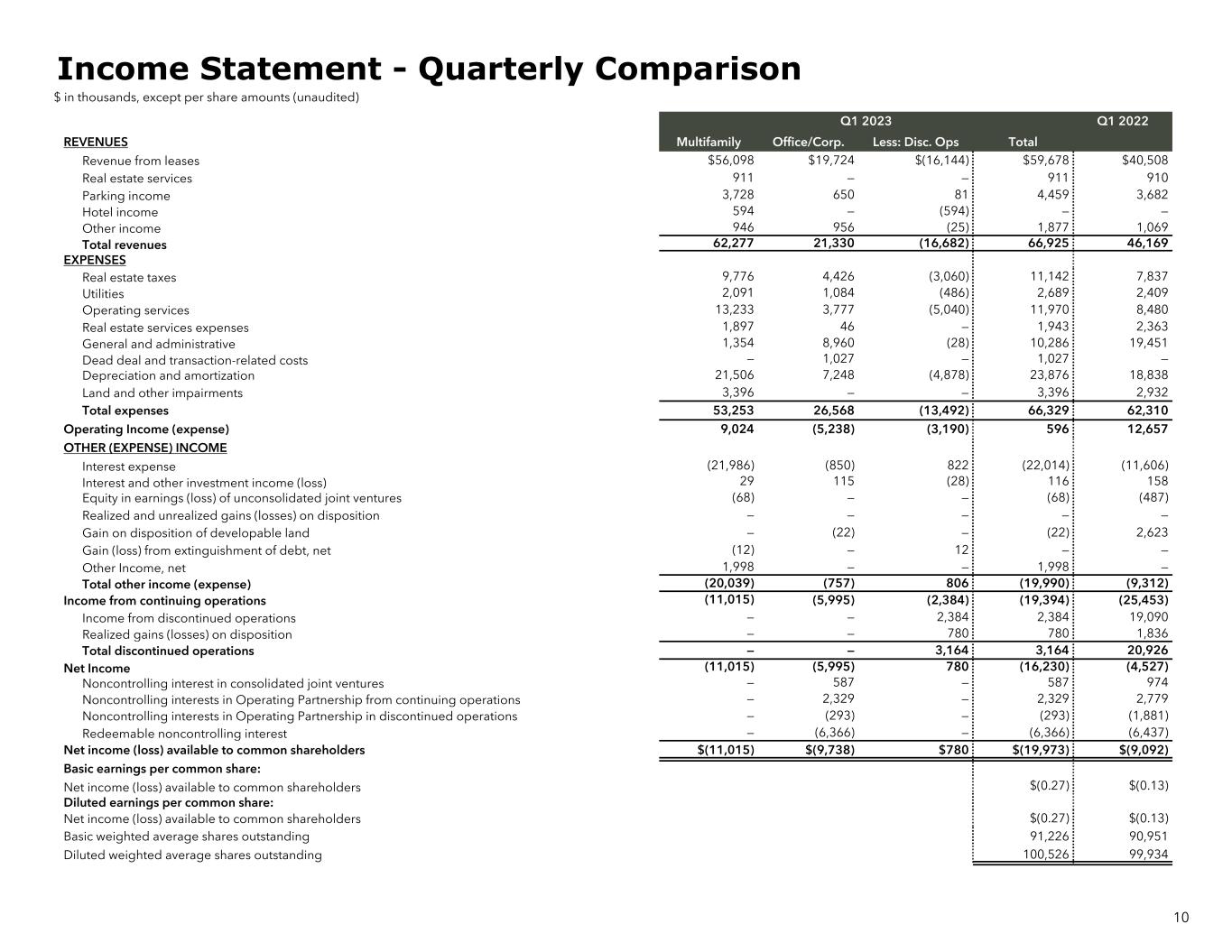 Q1 2023 Q1 2022 REVENUES Multifamily Office/Corp. Less: Disc. Ops Total Revenue from leases $56,098 $19,724 $(16,144) $59,678 $40,508 Real estate services 911 — — 911 910 Parking income 3,728 650 81 4,459 3,682 Hotel income 594 — (594) — — Other income 946 956 (25) 1,877 1,069 Total revenues 62,277 21,330 (16,682) 66,925 46,169 EXPENSES Real estate taxes 9,776 4,426 (3,060) 11,142 7,837 Utilities 2,091 1,084 (486) 2,689 2,409 Operating services 13,233 3,777 (5,040) 11,970 8,480 Real estate services expenses 1,897 46 — 1,943 2,363 General and administrative 1,354 8,960 (28) 10,286 19,451 Dead deal and transaction-related costs — 1,027 — 1,027 — Depreciation and amortization 21,506 7,248 (4,878) 23,876 18,838 Land and other impairments 3,396 — — 3,396 2,932 Total expenses 53,253 26,568 (13,492) 66,329 62,310 Operating Income (expense) 9,024 (5,238) (3,190) 596 12,657 OTHER (EXPENSE) INCOME Interest expense (21,986) (850) 822 (22,014) (11,606) Interest and other investment income (loss) 29 115 (28) 116 158 Equity in earnings (loss) of unconsolidated joint ventures (68) — — (68) (487) Realized and unrealized gains (losses) on disposition — — — — — Gain on disposition of developable land — (22) — (22) 2,623 Gain (loss) from extinguishment of debt, net (12) — 12 — — Other Income, net 1,998 — — 1,998 — Total other income (expense) (20,039) (757) 806 (19,990) (9,312) Income from continuing operations (11,015) (5,995) (2,384) (19,394) (25,453) Income from discontinued operations — — 2,384 2,384 19,090 Realized gains (losses) on disposition — — 780 780 1,836 Total discontinued operations — — 3,164 3,164 20,926 Net Income (11,015) (5,995) 780 (16,230) (4,527) Noncontrolling interest in consolidated joint ventures — 587 — 587 974 Noncontrolling interests in Operating Partnership from continuing operations — 2,329 — 2,329 2,779 Noncontrolling interests in Operating Partnership in discontinued operations — (293) — (293) (1,881) Redeemable noncontrolling interest — (6,366) — (6,366) (6,437) Net income (loss) available to common shareholders $(11,015) $(9,738) $780 $(19,973) $(9,092) Basic earnings per common share: Net income (loss) available to common shareholders $(0.27) $(0.13) Diluted earnings per common share: Net income (loss) available to common shareholders $(0.27) $(0.13) Basic weighted average shares outstanding 91,226 90,951 Diluted weighted average shares outstanding 100,526 99,934 10 Income Statement - Quarterly Comparison $ in thousands, except per share amounts (unaudited)