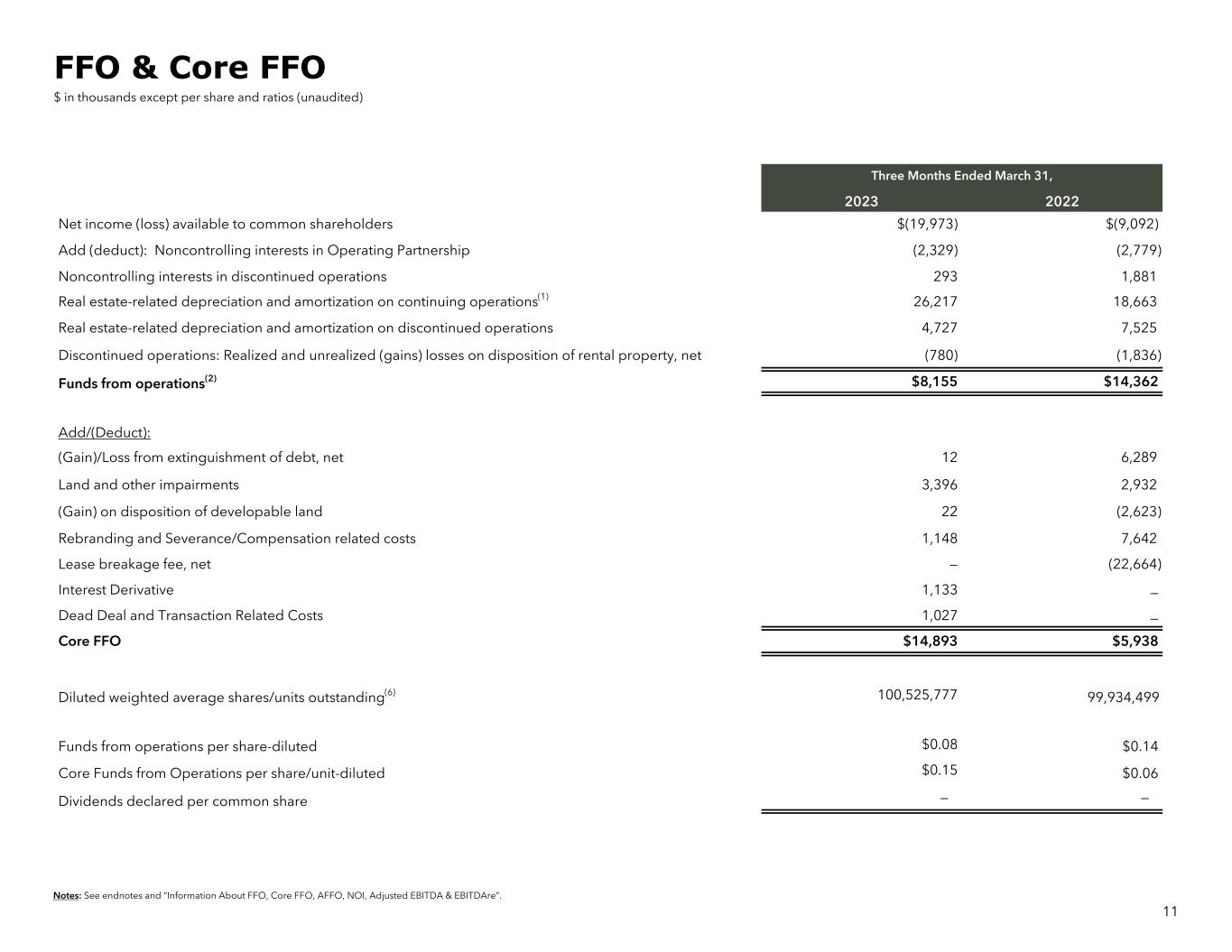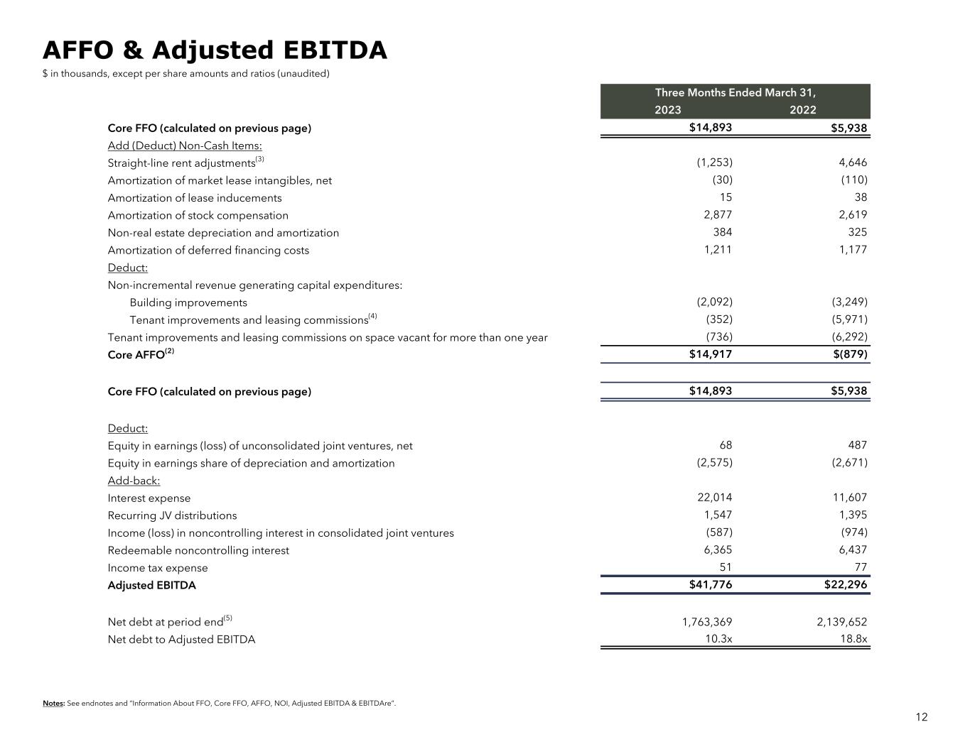 Notes: See endnotes and “Information About FFO, Core FFO, AFFO, NOI, Adjusted EBITDA & EBITDAre”. Three Months Ended March 31, 2023 2022 Net income (loss) available to common shareholders $(19,973) $(9,092) Add (deduct): Noncontrolling interests in Operating Partnership (2,329) (2,779) Noncontrolling interests in discontinued operations 293 1,881 Real estate-related depreciation and amortization on continuing operations(1) 26,217 18,663 Real estate-related depreciation and amortization on discontinued operations 4,727 7,525 Discontinued operations: Realized and unrealized (gains) losses on disposition of rental property, net (780) (1,836) Funds from operations(2) $8,155 $14,362 Add/(Deduct): (Gain)/Loss from extinguishment of debt, net 12 6,289 Land and other impairments 3,396 2,932 (Gain) on disposition of developable land 22 (2,623) Rebranding and Severance/Compensation related costs 1,148 7,642 Lease breakage fee, net — (22,664) Interest Derivative 1,133 — Dead Deal and Transaction Related Costs 1,027 — Core FFO $14,893 $5,938 Diluted weighted average shares/units outstanding(6) 100,525,777 99,934,499 Funds from operations per share-diluted $0.08 $0.14 Core Funds from Operations per share/unit-diluted $0.15 $0.06 Dividends declared per common share — — FFO & Core FFO $ in thousands except per share and ratios (unaudited) 11