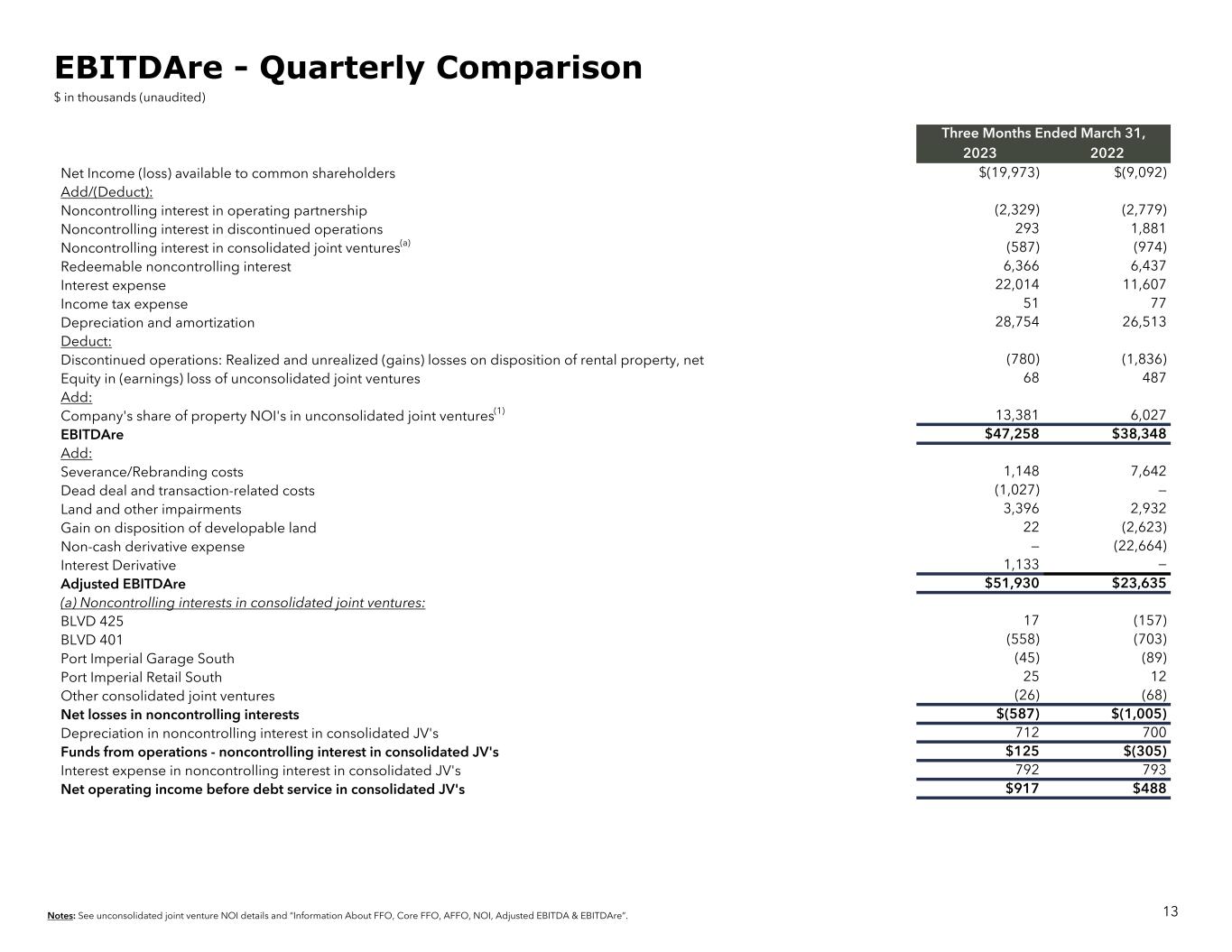 Notes: See endnotes and “Information About FFO, Core FFO, AFFO, NOI, Adjusted EBITDA & EBITDAre”. 12 Three Months Ended March 31, 2023 2022 Core FFO (calculated on previous page) $14,893 $5,938 Add (Deduct) Non-Cash Items: Straight-line rent adjustments(3) (1,253) 4,646 Amortization of market lease intangibles, net (30) (110) Amortization of lease inducements 15 38 Amortization of stock compensation 2,877 2,619 Non-real estate depreciation and amortization 384 325 Amortization of deferred financing costs 1,211 1,177 Deduct: Non-incremental revenue generating capital expenditures: Building improvements (2,092) (3,249) Tenant improvements and leasing commissions(4) (352) (5,971) Tenant improvements and leasing commissions on space vacant for more than one year (736) (6,292) Core AFFO(2) $14,917 $(879) Core FFO (calculated on previous page) $14,893 $5,938 Deduct: Equity in earnings (loss) of unconsolidated joint ventures, net 68 487 Equity in earnings share of depreciation and amortization (2,575) (2,671) Add-back: Interest expense 22,014 11,607 Recurring JV distributions 1,547 1,395 Income (loss) in noncontrolling interest in consolidated joint ventures (587) (974) Redeemable noncontrolling interest 6,365 6,437 Income tax expense 51 77 Adjusted EBITDA $41,776 $22,296 Net debt at period end(5) 1,763,369 2,139,652 Net debt to Adjusted EBITDA 10.3x 18.8x AFFO & Adjusted EBITDA $ in thousands, except per share amounts and ratios (unaudited)