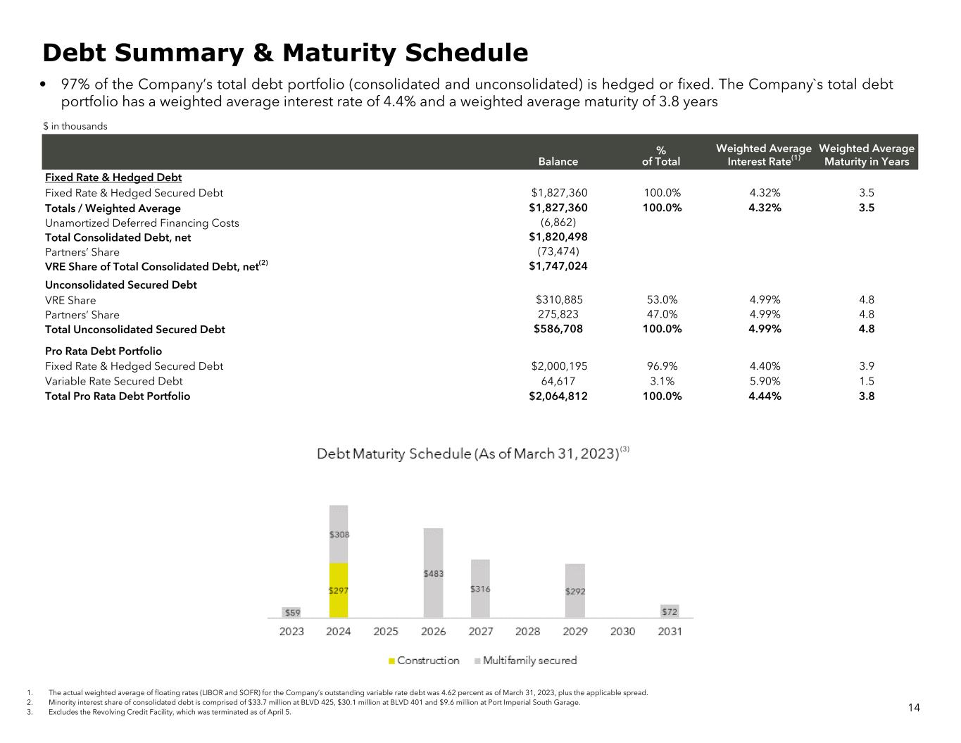 • 97% of the Company’s total debt portfolio (consolidated and unconsolidated) is hedged or fixed. The Company`s total debt portfolio has a weighted average interest rate of 4.4% and a weighted average maturity of 3.8 years $ in thousands 14 Balance % of Total Weighted Average Interest Rate(1) Weighted Average Maturity in Years Fixed Rate & Hedged Debt Fixed Rate & Hedged Secured Debt $1,827,360 100.0% 4.32% 3.5 Totals / Weighted Average $1,827,360 100.0% 4.32% 3.5 Unamortized Deferred Financing Costs (6,862) Total Consolidated Debt, net $1,820,498 Partners’ Share (73,474) VRE Share of Total Consolidated Debt, net(2) $1,747,024 Unconsolidated Secured Debt VRE Share $310,885 53.0% 4.99% 4.8 Partners’ Share 275,823 47.0% 4.99% 4.8 Total Unconsolidated Secured Debt $586,708 100.0% 4.99% 4.8 Pro Rata Debt Portfolio Fixed Rate & Hedged Secured Debt $2,000,195 96.9% 4.40% 3.9 Variable Rate Secured Debt 64,617 3.1% 5.90% 1.5 Total Pro Rata Debt Portfolio $2,064,812 100.0% 4.44% 3.8 Debt Summary & Maturity Schedule 1. The actual weighted average of floating rates (LIBOR and SOFR) for the Company’s outstanding variable rate debt was 4.62 percent as of March 31, 2023, plus the applicable spread. 2. Minority interest share of consolidated debt is comprised of $33.7 million at BLVD 425, $30.1 million at BLVD 401 and $9.6 million at Port Imperial South Garage. 3. Excludes the Revolving Credit Facility, which was terminated as of April 5. (3)