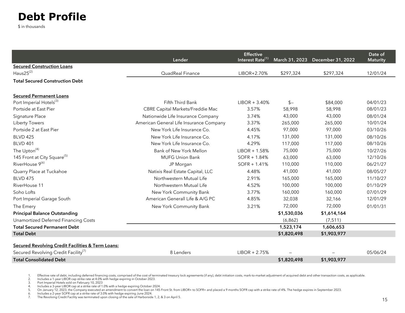 1. Effective rate of debt, including deferred financing costs, comprised of the cost of terminated treasury lock agreements (if any), debt initiation costs, mark-to-market adjustment of acquired debt and other transaction costs, as applicable. 2. Includes a 1-year LIBOR cap strike rate at 4.0% with hedge expiring in October 2023. 3. Port Imperial Hotels sold on February 10, 2023 4. Includes a 3-year LIBOR cap at a strike rate of 1.0% with a hedge expiring October 2024. 5. On January 12, 2023, the Company executed an amendment to convert the loan on 145 Front St. from LIBOR+ to SOFR+ and placed a 9 months SOFR cap with a strike rate of 4%. The hedge expires in September 2023. 6. Includes a 2-year SOFR cap at a strike rate of 3.0% with hedge expiring June 2024. 7. The Revolving Credit Facility was terminated upon closing of the sale of Harborside 1, 2, & 3 on April 5. 15 Lender Effective Interest Rate(1) March 31, 2023 December 31, 2022 Date of Maturity Secured Construction Loans Haus25(2) QuadReal Finance LIBOR+2.70% $297,324 $297,324 12/01/24 Total Secured Construction Debt Secured Permanent Loans Port Imperial Hotels(3) Fifth Third Bank LIBOR + 3.40% $— $84,000 04/01/23 Portside at East Pier CBRE Capital Markets/Freddie Mac 3.57% 58,998 58,998 08/01/23 Signature Place Nationwide Life Insurance Company 3.74% 43,000 43,000 08/01/24 Liberty Towers American General Life Insurance Company 3.37% 265,000 265,000 10/01/24 Portside 2 at East Pier New York Life Insurance Co. 4.45% 97,000 97,000 03/10/26 BLVD 425 New York Life Insurance Co. 4.17% 131,000 131,000 08/10/26 BLVD 401 New York Life Insurance Co. 4.29% 117,000 117,000 08/10/26 The Upton(4) Bank of New York Mellon LIBOR + 1.58% 75,000 75,000 10/27/26 145 Front at City Square(5) MUFG Union Bank SOFR + 1.84% 63,000 63,000 12/10/26 RiverHouse 9(6) JP Morgan SOFR + 1.41% 110,000 110,000 06/21/27 Quarry Place at Tuckahoe Natixis Real Estate Capital, LLC 4.48% 41,000 41,000 08/05/27 BLVD 475 Northwestern Mutual Life 2.91% 165,000 165,000 11/10/27 RiverHouse 11 Northwestern Mutual Life 4.52% 100,000 100,000 01/10/29 Soho Lofts New York Community Bank 3.77% 160,000 160,000 07/01/29 Port Imperial Garage South American Generall Life & A/G PC 4.85% 32,038 32,166 12/01/29 The Emery New York Community Bank 3.21% 72,000 72,000 01/01/31 Principal Balance Outstanding $1,530,036 $1,614,164 Unamortized Deferred Financing Costs (6,862) (7,511) Total Secured Permanent Debt 1,523,174 1,606,653 Total Debt $1,820,498 $1,903,977 Secured Revolving Credit Facilities & Term Loans: Secured Revolving Credit Facility(7) 8 Lenders LIBOR + 2.75% — — 05/06/24 Total Consolidated Debt $1,820,498 $1,903,977 Debt Profile $ in thousands