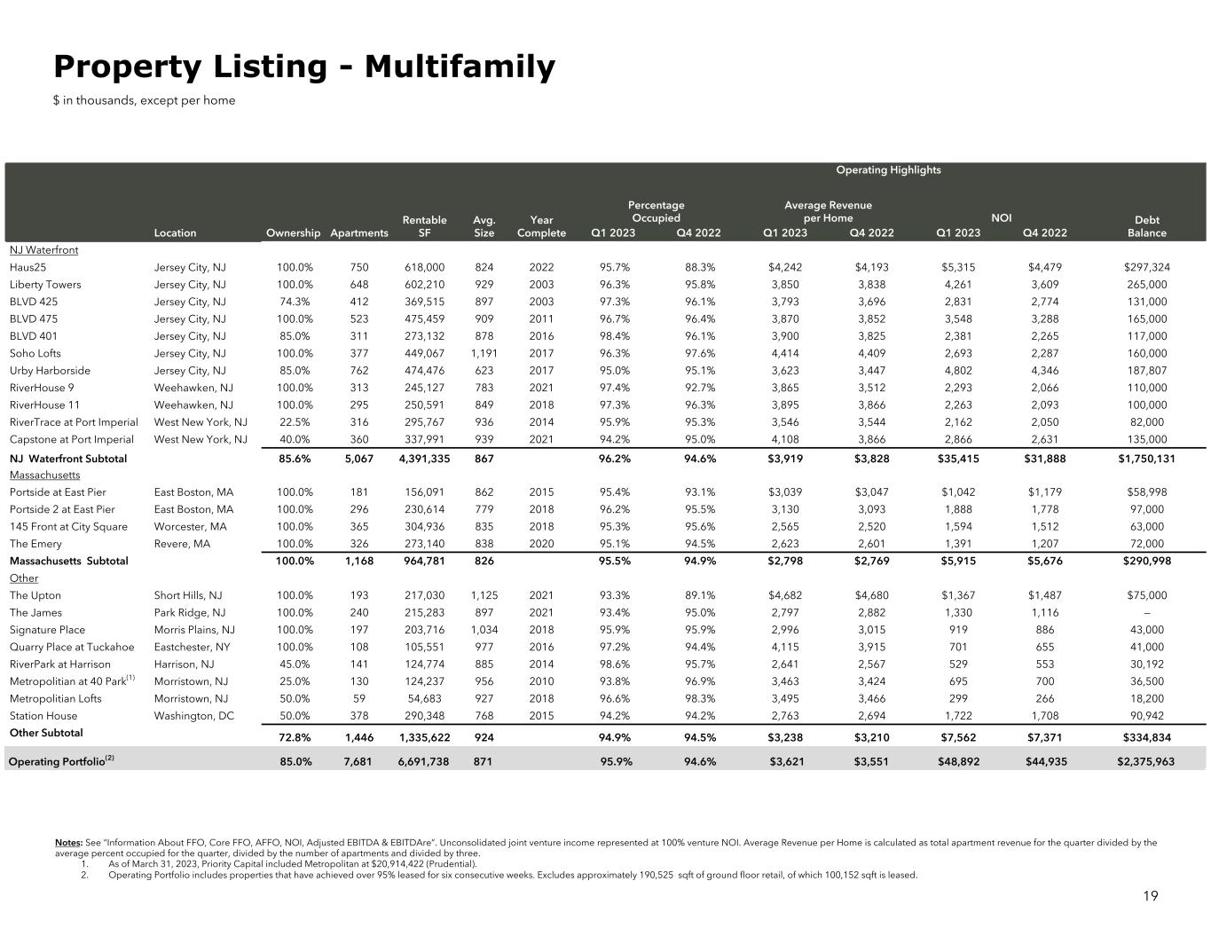Operating Highlights Rentable SF Avg. Size Year Complete Percentage Occupied Average Revenue per Home NOI Debt BalanceLocation Ownership Apartments Q1 2023 Q4 2022 Q1 2023 Q4 2022 Q1 2023 Q4 2022 NJ Waterfront Haus25 Jersey City, NJ 100.0% 750 618,000 824 2022 95.7% 88.3% $4,242 $4,193 $5,315 $4,479 $297,324 Liberty Towers Jersey City, NJ 100.0% 648 602,210 929 2003 96.3% 95.8% 3,850 3,838 4,261 3,609 265,000 BLVD 425 Jersey City, NJ 74.3% 412 369,515 897 2003 97.3% 96.1% 3,793 3,696 2,831 2,774 131,000 BLVD 475 Jersey City, NJ 100.0% 523 475,459 909 2011 96.7% 96.4% 3,870 3,852 3,548 3,288 165,000 BLVD 401 Jersey City, NJ 85.0% 311 273,132 878 2016 98.4% 96.1% 3,900 3,825 2,381 2,265 117,000 Soho Lofts Jersey City, NJ 100.0% 377 449,067 1,191 2017 96.3% 97.6% 4,414 4,409 2,693 2,287 160,000 Urby Harborside Jersey City, NJ 85.0% 762 474,476 623 2017 95.0% 95.1% 3,623 3,447 4,802 4,346 187,807 RiverHouse 9 Weehawken, NJ 100.0% 313 245,127 783 2021 97.4% 92.7% 3,865 3,512 2,293 2,066 110,000 RiverHouse 11 Weehawken, NJ 100.0% 295 250,591 849 2018 97.3% 96.3% 3,895 3,866 2,263 2,093 100,000 RiverTrace at Port Imperial West New York, NJ 22.5% 316 295,767 936 2014 95.9% 95.3% 3,546 3,544 2,162 2,050 82,000 Capstone at Port Imperial West New York, NJ 40.0% 360 337,991 939 2021 94.2% 95.0% 4,108 3,866 2,866 2,631 135,000 NJ Waterfront Subtotal 85.6% 5,067 4,391,335 867 96.2% 94.6% $3,919 $3,828 $35,415 $31,888 $1,750,131 Massachusetts Portside at East Pier East Boston, MA 100.0% 181 156,091 862 2015 95.4% 93.1% $3,039 $3,047 $1,042 $1,179 $58,998 Portside 2 at East Pier East Boston, MA 100.0% 296 230,614 779 2018 96.2% 95.5% 3,130 3,093 1,888 1,778 97,000 145 Front at City Square Worcester, MA 100.0% 365 304,936 835 2018 95.3% 95.6% 2,565 2,520 1,594 1,512 63,000 The Emery Revere, MA 100.0% 326 273,140 838 2020 95.1% 94.5% 2,623 2,601 1,391 1,207 72,000 Massachusetts Subtotal 100.0% 1,168 964,781 826 95.5% 94.9% $2,798 $2,769 $5,915 $5,676 $290,998 Other The Upton Short Hills, NJ 100.0% 193 217,030 1,125 2021 93.3% 89.1% $4,682 $4,680 $1,367 $1,487 $75,000 The James Park Ridge, NJ 100.0% 240 215,283 897 2021 93.4% 95.0% 2,797 2,882 1,330 1,116 — Signature Place Morris Plains, NJ 100.0% 197 203,716 1,034 2018 95.9% 95.9% 2,996 3,015 919 886 43,000 Quarry Place at Tuckahoe Eastchester, NY 100.0% 108 105,551 977 2016 97.2% 94.4% 4,115 3,915 701 655 41,000 RiverPark at Harrison Harrison, NJ 45.0% 141 124,774 885 2014 98.6% 95.7% 2,641 2,567 529 553 30,192 Metropolitian at 40 Park(1) Morristown, NJ 25.0% 130 124,237 956 2010 93.8% 96.9% 3,463 3,424 695 700 36,500 Metropolitian Lofts Morristown, NJ 50.0% 59 54,683 927 2018 96.6% 98.3% 3,495 3,466 299 266 18,200 Station House Washington, DC 50.0% 378 290,348 768 2015 94.2% 94.2% 2,763 2,694 1,722 1,708 90,942 Other Subtotal 72.8% 1,446 1,335,622 924 94.9% 94.5% $3,238 $3,210 $7,562 $7,371 $334,834 Operating Portfolio(2) 85.0% 7,681 6,691,738 871 95.9% 94.6% $3,621 $3,551 $48,892 $44,935 $2,375,963 Notes: See “Information About FFO, Core FFO, AFFO, NOI, Adjusted EBITDA & EBITDAre”. Unconsolidated joint venture income represented at 100% venture NOI. Average Revenue per Home is calculated as total apartment revenue for the quarter divided by the average percent occupied for the quarter, divided by the number of apartments and divided by three. 1. As of March 31, 2023, Priority Capital included Metropolitan at $20,914,422 (Prudential). 2. Operating Portfolio includes properties that have achieved over 95% leased for six consecutive weeks. Excludes approximately 190,525 sqft of ground floor retail, of which 100,152 sqft is leased. 19 Property Listing - Multifamily $ in thousands, except per home perating Portfolio(2) 85.0 7,681 6,691,738 871 95.9 94.6 $3,621 $3,551 $48,892 $44,935 $2,375,963