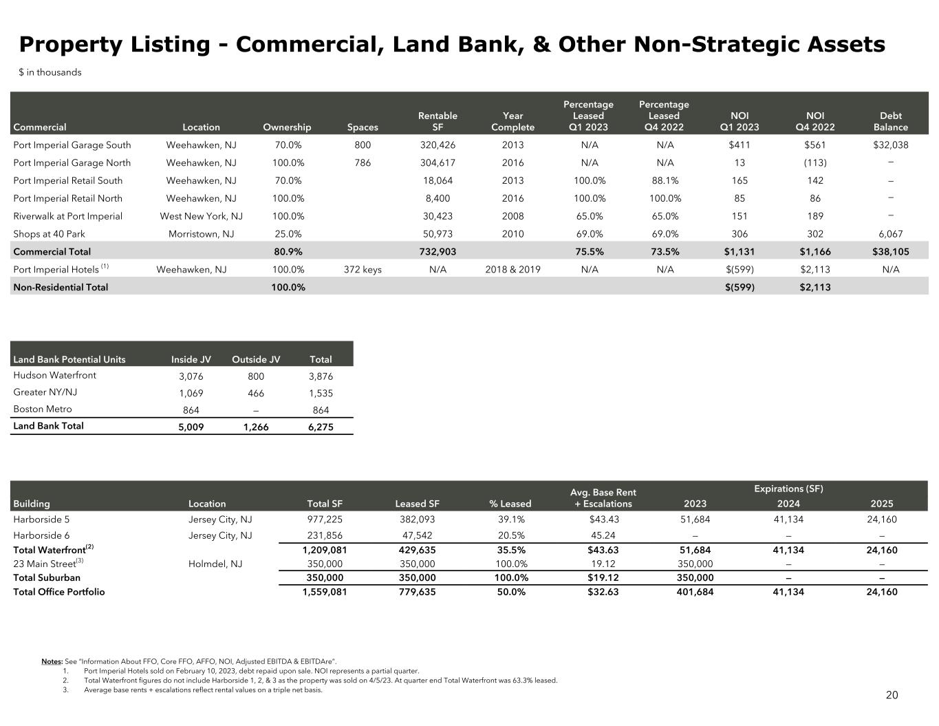Commercial Location Ownership Spaces Rentable SF Year Complete Percentage Leased Q1 2023 Percentage Leased Q4 2022 NOI Q1 2023 NOI Q4 2022 Debt Balance Port Imperial Garage South Weehawken, NJ 70.0% 800 320,426 2013 N/A N/A $411 $561 $32,038 Port Imperial Garage North Weehawken, NJ 100.0% 786 304,617 2016 N/A N/A 13 (113) — Port Imperial Retail South Weehawken, NJ 70.0% 18,064 2013 100.0% 88.1% 165 142 — Port Imperial Retail North Weehawken, NJ 100.0% 8,400 2016 100.0% 100.0% 85 86 — Riverwalk at Port Imperial West New York, NJ 100.0% 30,423 2008 65.0% 65.0% 151 189 — Shops at 40 Park Morristown, NJ 25.0% 50,973 2010 69.0% 69.0% 306 302 6,067 Commercial Total 80.9% 732,903 75.5% 73.5% $1,131 $1,166 $38,105 Port Imperial Hotels (1) Weehawken, NJ 100.0% 372 keys N/A 2018 & 2019 N/A N/A $(599) $2,113 N/A Non-Residential Total 100.0% $(599) $2,113 Notes: See “Information About FFO, Core FFO, AFFO, NOI, Adjusted EBITDA & EBITDAre”. 1. Port Imperial Hotels sold on February 10, 2023, debt repaid upon sale. NOI represents a partial quarter. 2. Total Waterfront figures do not include Harborside 1, 2, & 3 as the property was sold on 4/5/23. At quarter end Total Waterfront was 63.3% leased. 3. Average base rents + escalations reflect rental values on a triple net basis. 20 Property Listing - Commercial, Land Bank, & Other Non-Strategic Assets $ in thousands Land Bank Potential Units Inside JV Outside JV Total Hudson Waterfront 3,076 800 3,876 Greater NY/NJ 1,069 466 1,535 Boston Metro 864 — 864 Land Bank Total 5,009 1,266 6,275 Avg. Base Rent + Escalations Expirations (SF) Building Location Total SF Leased SF % Leased 2023 2024 2025 Harborside 5 Jersey City, NJ 977,225 382,093 39.1% $43.43 51,684 41,134 24,160 Harborside 6 Jersey City, NJ 231,856 47,542 20.5% 45.24 — — — Total Waterfront(2) 1,209,081 429,635 35.5% $43.63 51,684 41,134 24,160 23 Main Street(3) Holmdel, NJ 350,000 350,000 100.0% 19.12 350,000 — — Total Suburban 350,000 350,000 100.0% $19.12 350,000 — — Total Office Portfolio 1,559,081 779,635 50.0% $32.63 401,684 41,134 24,160