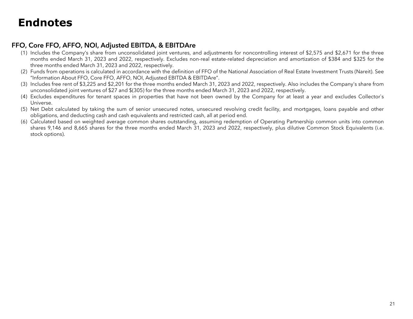 FFO, Core FFO, AFFO, NOI, Adjusted EBITDA, & EBITDAre (1) Includes the Company’s share from unconsolidated joint ventures, and adjustments for noncontrolling interest of $2,575 and $2,671 for the three months ended March 31, 2023 and 2022, respectively. Excludes non-real estate-related depreciation and amortization of $384 and $325 for the three months ended March 31, 2023 and 2022, respectively. (2) Funds from operations is calculated in accordance with the definition of FFO of the National Association of Real Estate Investment Trusts (Nareit). See “Information About FFO, Core FFO, AFFO, NOI, Adjusted EBITDA & EBITDAre”. (3) Includes free rent of $3,225 and $2,201 for the three months ended March 31, 2023 and 2022, respectively. Also includes the Company's share from unconsolidated joint ventures of $27 and $(305) for the three months ended March 31, 2023 and 2022, respectively. (4) Excludes expenditures for tenant spaces in properties that have not been owned by the Company for at least a year and excludes Collector`s Universe. (5) Net Debt calculated by taking the sum of senior unsecured notes, unsecured revolving credit facility, and mortgages, loans payable and other obligations, and deducting cash and cash equivalents and restricted cash, all at period end. (6) Calculated based on weighted average common shares outstanding, assuming redemption of Operating Partnership common units into common shares 9,146 and 8,665 shares for the three months ended March 31, 2023 and 2022, respectively, plus dilutive Common Stock Equivalents (i.e. stock options). 21 Endnotes