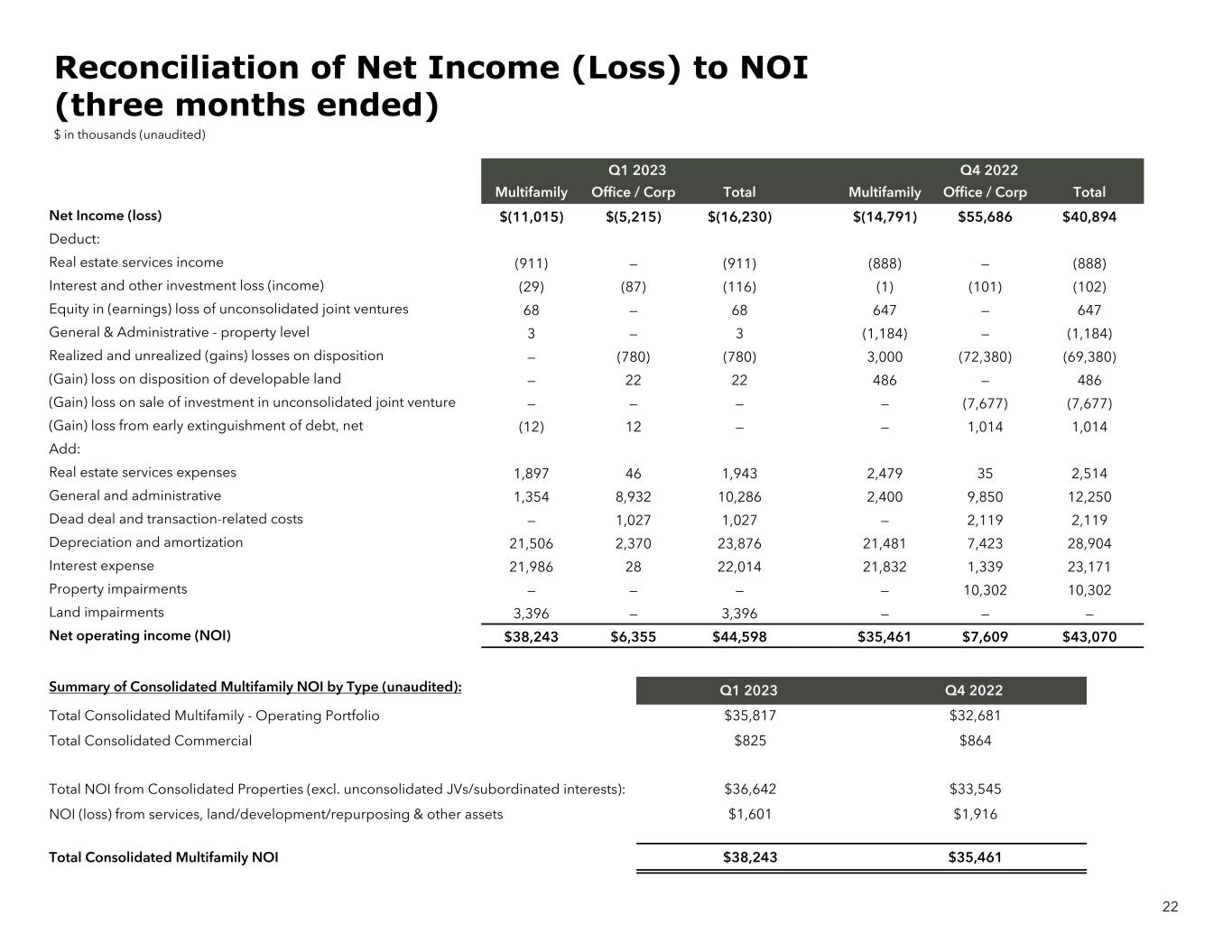 22 Q1 2023 Q4 2022 Multifamily Office / Corp Total Multifamily Office / Corp Total Net Income (loss) $(11,015) $(5,215) $(16,230) $(14,791) $55,686 $40,894 Deduct: Real estate services income (911) — (911) (888) — (888) Interest and other investment loss (income) (29) (87) (116) (1) (101) (102) Equity in (earnings) loss of unconsolidated joint ventures 68 — 68 647 — 647 General & Administrative - property level 3 — 3 (1,184) — (1,184) Realized and unrealized (gains) losses on disposition — (780) (780) 3,000 (72,380) (69,380) (Gain) loss on disposition of developable land — 22 22 486 — 486 (Gain) loss on sale of investment in unconsolidated joint venture — — — — (7,677) (7,677) (Gain) loss from early extinguishment of debt, net (12) 12 — — 1,014 1,014 Add: Real estate services expenses 1,897 46 1,943 2,479 35 2,514 General and administrative 1,354 8,932 10,286 2,400 9,850 12,250 Dead deal and transaction-related costs — 1,027 1,027 — 2,119 2,119 Depreciation and amortization 21,506 2,370 23,876 21,481 7,423 28,904 Interest expense 21,986 28 22,014 21,832 1,339 23,171 Property impairments — — — — 10,302 10,302 Land impairments 3,396 — 3,396 — — — Net operating income (NOI) $38,243 $6,355 $44,598 $35,461 $7,609 $43,070 Summary of Consolidated Multifamily NOI by Type (unaudited): Q1 2023 Q4 2022 Total Consolidated Multifamily - Operating Portfolio $35,817 $32,681 Total Consolidated Commercial $825 $864 Total NOI from Consolidated Properties (excl. unconsolidated JVs/subordinated interests): $36,642 $33,545 NOI (loss) from services, land/development/repurposing & other assets $1,601 $1,916 Total Consolidated Multifamily NOI $38,243 $35,461 Reconciliation of Net Income (Loss) to NOI (three months ended) $ in thousands (unaudited)