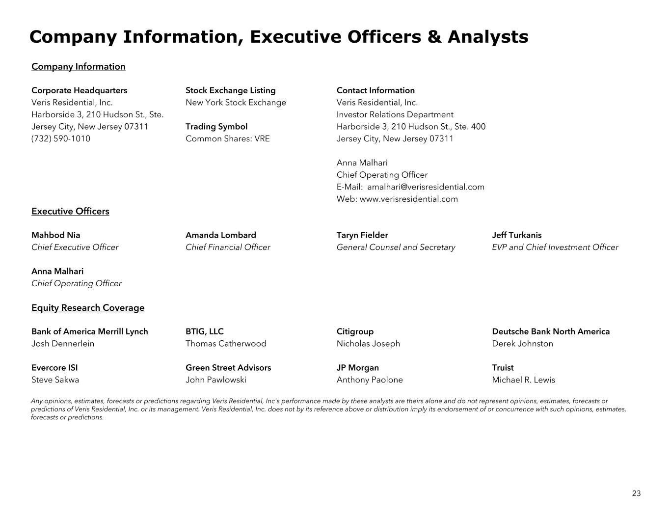23 Company Information Corporate Headquarters Stock Exchange Listing Contact Information Veris Residential, Inc. New York Stock Exchange Veris Residential, Inc. Harborside 3, 210 Hudson St., Ste. Investor Relations Department Jersey City, New Jersey 07311 Trading Symbol Harborside 3, 210 Hudson St., Ste. 400 (732) 590-1010 Common Shares: VRE Jersey City, New Jersey 07311 Anna Malhari Chief Operating Officer E-Mail: amalhari@verisresidential.com Web: www.verisresidential.com Executive Officers Mahbod Nia Amanda Lombard Taryn Fielder Jeff Turkanis Chief Executive Officer Chief Financial Officer General Counsel and Secretary EVP and Chief Investment Officer Anna Malhari Chief Operating Officer Equity Research Coverage Bank of America Merrill Lynch BTIG, LLC Citigroup Deutsche Bank North America Josh Dennerlein Thomas Catherwood Nicholas Joseph Derek Johnston Evercore ISI Green Street Advisors JP Morgan Truist Steve Sakwa John Pawlowski Anthony Paolone Michael R. Lewis Any opinions, estimates, forecasts or predictions regarding Veris Residential, Inc's performance made by these analysts are theirs alone and do not represent opinions, estimates, forecasts or predictions of Veris Residential, Inc. or its management. Veris Residential, Inc. does not by its reference above or distribution imply its endorsement of or concurrence with such opinions, estimates, forecasts or predictions. Company Information, Executive Officers & Analysts
