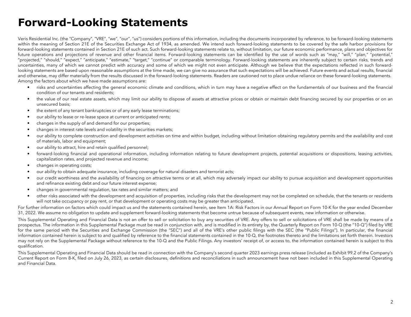 Veris Residential Inc. (the “Company”, “VRE”, “we”, “our”, “us”) considers portions of this information, including the documents incorporated by reference, to be forward-looking statements within the meaning of Section 21E of the Securities Exchange Act of 1934, as amended. We intend such forward-looking statements to be covered by the safe harbor provisions for forward-looking statements contained in Section 21E of such act. Such forward-looking statements relate to, without limitation, our future economic performance, plans and objectives for future operations and projections of revenue and other financial items. Forward-looking statements can be identified by the use of words such as “may,” “will,” “plan,” “potential,” “projected,” “should,” “expect,” “anticipate,” “estimate,” “target,” “continue” or comparable terminology. Forward-looking statements are inherently subject to certain risks, trends and uncertainties, many of which we cannot predict with accuracy and some of which we might not even anticipate. Although we believe that the expectations reflected in such forward- looking statements are based upon reasonable assumptions at the time made, we can give no assurance that such expectations will be achieved. Future events and actual results, financial and otherwise, may differ materially from the results discussed in the forward-looking statements. Readers are cautioned not to place undue reliance on these forward-looking statements. Among the factors about which we have made assumptions are: • risks and uncertainties affecting the general economic climate and conditions, which in turn may have a negative effect on the fundamentals of our business and the financial condition of our tenants and residents; • the value of our real estate assets, which may limit our ability to dispose of assets at attractive prices or obtain or maintain debt financing secured by our properties or on an unsecured basis; • the extent of any tenant bankruptcies or of any early lease terminations; • our ability to lease or re-lease space at current or anticipated rents; • changes in the supply of and demand for our properties; • changes in interest rate levels and volatility in the securities markets; • our ability to complete construction and development activities on time and within budget, including without limitation obtaining regulatory permits and the availability and cost of materials, labor and equipment; • our ability to attract, hire and retain qualified personnel; • forward-looking financial and operational information, including information relating to future development projects, potential acquisitions or dispositions, leasing activities, capitalization rates, and projected revenue and income; • changes in operating costs; • our ability to obtain adequate insurance, including coverage for natural disasters and terrorist acts; • our credit worthiness and the availability of financing on attractive terms or at all, which may adversely impact our ability to pursue acquisition and development opportunities and refinance existing debt and our future interest expense; • changes in governmental regulation, tax rates and similar matters; and • other risks associated with the development and acquisition of properties, including risks that the development may not be completed on schedule, that the tenants or residents will not take occupancy or pay rent, or that development or operating costs may be greater than anticipated. For further information on factors which could impact us and the statements contained herein, see Item 1A: Risk Factors in our Annual Report on Form 10-K for the year ended December 31, 2022. We assume no obligation to update and supplement forward-looking statements that become untrue because of subsequent events, new information or otherwise. This Supplemental Operating and Financial Data is not an offer to sell or solicitation to buy any securities of VRE. Any offers to sell or solicitations of VRE shall be made by means of a prospectus. The information in this Supplemental Package must be read in conjunction with, and is modified in its entirety by, the Quarterly Report on Form 10-Q (the “10-Q”) filed by VRE for the same period with the Securities and Exchange Commission (the “SEC”) and all of the VRE’s other public filings with the SEC (the “Public Filings”). In particular, the financial information contained herein is subject to and qualified by reference to the financial statements contained in the 10-Q, the footnotes thereto and the limitations set forth therein. Investors may not rely on the Supplemental Package without reference to the 10-Q and the Public Filings. Any investors’ receipt of, or access to, the information contained herein is subject to this qualification. This Supplemental Operating and Financial Data should be read in connection with the Company’s second quarter 2023 earnings press release (included as Exhibit 99.2 of the Company’s Current Report on Form 8-K, filed on July 26, 2023, as certain disclosures, definitions and reconciliations in such announcement have not been included in this Supplemental Operating and Financial Data. Forward-Looking Statements 2