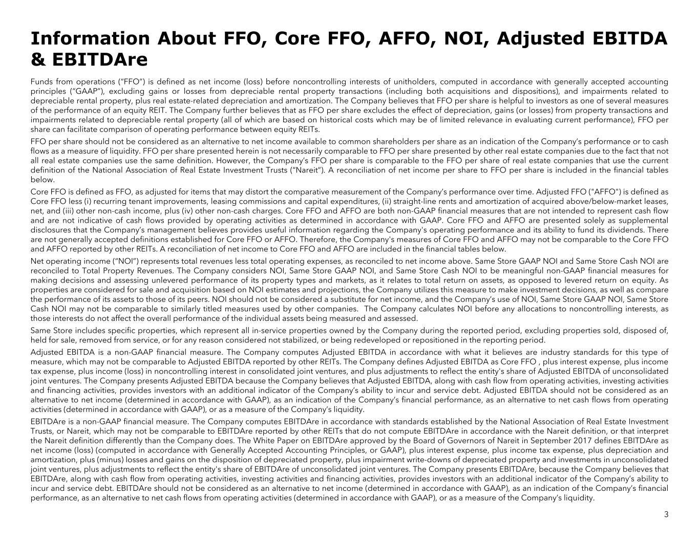 Funds from operations (“FFO”) is defined as net income (loss) before noncontrolling interests of unitholders, computed in accordance with generally accepted accounting principles (“GAAP”), excluding gains or losses from depreciable rental property transactions (including both acquisitions and dispositions), and impairments related to depreciable rental property, plus real estate-related depreciation and amortization. The Company believes that FFO per share is helpful to investors as one of several measures of the performance of an equity REIT. The Company further believes that as FFO per share excludes the effect of depreciation, gains (or losses) from property transactions and impairments related to depreciable rental property (all of which are based on historical costs which may be of limited relevance in evaluating current performance), FFO per share can facilitate comparison of operating performance between equity REITs. FFO per share should not be considered as an alternative to net income available to common shareholders per share as an indication of the Company’s performance or to cash flows as a measure of liquidity. FFO per share presented herein is not necessarily comparable to FFO per share presented by other real estate companies due to the fact that not all real estate companies use the same definition. However, the Company’s FFO per share is comparable to the FFO per share of real estate companies that use the current definition of the National Association of Real Estate Investment Trusts (“Nareit”). A reconciliation of net income per share to FFO per share is included in the financial tables below. Core FFO is defined as FFO, as adjusted for items that may distort the comparative measurement of the Company’s performance over time. Adjusted FFO ("AFFO") is defined as Core FFO less (i) recurring tenant improvements, leasing commissions and capital expenditures, (ii) straight-line rents and amortization of acquired above/below-market leases, net, and (iii) other non-cash income, plus (iv) other non-cash charges. Core FFO and AFFO are both non-GAAP financial measures that are not intended to represent cash flow and are not indicative of cash flows provided by operating activities as determined in accordance with GAAP. Core FFO and AFFO are presented solely as supplemental disclosures that the Company’s management believes provides useful information regarding the Company's operating performance and its ability to fund its dividends. There are not generally accepted definitions established for Core FFO or AFFO. Therefore, the Company's measures of Core FFO and AFFO may not be comparable to the Core FFO and AFFO reported by other REITs. A reconciliation of net income to Core FFO and AFFO are included in the financial tables below. Net operating income (“NOI”) represents total revenues less total operating expenses, as reconciled to net income above. Same Store GAAP NOI and Same Store Cash NOI are reconciled to Total Property Revenues. The Company considers NOI, Same Store GAAP NOI, and Same Store Cash NOI to be meaningful non-GAAP financial measures for making decisions and assessing unlevered performance of its property types and markets, as it relates to total return on assets, as opposed to levered return on equity. As properties are considered for sale and acquisition based on NOI estimates and projections, the Company utilizes this measure to make investment decisions, as well as compare the performance of its assets to those of its peers. NOI should not be considered a substitute for net income, and the Company’s use of NOI, Same Store GAAP NOI, Same Store Cash NOI may not be comparable to similarly titled measures used by other companies. The Company calculates NOI before any allocations to noncontrolling interests, as those interests do not affect the overall performance of the individual assets being measured and assessed. Same Store includes specific properties, which represent all in-service properties owned by the Company during the reported period, excluding properties sold, disposed of, held for sale, removed from service, or for any reason considered not stabilized, or being redeveloped or repositioned in the reporting period. Adjusted EBITDA is a non-GAAP financial measure. The Company computes Adjusted EBITDA in accordance with what it believes are industry standards for this type of measure, which may not be comparable to Adjusted EBITDA reported by other REITs. The Company defines Adjusted EBITDA as Core FFO , plus interest expense, plus income tax expense, plus income (loss) in noncontrolling interest in consolidated joint ventures, and plus adjustments to reflect the entity's share of Adjusted EBITDA of unconsolidated joint ventures. The Company presents Adjusted EBITDA because the Company believes that Adjusted EBITDA, along with cash flow from operating activities, investing activities and financing activities, provides investors with an additional indicator of the Company’s ability to incur and service debt. Adjusted EBITDA should not be considered as an alternative to net income (determined in accordance with GAAP), as an indication of the Company’s financial performance, as an alternative to net cash flows from operating activities (determined in accordance with GAAP), or as a measure of the Company’s liquidity. EBITDAre is a non-GAAP financial measure. The Company computes EBITDAre in accordance with standards established by the National Association of Real Estate Investment Trusts, or Nareit, which may not be comparable to EBITDAre reported by other REITs that do not compute EBITDAre in accordance with the Nareit definition, or that interpret the Nareit definition differently than the Company does. The White Paper on EBITDAre approved by the Board of Governors of Nareit in September 2017 defines EBITDAre as net income (loss) (computed in accordance with Generally Accepted Accounting Principles, or GAAP), plus interest e