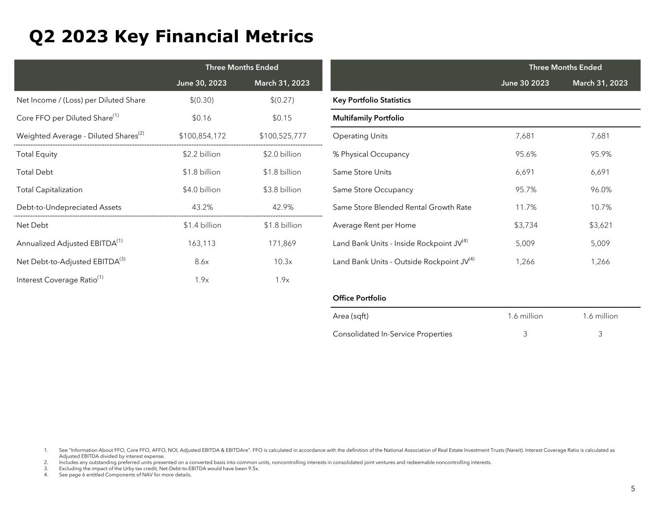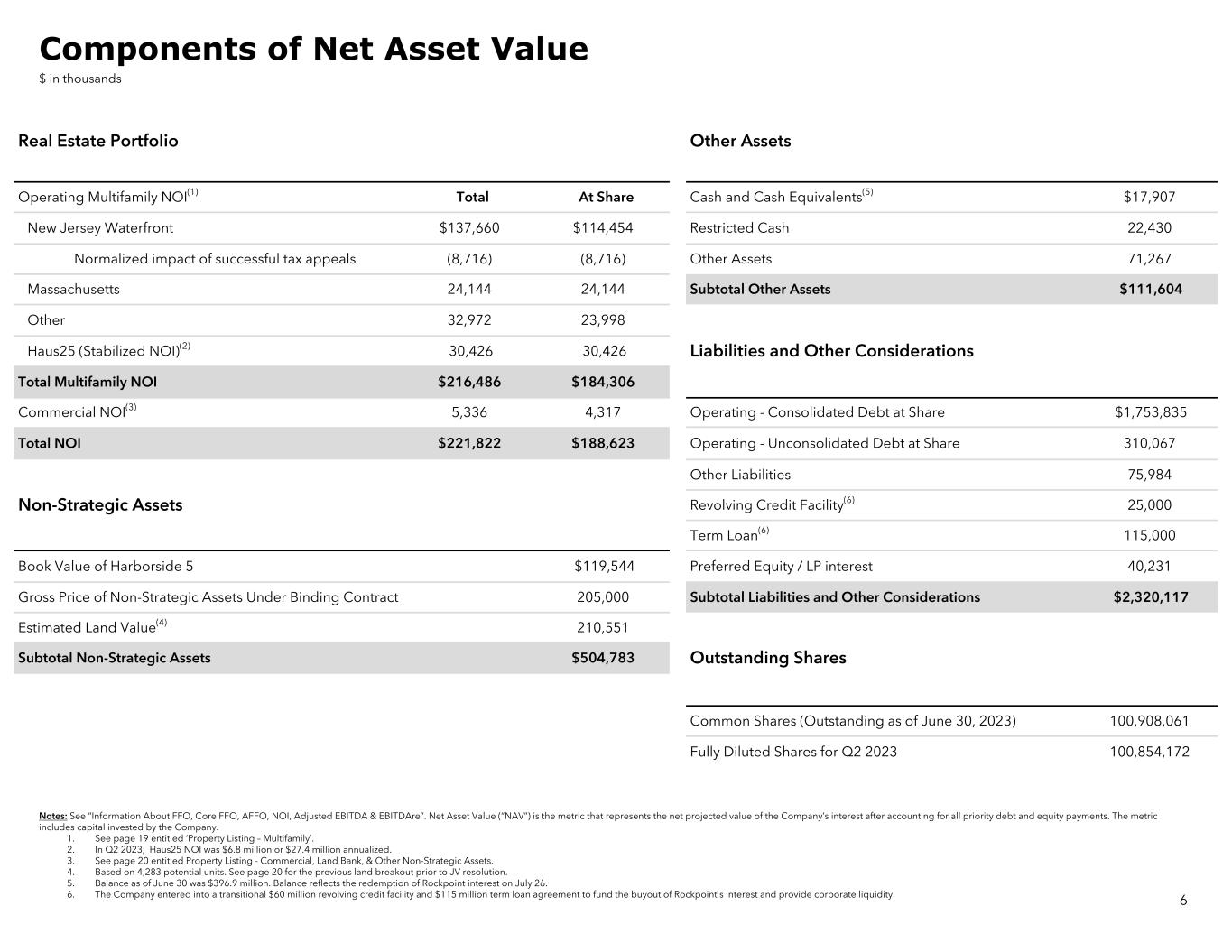 Three Months Ended Three Months Ended June 30, 2023 March 31, 2023 June 30 2023 March 31, 2023 Net Income / (Loss) per Diluted Share $(0.30) $(0.27) Key Portfolio Statistics Core FFO per Diluted Share(1) $0.16 $0.15 Multifamily Portfolio Weighted Average - Diluted Shares(2) $100,854,172 $100,525,777 Operating Units 7,681 7,681 Total Equity $2.2 billion $2.0 billion % Physical Occupancy 95.6% 95.9% Total Debt $1.8 billion $1.8 billion Same Store Units 6,691 6,691 Total Capitalization $4.0 billion $3.8 billion Same Store Occupancy 95.7% 96.0% Debt-to-Undepreciated Assets 43.2% 42.9% Same Store Blended Rental Growth Rate 11.7% 10.7% Net Debt $1.4 billion $1.8 billion Average Rent per Home $3,734 $3,621 Annualized Adjusted EBITDA(1) 163,113 171,869 Land Bank Units - Inside Rockpoint JV(4) 5,009 5,009 Net Debt-to-Adjusted EBITDA(3) 8.6x 10.3x Land Bank Units - Outside Rockpoint JV(4) 1,266 1,266 Interest Coverage Ratio(1) 1.9x 1.9x Office Portfolio Area (sqft) 1.6 million 1.6 million Consolidated In-Service Properties 3 3 5 Q2 2023 Key Financial Metrics 1. See “Information About FFO, Core FFO, AFFO, NOI, Adjusted EBITDA & EBITDAre”. FFO is calculated in accordance with the definition of the National Association of Real Estate Investment Trusts (Nareit). Interest Coverage Ratio is calculated as Adjusted EBITDA divided by interest expense. 2. Includes any outstanding preferred units presented on a converted basis into common units, noncontrolling interests in consolidated joint ventures and redeemable noncontrolling interests. 3. Excluding the impact of the Urby tax credit, Net-Debt-to-EBITDA would have been 9.5x. 4. See page 6 entitled Components of NAV for more details.