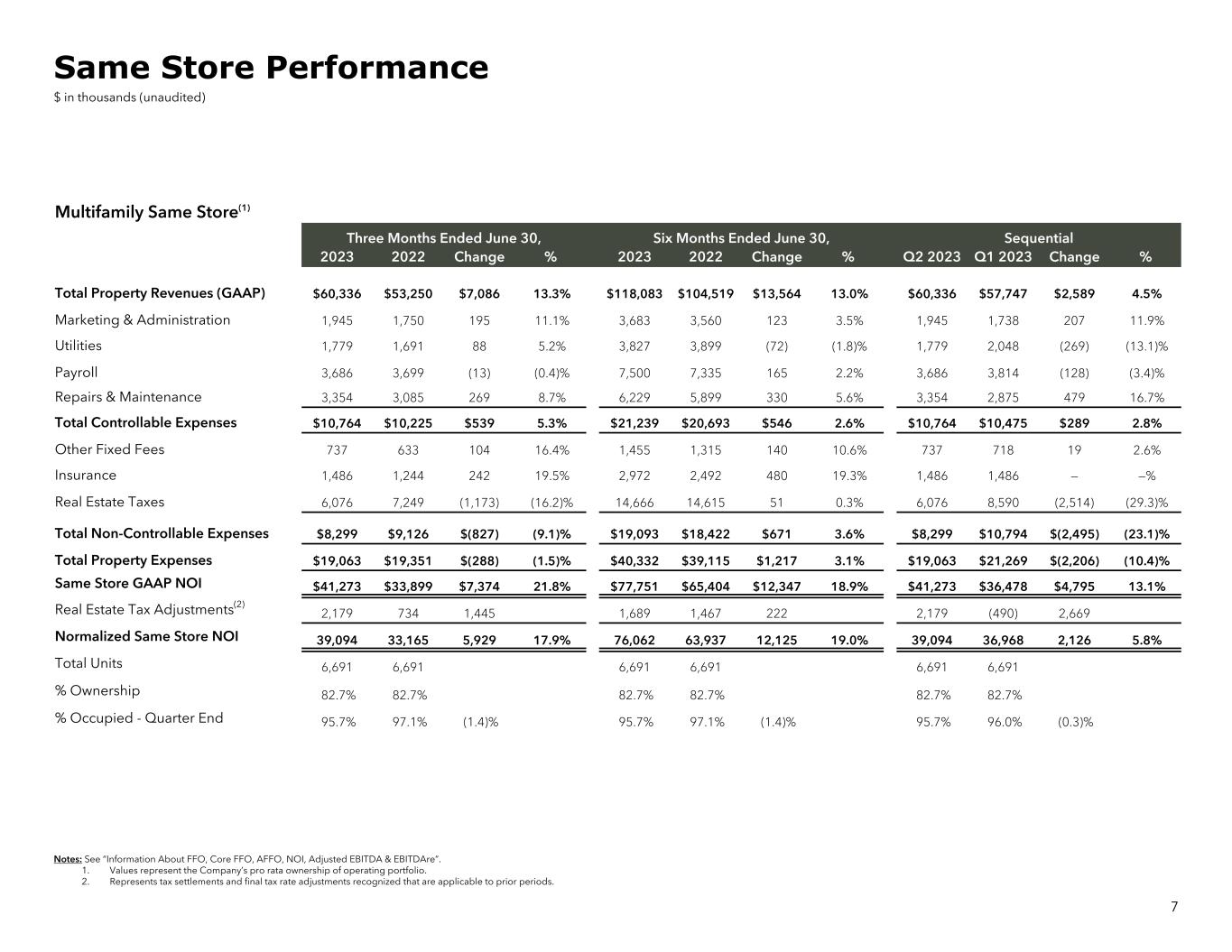 Multifamily Same Store(1) Three Months Ended June 30, Six Months Ended June 30, Sequential 2023 2022 Change % 2023 2022 Change % Q2 2023 Q1 2023 Change % Total Property Revenues (GAAP) $60,336 $53,250 $7,086 13.3% $118,083 $104,519 $13,564 13.0% $60,336 $57,747 $2,589 4.5% Marketing & Administration 1,945 1,750 195 11.1% 3,683 3,560 123 3.5% 1,945 1,738 207 11.9% Utilities 1,779 1,691 88 5.2% 3,827 3,899 (72) (1.8)% 1,779 2,048 (269) (13.1)% Payroll 3,686 3,699 (13) (0.4)% 7,500 7,335 165 2.2% 3,686 3,814 (128) (3.4)% Repairs & Maintenance 3,354 3,085 269 8.7% 6,229 5,899 330 5.6% 3,354 2,875 479 16.7% Total Controllable Expenses $10,764 $10,225 $539 5.3% $21,239 $20,693 $546 2.6% $10,764 $10,475 $289 2.8% Other Fixed Fees 737 633 104 16.4% 1,455 1,315 140 10.6% 737 718 19 2.6% Insurance 1,486 1,244 242 19.5% 2,972 2,492 480 19.3% 1,486 1,486 — —% Real Estate Taxes 6,076 7,249 (1,173) (16.2)% 14,666 14,615 51 0.3% 6,076 8,590 (2,514) (29.3)% Total Non-Controllable Expenses $8,299 $9,126 $(827) (9.1)% $19,093 $18,422 $671 3.6% $8,299 $10,794 $(2,495) (23.1)% Total Property Expenses $19,063 $19,351 $(288) (1.5)% $40,332 $39,115 $1,217 3.1% $19,063 $21,269 $(2,206) (10.4)% Same Store GAAP NOI $41,273 $33,899 $7,374 21.8% $77,751 $65,404 $12,347 18.9% $41,273 $36,478 $4,795 13.1% Real Estate Tax Adjustments(2) 2,179 734 1,445 1,689 1,467 222 2,179 (490) 2,669 Normalized Same Store NOI 39,094 33,165 5,929 17.9% 76,062 63,937 12,125 19.0% 39,094 36,968 2,126 5.8% Total Units 6,691 6,691 6,691 6,691 6,691 6,691 % Ownership 82.7% 82.7% 82.7% 82.7% 82.7% 82.7% % Occupied - Quarter End 95.7% 97.1% (1.4)% 95.7% 97.1% (1.4)% 95.7% 96.0% (0.3)% Notes: See “Information About FFO, Core FFO, AFFO, NOI, Adjusted EBITDA & EBITDAre”. 1. Values represent the Company’s pro rata ownership of operating portfolio. 2. Represents tax settlements and final tax rate adjustments recognized that are applicable to prior periods. 7 Same Store Performance $ in thousands (unaudited)