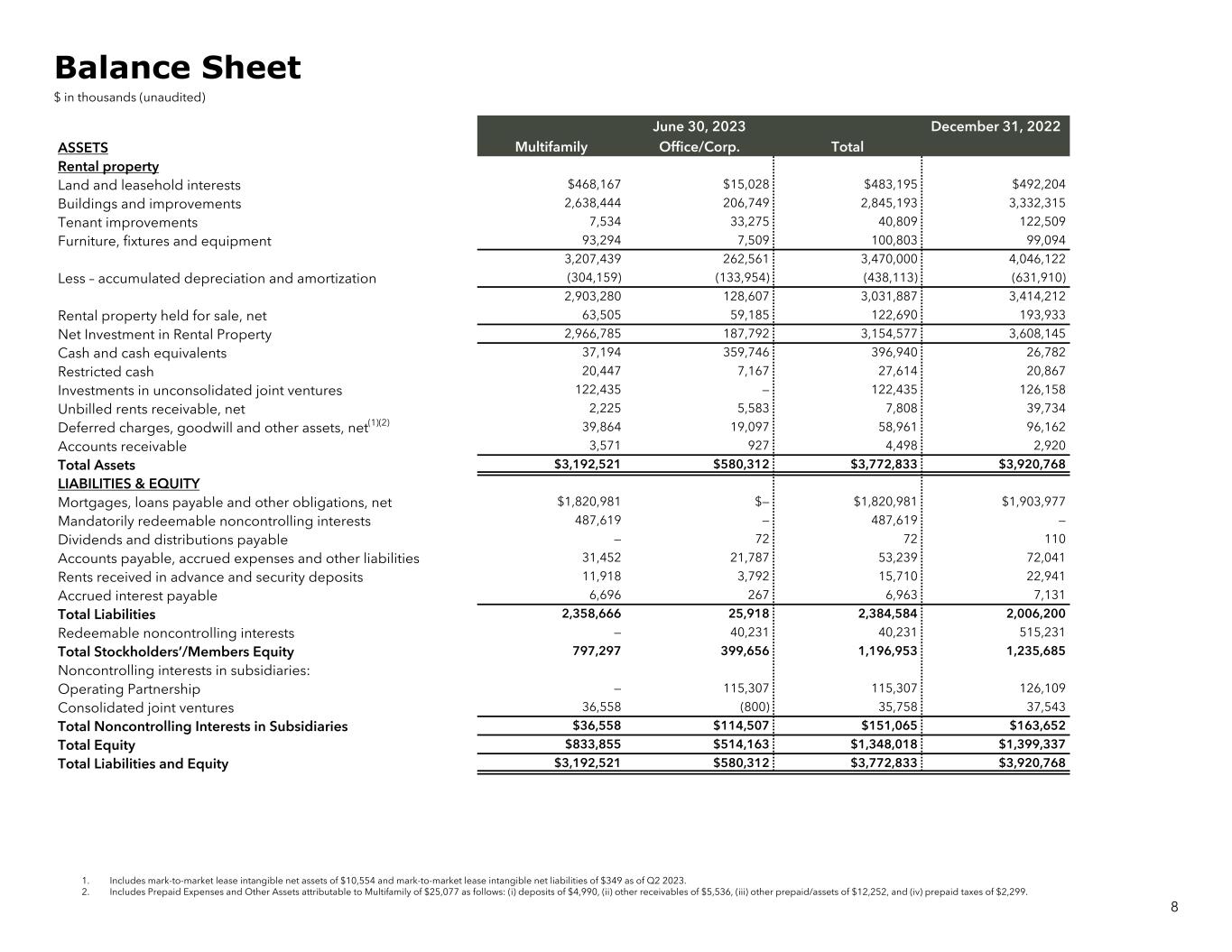 1. Includes mark-to-market lease intangible net assets of $10,554 and mark-to-market lease intangible net liabilities of $349 as of Q2 2023. 2. Includes Prepaid Expenses and Other Assets attributable to Multifamily of $25,077 as follows: (i) deposits of $4,990, (ii) other receivables of $5,536, (iii) other prepaid/assets of $12,252, and (iv) prepaid taxes of $2,299. June 30, 2023 December 31, 2022 ASSETS Multifamily Office/Corp. Total Rental property Land and leasehold interests $468,167 $15,028 $483,195 $492,204 Buildings and improvements 2,638,444 206,749 2,845,193 3,332,315 Tenant improvements 7,534 33,275 40,809 122,509 Furniture, fixtures and equipment 93,294 7,509 100,803 99,094 3,207,439 262,561 3,470,000 4,046,122 Less – accumulated depreciation and amortization (304,159) (133,954) (438,113) (631,910) 2,903,280 128,607 3,031,887 3,414,212 Rental property held for sale, net 63,505 59,185 122,690 193,933 Net Investment in Rental Property 2,966,785 187,792 3,154,577 3,608,145 Cash and cash equivalents 37,194 359,746 396,940 26,782 Restricted cash 20,447 7,167 27,614 20,867 Investments in unconsolidated joint ventures 122,435 — 122,435 126,158 Unbilled rents receivable, net 2,225 5,583 7,808 39,734 Deferred charges, goodwill and other assets, net(1)(2) 39,864 19,097 58,961 96,162 Accounts receivable 3,571 927 4,498 2,920 Total Assets $3,192,521 $580,312 $3,772,833 $3,920,768 LIABILITIES & EQUITY Mortgages, loans payable and other obligations, net $1,820,981 $— $1,820,981 $1,903,977 Mandatorily redeemable noncontrolling interests 487,619 — 487,619 — Dividends and distributions payable — 72 72 110 Accounts payable, accrued expenses and other liabilities 31,452 21,787 53,239 72,041 Rents received in advance and security deposits 11,918 3,792 15,710 22,941 Accrued interest payable 6,696 267 6,963 7,131 Total Liabilities 2,358,666 25,918 2,384,584 2,006,200 Redeemable noncontrolling interests — 40,231 40,231 515,231 Total Stockholders’/Members Equity 797,297 399,656 1,196,953 1,235,685 Noncontrolling interests in subsidiaries: Operating Partnership — 115,307 115,307 126,109 Consolidated joint ventures 36,558 (800) 35,758 37,543 Total Noncontrolling Interests in Subsidiaries $36,558 $114,507 $151,065 $163,652 Total Equity $833,855 $514,163 $1,348,018 $1,399,337 Total Liabilities and Equity $3,192,521 $580,312 $3,772,833 $3,920,768 8 Balance Sheet $ in thousands (unaudited)