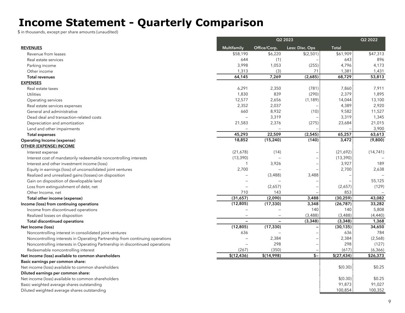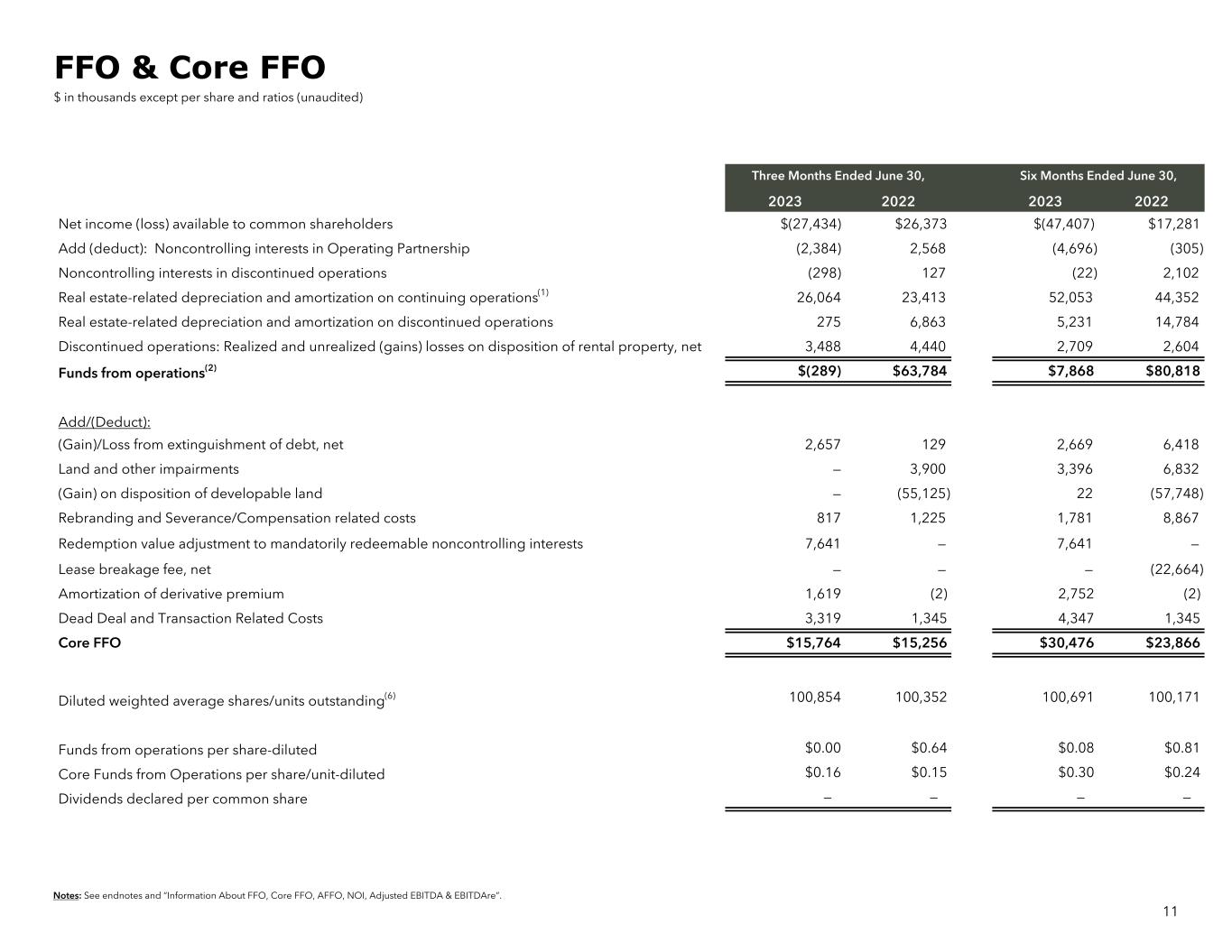 Six Months Ended June 30, 2023 Six Months Ended June 30, 2022 REVENUES Multifamily Office/Corp. Less: Disc. Ops Total All Operations Less: Disc. Ops Total Revenue from leases $114,289 $25,943 $(18,485) $121,747 $135,844 $(44,588) $91,256 Real estate services 1,555 (1) — 1,554 1,807 — 1,807 Parking income 7,726 1,703 (300) 9,129 8,930 (1,170) 7,760 Hotel income 594 — (594) — 5,954 (5,954) — Other income 2,259 953 46 3,258 27,936 (25,445) 2,491 Total revenues 126,423 28,598 (19,333) 135,688 180,471 (77,157) 103,314 EXPENSES Real estate taxes 16,067 6,776 (3,863) 18,980 24,919 (8,718) 16,201 Utilities 3,921 1,922 (961) 4,882 7,410 (3,163) 4,247 Operating services 25,810 6,434 (5,937) 26,307 37,449 (11,485) 25,964 Real estate services expenses 4,249 2,083 — 6,332 5,283 — 5,283 General and administrative 2,014 17,891 (40) 19,865 31,059 (83) 30,976 Dead deal and transaction-related costs — 4,347 — 4,347 1,345 — 1,345 Depreciation and amortization 43,089 9,624 (5,382) 47,331 54,542 (15,086) 39,456 Land and other impairments 3,396 — — 3,396 6,832 — 6,832 Total expenses 98,546 49,077 (16,183) 131,440 168,839 (38,535) 130,304 Operating Income (expense) 27,877 (20,479) (3,150) 4,248 11,632 (38,622) (26,990) OTHER (EXPENSE) INCOME Interest expense (43,664) (864) 822 (43,706) (32,733) 6,385 (26,348) Interest cost of mandatorily redeemable noncontrolling interests (13,390) — — (13,390) — — — Interest and other investment income (loss) 29 4,042 (28) 4,043 347 — 347 Equity in earnings (loss) of unconsolidated joint ventures 2,633 — — 2,633 2,151 — 2,151 Realized and unrealized gains (losses) on disposition 780 (3,489) 2,709 — (2,604) 2,604 — Gain on disposition of developable land — (22) — (22) 57,748 — 57,748 Gain (loss) from extinguishment of debt, net (12) (2,657) 12 (2,657) (6,418) 6,289 (129) Other Income, net 2,708 143 — 2,851 — — — Total other income (expense) (50,916) (2,847) 3,515 (50,248) 18,491 15,278 33,769 Income from continuing operations (23,039) (23,326) 365 (46,000) 30,123 (23,344) 6,779 Income from discontinued operations — — 2,344 2,344 — 25,948 25,948 Realized gains (losses) on disposition — — (2,709) (2,709) — (2,604) (2,604) Total discontinued operations — — (365) (365) — 23,344 23,344 Net Income (23,039) (23,326) — (46,365) 30,123 — 30,123 Noncontrolling interest in consolidated joint ventures 1,223 — — 1,223 1,758 — 1,758 Noncontrolling interests in Operating Partnership from continuing operations — 4,696 — 4,696 305 — 305 Noncontrolling interests in Operating Partnership in discontinued operations — 22 — 22 (2,102) — (2,102) Redeemable noncontrolling interest (6,283) (700) — (6,983) (12,803) — (12,803) Net income (loss) available to common shareholders $(28,099) $(19,308) $— $(47,407) $17,281 $— $17,281 Basic earnings per common share: Net income (loss) available to common shareholders $(0.56) $0.12 Diluted earnings per common share: Net income (loss) available to common shareholders $(0.56) $0.12 Basic weighted average shares outstanding 91,551 90,989 Diluted weighted average shares outstanding 100,691 100,171 10 Income Statement - Year-to-Date Comparison $ in thousands, except per share amounts (unaudited)