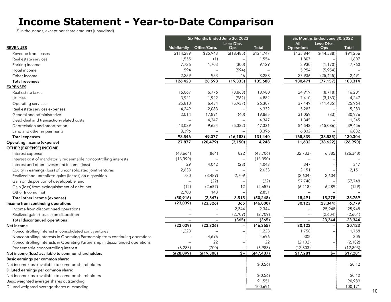 Q2 2023 Q2 2022 REVENUES Multifamily Office/Corp. Less: Disc. Ops Total Revenue from leases $58,190 $6,220 $(2,501) $61,909 $47,313 Real estate services 644 (1) — 643 896 Parking income 3,998 1,053 (255) 4,796 4,173 Other income 1,313 (3) 71 1,381 1,431 Total revenues 64,145 7,269 (2,685) 68,729 53,813 EXPENSES Real estate taxes 6,291 2,350 (781) 7,860 7,911 Utilities 1,830 839 (290) 2,379 1,895 Operating services 12,577 2,656 (1,189) 14,044 13,100 Real estate services expenses 2,352 2,037 — 4,389 2,920 General and administrative 660 8,932 (10) 9,582 11,527 Dead deal and transaction-related costs — 3,319 — 3,319 1,345 Depreciation and amortization 21,583 2,376 (275) 23,684 21,015 Land and other impairments — — — — 3,900 Total expenses 45,293 22,509 (2,545) 65,257 63,613 Operating Income (expense) 18,852 (15,240) (140) 3,472 (9,800) OTHER (EXPENSE) INCOME Interest expense (21,678) (14) — (21,692) (14,741) Interest cost of mandatorily redeemable noncontrolling interests (13,390) — — (13,390) — Interest and other investment income (loss) 1 3,926 — 3,927 189 Equity in earnings (loss) of unconsolidated joint ventures 2,700 — — 2,700 2,638 Realized and unrealized gains (losses) on disposition — (3,488) 3,488 — — Gain on disposition of developable land — — — — 55,125 Loss from extinguishment of debt, net — (2,657) — (2,657) (129) Other Income, net 710 143 — 853 — Total other income (expense) (31,657) (2,090) 3,488 (30,259) 43,082 Income (loss) from continuing operations (12,805) (17,330) 3,348 (26,787) 33,282 Income from discontinued operations — — 140 140 5,808 Realized losses on disposition — — (3,488) (3,488) (4,440) Total discontinued operations — — (3,348) (3,348) 1,368 Net Income (loss) (12,805) (17,330) — (30,135) 34,650 Noncontrolling interest in consolidated joint ventures 636 — — 636 784 Noncontrolling interests in Operating Partnership from continuing operations — 2,384 — 2,384 (2,568) Noncontrolling interests in Operating Partnership in discontinued operations — 298 — 298 (127) Redeemable noncontrolling interest (267) (350) — (617) (6,366) Net income (loss) available to common shareholders $(12,436) $(14,998) $— $(27,434) $26,373 Basic earnings per common share: Net income (loss) available to common shareholders $(0.30) $0.25 Diluted earnings per common share: Net income (loss) available to common shareholders $(0.30) $0.25 Basic weighted average shares outstanding 91,873 91,027 Diluted weighted average shares outstanding 100,854 100,352 9 Income Statement - Quarterly Comparison $ in thousands, except per share amounts (unaudited)