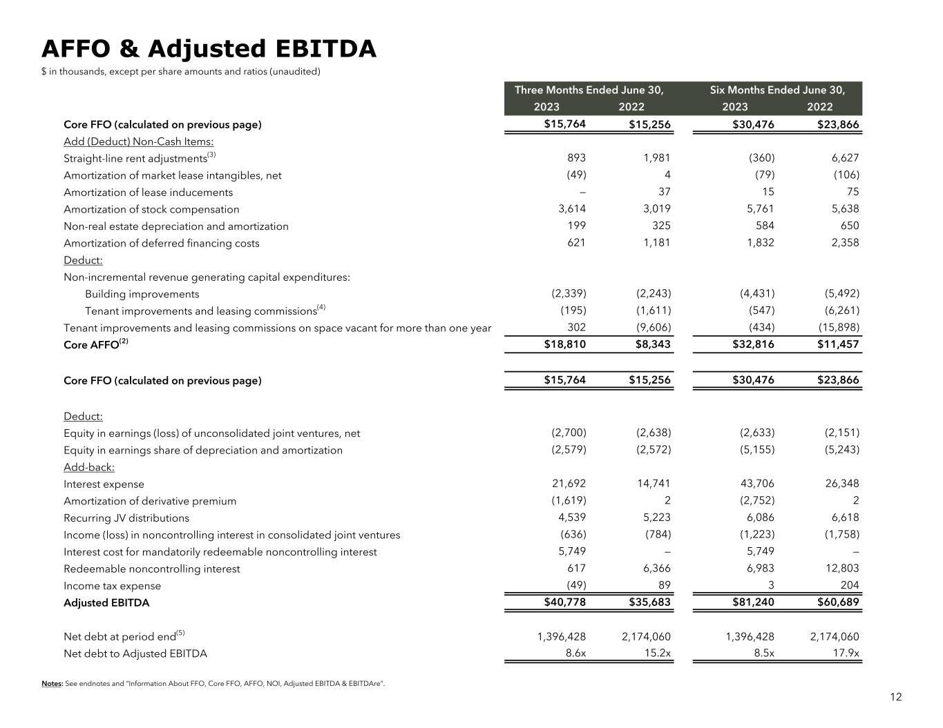 Notes: See endnotes and “Information About FFO, Core FFO, AFFO, NOI, Adjusted EBITDA & EBITDAre”. Three Months Ended June 30, Six Months Ended June 30, 2023 2022 2023 2022 Net income (loss) available to common shareholders $(27,434) $26,373 $(47,407) $17,281 Add (deduct): Noncontrolling interests in Operating Partnership (2,384) 2,568 (4,696) (305) Noncontrolling interests in discontinued operations (298) 127 (22) 2,102 Real estate-related depreciation and amortization on continuing operations(1) 26,064 23,413 52,053 44,352 Real estate-related depreciation and amortization on discontinued operations 275 6,863 5,231 14,784 Discontinued operations: Realized and unrealized (gains) losses on disposition of rental property, net 3,488 4,440 2,709 2,604 Funds from operations(2) $(289) $63,784 $7,868 $80,818 Add/(Deduct): (Gain)/Loss from extinguishment of debt, net 2,657 129 2,669 6,418 Land and other impairments — 3,900 3,396 6,832 (Gain) on disposition of developable land — (55,125) 22 (57,748) Rebranding and Severance/Compensation related costs 817 1,225 1,781 8,867 Redemption value adjustment to mandatorily redeemable noncontrolling interests 7,641 — 7,641 — Lease breakage fee, net — — — (22,664) Amortization of derivative premium 1,619 (2) 2,752 (2) Dead Deal and Transaction Related Costs 3,319 1,345 4,347 1,345 Core FFO $15,764 $15,256 $30,476 $23,866 Diluted weighted average shares/units outstanding(6) 100,854 100,352 100,691 100,171 Funds from operations per share-diluted $0.00 $0.64 $0.08 $0.81 Core Funds from Operations per share/unit-diluted $0.16 $0.15 $0.30 $0.24 Dividends declared per common share — — — — FFO & Core FFO $ in thousands except per share and ratios (unaudited) 11