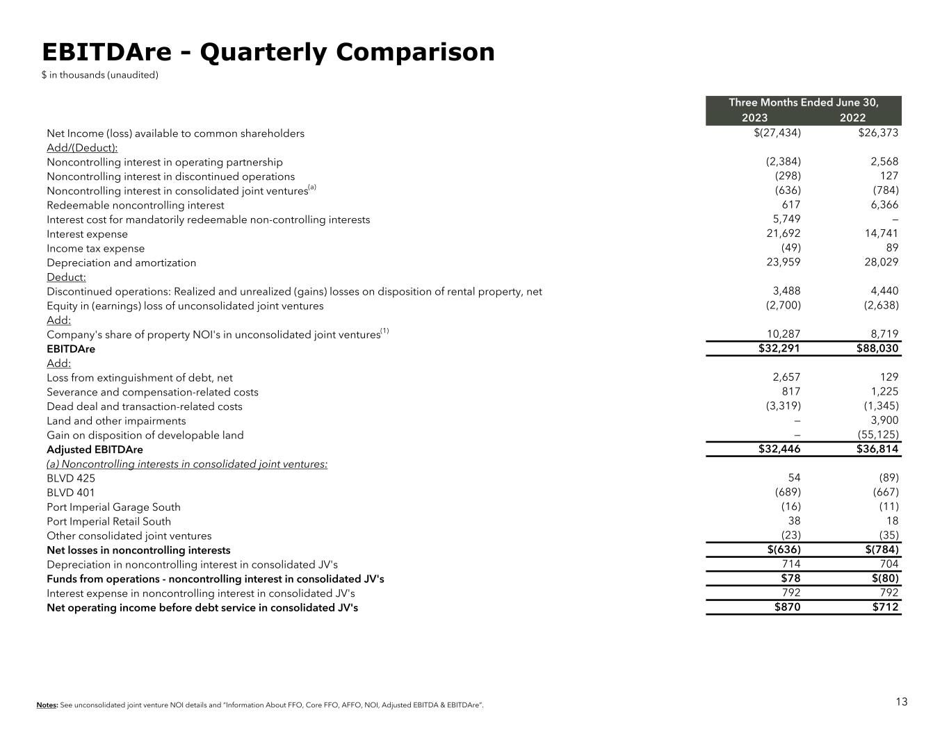 Notes: See endnotes and “Information About FFO, Core FFO, AFFO, NOI, Adjusted EBITDA & EBITDAre”. 12 Three Months Ended June 30, Six Months Ended June 30, 2023 2022 2023 2022 Core FFO (calculated on previous page) $15,764 $15,256 $30,476 $23,866 Add (Deduct) Non-Cash Items: Straight-line rent adjustments(3) 893 1,981 (360) 6,627 Amortization of market lease intangibles, net (49) 4 (79) (106) Amortization of lease inducements — 37 15 75 Amortization of stock compensation 3,614 3,019 5,761 5,638 Non-real estate depreciation and amortization 199 325 584 650 Amortization of deferred financing costs 621 1,181 1,832 2,358 Deduct: Non-incremental revenue generating capital expenditures: Building improvements (2,339) (2,243) (4,431) (5,492) Tenant improvements and leasing commissions(4) (195) (1,611) (547) (6,261) Tenant improvements and leasing commissions on space vacant for more than one year 302 (9,606) (434) (15,898) Core AFFO(2) $18,810 $8,343 $32,816 $11,457 Core FFO (calculated on previous page) $15,764 $15,256 $30,476 $23,866 Deduct: Equity in earnings (loss) of unconsolidated joint ventures, net (2,700) (2,638) (2,633) (2,151) Equity in earnings share of depreciation and amortization (2,579) (2,572) (5,155) (5,243) Add-back: Interest expense 21,692 14,741 43,706 26,348 Amortization of derivative premium (1,619) 2 (2,752) 2 Recurring JV distributions 4,539 5,223 6,086 6,618 Income (loss) in noncontrolling interest in consolidated joint ventures (636) (784) (1,223) (1,758) Interest cost for mandatorily redeemable noncontrolling interest 5,749 — 5,749 — Redeemable noncontrolling interest 617 6,366 6,983 12,803 Income tax expense (49) 89 3 204 Adjusted EBITDA $40,778 $35,683 $81,240 $60,689 Net debt at period end(5) 1,396,428 2,174,060 1,396,428 2,174,060 Net debt to Adjusted EBITDA 8.6x 15.2x 8.5x 17.9x AFFO & Adjusted EBITDA $ in thousands, except per share amounts and ratios (unaudited)