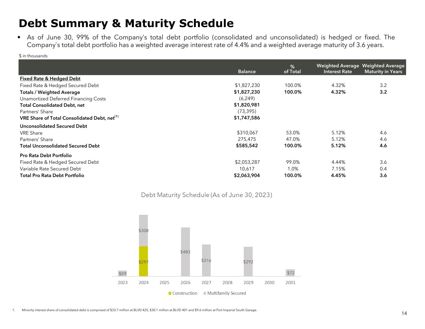 • As of June 30, 99% of the Company’s total debt portfolio (consolidated and unconsolidated) is hedged or fixed. The Company`s total debt portfolio has a weighted average interest rate of 4.4% and a weighted average maturity of 3.6 years. $ in thousands 14 Balance % of Total Weighted Average Interest Rate Weighted Average Maturity in Years Fixed Rate & Hedged Debt Fixed Rate & Hedged Secured Debt $1,827,230 100.0% 4.32% 3.2 Totals / Weighted Average $1,827,230 100.0% 4.32% 3.2 Unamortized Deferred Financing Costs (6,249) Total Consolidated Debt, net $1,820,981 Partners’ Share (73,395) VRE Share of Total Consolidated Debt, net(1) $1,747,586 Unconsolidated Secured Debt VRE Share $310,067 53.0% 5.12% 4.6 Partners’ Share 275,475 47.0% 5.12% 4.6 Total Unconsolidated Secured Debt $585,542 100.0% 5.12% 4.6 Pro Rata Debt Portfolio Fixed Rate & Hedged Secured Debt $2,053,287 99.0% 4.44% 3.6 Variable Rate Secured Debt 10,617 1.0% 7.15% 0.4 Total Pro Rata Debt Portfolio $2,063,904 100.0% 4.45% 3.6 Debt Summary & Maturity Schedule 1. Minority interest share of consolidated debt is comprised of $33.7 million at BLVD 425, $30.1 million at BLVD 401 and $9.6 million at Port Imperial South Garage.