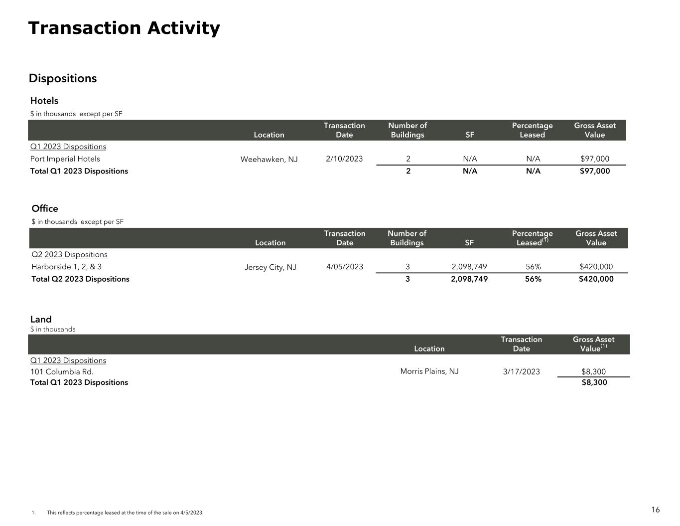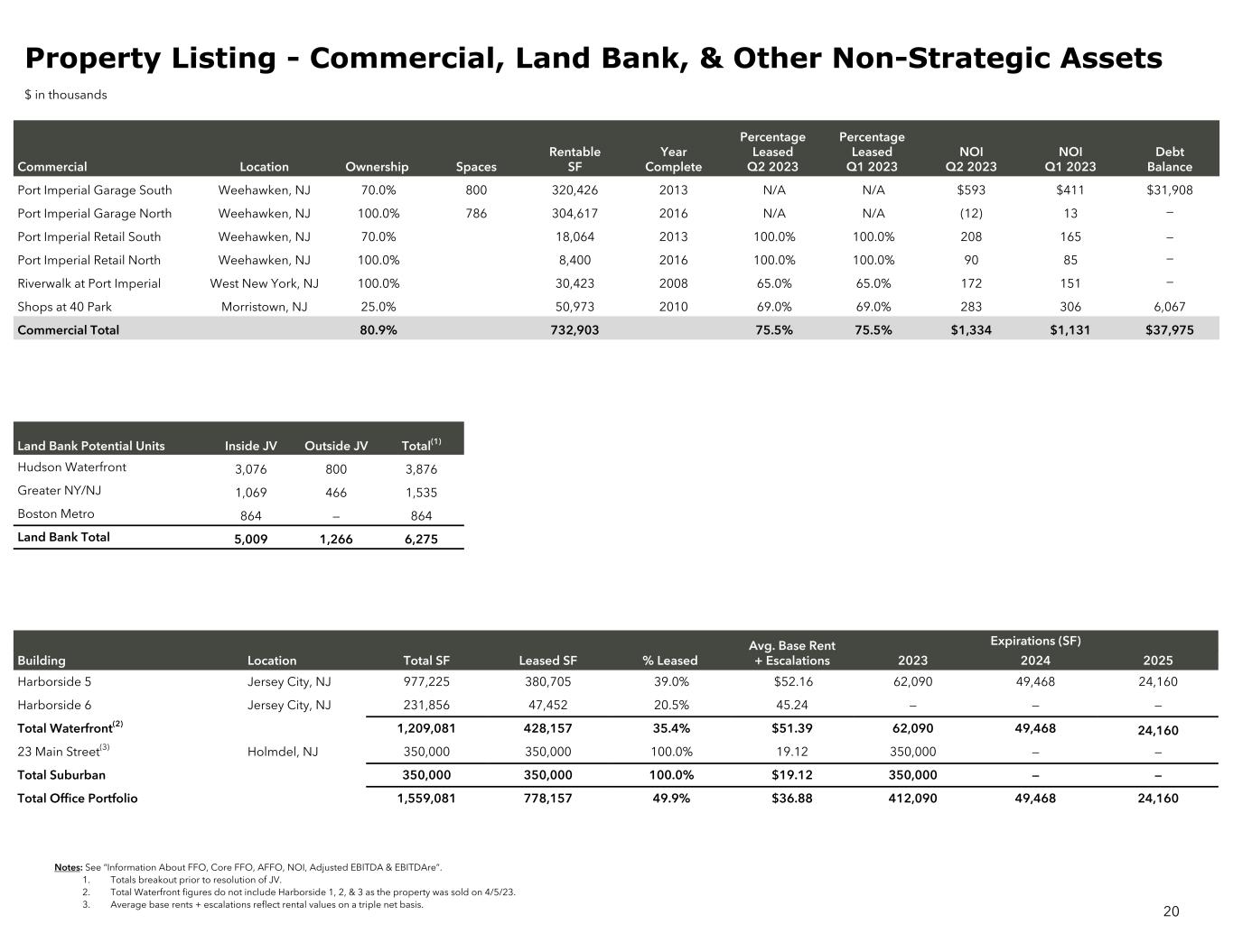 Commercial Location Ownership Spaces Rentable SF Year Complete Percentage Leased Q2 2023 Percentage Leased Q1 2023 NOI Q2 2023 NOI Q1 2023 Debt Balance Port Imperial Garage South Weehawken, NJ 70.0% 800 320,426 2013 N/A N/A $593 $411 $31,908 Port Imperial Garage North Weehawken, NJ 100.0% 786 304,617 2016 N/A N/A (12) 13 — Port Imperial Retail South Weehawken, NJ 70.0% 18,064 2013 100.0% 100.0% 208 165 — Port Imperial Retail North Weehawken, NJ 100.0% 8,400 2016 100.0% 100.0% 90 85 — Riverwalk at Port Imperial West New York, NJ 100.0% 30,423 2008 65.0% 65.0% 172 151 — Shops at 40 Park Morristown, NJ 25.0% 50,973 2010 69.0% 69.0% 283 306 6,067 Commercial Total 80.9% 732,903 75.5% 75.5% $1,334 $1,131 $37,975 Notes: See “Information About FFO, Core FFO, AFFO, NOI, Adjusted EBITDA & EBITDAre”. 1. Totals breakout prior to resolution of JV. 2. Total Waterfront figures do not include Harborside 1, 2, & 3 as the property was sold on 4/5/23. 3. Average base rents + escalations reflect rental values on a triple net basis. 20 Property Listing - Commercial, Land Bank, & Other Non-Strategic Assets $ in thousands Land Bank Potential Units Inside JV Outside JV Total(1) Hudson Waterfront 3,076 800 3,876 Greater NY/NJ 1,069 466 1,535 Boston Metro 864 — 864 Land Bank Total 5,009 1,266 6,275 Avg. Base Rent + Escalations Expirations (SF) Building Location Total SF Leased SF % Leased 2023 2024 2025 Harborside 5 Jersey City, NJ 977,225 380,705 39.0% $52.16 62,090 49,468 24,160 Harborside 6 Jersey City, NJ 231,856 47,452 20.5% 45.24 — — — Total Waterfront(2) 1,209,081 428,157 35.4% $51.39 62,090 49,468 24,160 23 Main Street(3) Holmdel, NJ 350,000 350,000 100.0% 19.12 350,000 — — Total Suburban 350,000 350,000 100.0% $19.12 350,000 — — Total Office Portfolio 1,559,081 778,157 49.9% $36.88 412,090 49,468 24,160