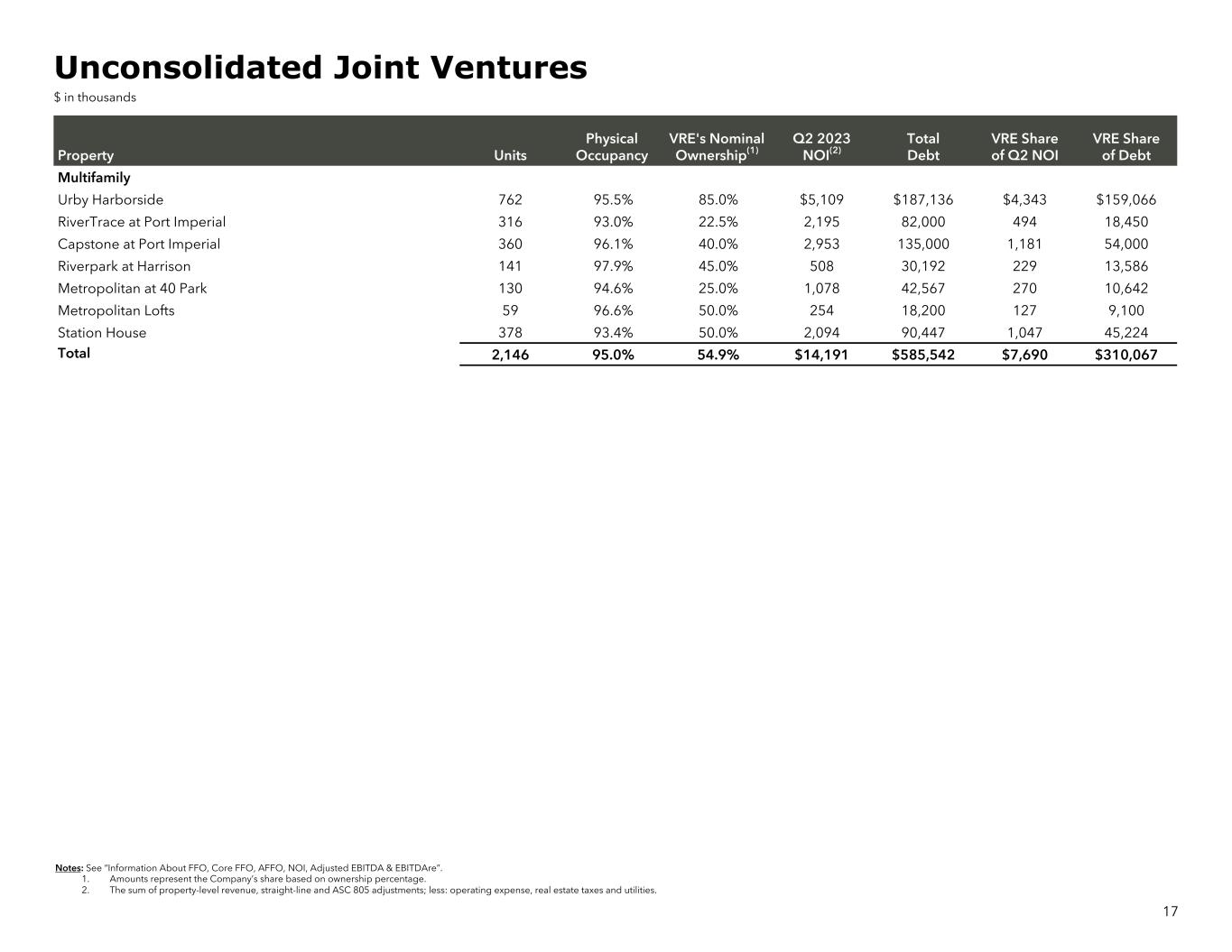 Property Units Physical Occupancy VRE's Nominal Ownership(1) Q2 2023 NOI(2) Total Debt VRE Share of Q2 NOI VRE Share of Debt Multifamily Urby Harborside 762 95.5% 85.0% $5,109 $187,136 $4,343 $159,066 RiverTrace at Port Imperial 316 93.0% 22.5% 2,195 82,000 494 18,450 Capstone at Port Imperial 360 96.1% 40.0% 2,953 135,000 1,181 54,000 Riverpark at Harrison 141 97.9% 45.0% 508 30,192 229 13,586 Metropolitan at 40 Park 130 94.6% 25.0% 1,078 42,567 270 10,642 Metropolitan Lofts 59 96.6% 50.0% 254 18,200 127 9,100 Station House 378 93.4% 50.0% 2,094 90,447 1,047 45,224 Total 2,146 95.0% 54.9% $14,191 $585,542 $7,690 $310,067 Notes: See “Information About FFO, Core FFO, AFFO, NOI, Adjusted EBITDA & EBITDAre”. 1. Amounts represent the Company’s share based on ownership percentage. 2. The sum of property-level revenue, straight-line and ASC 805 adjustments; less: operating expense, real estate taxes and utilities. 17 Unconsolidated Joint Ventures $ in thousands