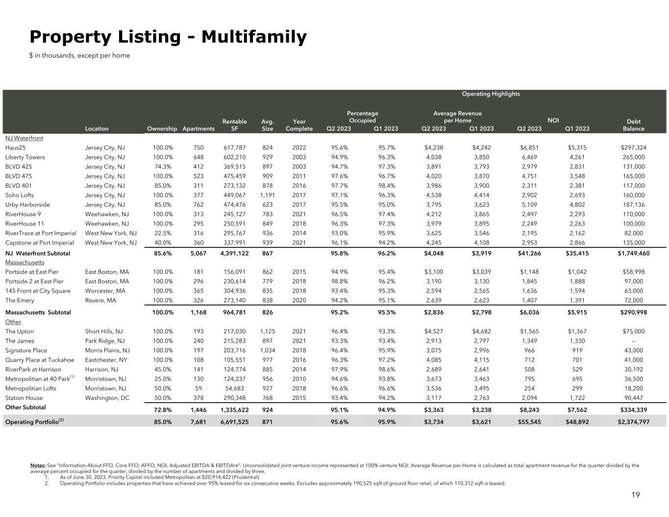 Operating Highlights Rentable SF Avg. Size Year Complete Percentage Occupied Average Revenue per Home NOI Debt BalanceLocation Ownership Apartments Q2 2023 Q1 2023 Q2 2023 Q1 2023 Q2 2023 Q1 2023 NJ Waterfront Haus25 Jersey City, NJ 100.0% 750 617,787 824 2022 95.6% 95.7% $4,238 $4,242 $6,851 $5,315 $297,324 Liberty Towers Jersey City, NJ 100.0% 648 602,210 929 2003 94.9% 96.3% 4,038 3,850 6,469 4,261 265,000 BLVD 425 Jersey City, NJ 74.3% 412 369,515 897 2003 94.7% 97.3% 3,891 3,793 2,979 2,831 131,000 BLVD 475 Jersey City, NJ 100.0% 523 475,459 909 2011 97.6% 96.7% 4,020 3,870 4,751 3,548 165,000 BLVD 401 Jersey City, NJ 85.0% 311 273,132 878 2016 97.7% 98.4% 3,986 3,900 2,311 2,381 117,000 Soho Lofts Jersey City, NJ 100.0% 377 449,067 1,191 2017 97.1% 96.3% 4,538 4,414 2,902 2,693 160,000 Urby Harborside Jersey City, NJ 85.0% 762 474,476 623 2017 95.5% 95.0% 3,795 3,623 5,109 4,802 187,136 RiverHouse 9 Weehawken, NJ 100.0% 313 245,127 783 2021 96.5% 97.4% 4,212 3,865 2,497 2,293 110,000 RiverHouse 11 Weehawken, NJ 100.0% 295 250,591 849 2018 96.3% 97.3% 3,979 3,895 2,249 2,263 100,000 RiverTrace at Port Imperial West New York, NJ 22.5% 316 295,767 936 2014 93.0% 95.9% 3,625 3,546 2,195 2,162 82,000 Capstone at Port Imperial West New York, NJ 40.0% 360 337,991 939 2021 96.1% 94.2% 4,245 4,108 2,953 2,866 135,000 NJ Waterfront Subtotal 85.6% 5,067 4,391,122 867 95.8% 96.2% $4,048 $3,919 $41,266 $35,415 $1,749,460 Massachusetts Portside at East Pier East Boston, MA 100.0% 181 156,091 862 2015 94.9% 95.4% $3,100 $3,039 $1,148 $1,042 $58,998 Portside 2 at East Pier East Boston, MA 100.0% 296 230,614 779 2018 98.8% 96.2% 3,190 3,130 1,845 1,888 97,000 145 Front at City Square Worcester, MA 100.0% 365 304,936 835 2018 93.4% 95.3% 2,594 2,565 1,636 1,594 63,000 The Emery Revere, MA 100.0% 326 273,140 838 2020 94.2% 95.1% 2,639 2,623 1,407 1,391 72,000 Massachusetts Subtotal 100.0% 1,168 964,781 826 95.2% 95.5% $2,836 $2,798 $6,036 $5,915 $290,998 Other The Upton Short Hills, NJ 100.0% 193 217,030 1,125 2021 96.4% 93.3% $4,527 $4,682 $1,565 $1,367 $75,000 The James Park Ridge, NJ 100.0% 240 215,283 897 2021 93.3% 93.4% 2,913 2,797 1,349 1,330 — Signature Place Morris Plains, NJ 100.0% 197 203,716 1,034 2018 96.4% 95.9% 3,075 2,996 966 919 43,000 Quarry Place at Tuckahoe Eastchester, NY 100.0% 108 105,551 977 2016 96.3% 97.2% 4,085 4,115 712 701 41,000 RiverPark at Harrison Harrison, NJ 45.0% 141 124,774 885 2014 97.9% 98.6% 2,689 2,641 508 529 30,192 Metropolitian at 40 Park(1) Morristown, NJ 25.0% 130 124,237 956 2010 94.6% 93.8% 3,673 3,463 795 695 36,500 Metropolitian Lofts Morristown, NJ 50.0% 59 54,683 927 2018 96.6% 96.6% 3,536 3,495 254 299 18,200 Station House Washington, DC 50.0% 378 290,348 768 2015 93.4% 94.2% 3,117 2,763 2,094 1,722 90,447 Other Subtotal 72.8% 1,446 1,335,622 924 95.1% 94.9% $3,363 $3,238 $8,243 $7,562 $334,339 Operating Portfolio(2) 85.0% 7,681 6,691,525 871 95.6% 95.9% $3,734 $3,621 $55,545 $48,892 $2,374,797 Notes: See “Information About FFO, Core FFO, AFFO, NOI, Adjusted EBITDA & EBITDAre”. Unconsolidated joint venture income represented at 100% venture NOI. Average Revenue per Home is calculated as total apartment revenue for the quarter divided by the average percent occupied for the quarter, divided by the number of apartments and divided by three. 1. As of June 30, 2023, Priority Capital included Metropolitan at $20,914,422 (Prudential). 2. Operating Portfolio includes properties that have achieved over 95% leased for six consecutive weeks. Excludes approximately 190,525 sqft of ground floor retail, of which 110,312 sqft is leased. 19 Property Listing - Multifamily $ in thousands, except per home