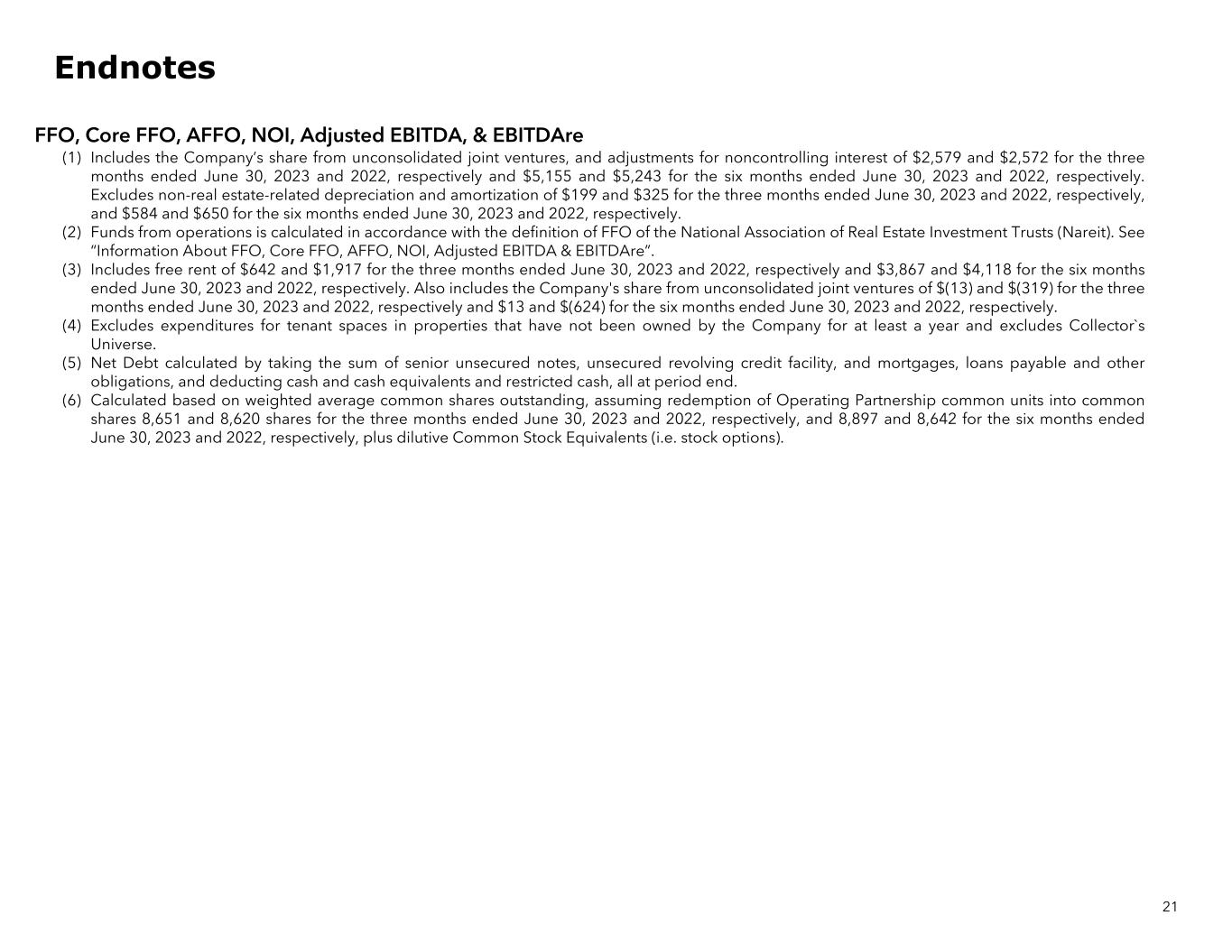 FFO, Core FFO, AFFO, NOI, Adjusted EBITDA, & EBITDAre (1) Includes the Company’s share from unconsolidated joint ventures, and adjustments for noncontrolling interest of $2,579 and $2,572 for the three months ended June 30, 2023 and 2022, respectively and $5,155 and $5,243 for the six months ended June 30, 2023 and 2022, respectively. Excludes non-real estate-related depreciation and amortization of $199 and $325 for the three months ended June 30, 2023 and 2022, respectively, and $584 and $650 for the six months ended June 30, 2023 and 2022, respectively. (2) Funds from operations is calculated in accordance with the definition of FFO of the National Association of Real Estate Investment Trusts (Nareit). See “Information About FFO, Core FFO, AFFO, NOI, Adjusted EBITDA & EBITDAre”. (3) Includes free rent of $642 and $1,917 for the three months ended June 30, 2023 and 2022, respectively and $3,867 and $4,118 for the six months ended June 30, 2023 and 2022, respectively. Also includes the Company's share from unconsolidated joint ventures of $(13) and $(319) for the three months ended June 30, 2023 and 2022, respectively and $13 and $(624) for the six months ended June 30, 2023 and 2022, respectively. (4) Excludes expenditures for tenant spaces in properties that have not been owned by the Company for at least a year and excludes Collector`s Universe. (5) Net Debt calculated by taking the sum of senior unsecured notes, unsecured revolving credit facility, and mortgages, loans payable and other obligations, and deducting cash and cash equivalents and restricted cash, all at period end. (6) Calculated based on weighted average common shares outstanding, assuming redemption of Operating Partnership common units into common shares 8,651 and 8,620 shares for the three months ended June 30, 2023 and 2022, respectively, and 8,897 and 8,642 for the six months ended June 30, 2023 and 2022, respectively, plus dilutive Common Stock Equivalents (i.e. stock options). 21 Endnotes