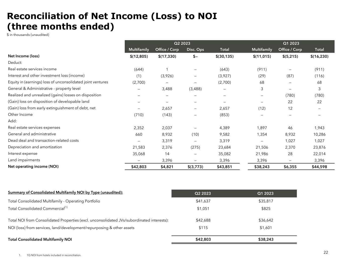 22 Q2 2023 Q1 2023 Multifamily Office / Corp Disc. Ops Total Multifamily Office / Corp Total Net Income (loss) $(12,805) $(17,330) $— $(30,135) $(11,015) $(5,215) $(16,230) Deduct: Real estate services income (644) 1 — (643) (911) — (911) Interest and other investment loss (income) (1) (3,926) — (3,927) (29) (87) (116) Equity in (earnings) loss of unconsolidated joint ventures (2,700) — — (2,700) 68 — 68 General & Administrative - property level — 3,488 (3,488) — 3 — 3 Realized and unrealized (gains) losses on disposition — — — — — (780) (780) (Gain) loss on disposition of developable land — — — — — 22 22 (Gain) loss from early extinguishment of debt, net — 2,657 — 2,657 (12) 12 — Other Income (710) (143) — (853) — — — Add: Real estate services expenses 2,352 2,037 — 4,389 1,897 46 1,943 General and administrative 660 8,932 (10) 9,582 1,354 8,932 10,286 Dead deal and transaction-related costs — 3,319 — 3,319 — 1,027 1,027 Depreciation and amortization 21,583 2,376 (275) 23,684 21,506 2,370 23,876 Interest expense 35,068 14 — 35,082 21,986 28 22,014 Land impairments — 3,396 — 3,396 3,396 — 3,396 Net operating income (NOI) $42,803 $4,821 $(3,773) $43,851 $38,243 $6,355 $44,598 Summary of Consolidated Multifamily NOI by Type (unaudited): Q2 2023 Q1 2023 Total Consolidated Multifamily - Operating Portfolio $41,637 $35,817 Total Consolidated Commercial(1) $1,051 $825 Total NOI from Consolidated Properties (excl. unconsolidated JVs/subordinated interests): $42,688 $36,642 NOI (loss) from services, land/development/repurposing & other assets $115 $1,601 Total Consolidated Multifamily NOI $42,803 $38,243 Reconciliation of Net Income (Loss) to NOI (three months ended) $ in thousands (unaudited) 1. 1Q NOI from hotels included in reconciliation.