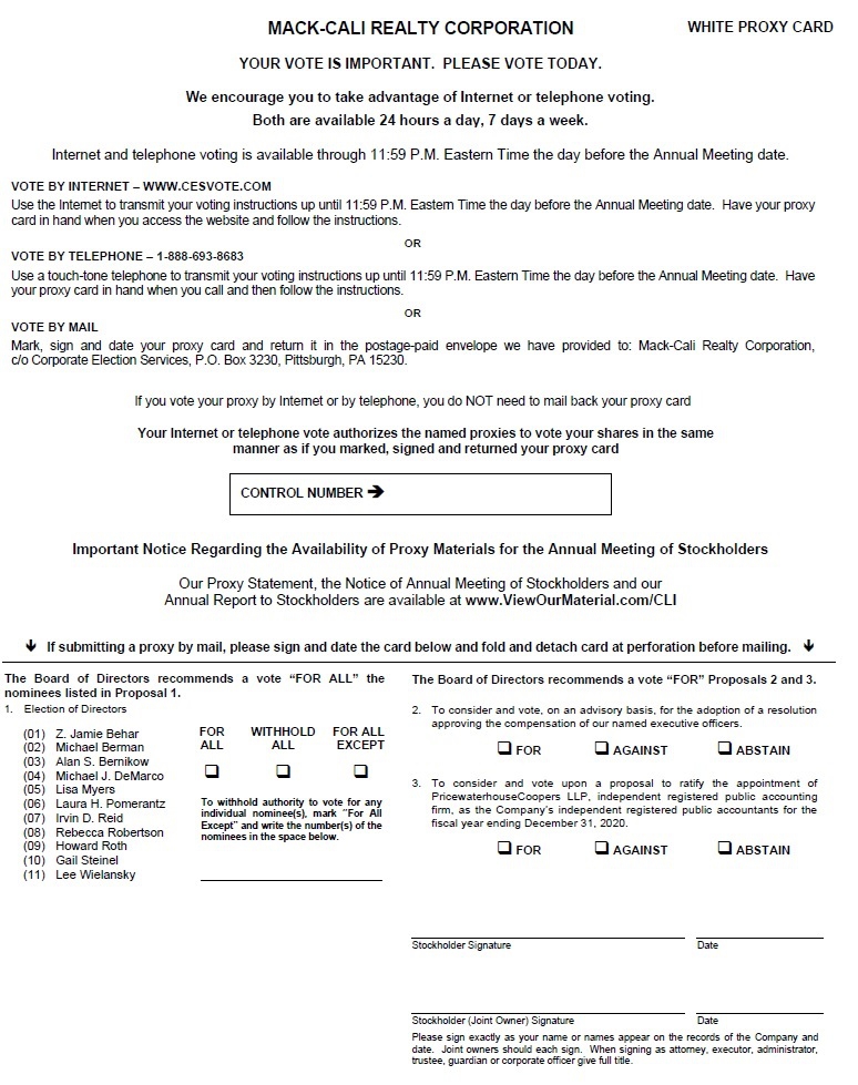 MACK-CALI REALTY CORPORATION WHITE PROXY CARD YOUR VOTE IS IMPORTANT. PLEASE VOTE TODAY. We encourage you to take advantage of Internet or telephone voting. Both are available 24 hours a day, 7 days a week. Internet and telephone voting is available through 11:59 P.M. Eastern Time the day before the Annual Meeting date. VOTE BY INTERNET – WWW.CESVOTE.COM Use the Internet to transmit your voting instructions up until 11:59 P.M. Eastern Time the day before the Annual Meeting date. Have your proxy card in hand when you access the website and follow the instructions. OR VOTE BY TELEPHONE – 1-888-693-8683 Use a touch-tone telephone to transmit your voting instructions up until 11:59 P.M. Eastern Time the day before the Annual Meeting date. Have your proxy card in hand when you call and then follow the instructions. OR VOTE BY MAIL Mark, sign and date your proxy card and return it in the postage-paid envelope we have provided to: Mack-Cali Realty Corporation, c/o Corporate Election Services, P.O. Box 3230, Pittsburgh, PA 15230. If you vote your proxy by Internet or by telephone, you do NOT need to mail back your proxy card Your Internet or telephone vote authorizes the named proxies to vote your shares in the same manner as if you marked, signed and returned your proxy card Important Notice Regarding the Availability of Proxy Materials for the Annual Meeting of Stockholders Our Proxy Statement, the Notice of Annual Meeting of Stockholders and our Annual Report to Stockholders are available at www.ViewOurMaterial.com/CLI If submitting a proxy by mail, please sign and date the card below and fold and detach card at perforation before mailing. The Board of Directors recommends nominees listed in Proposal 1. 1. Election of Directors a vote “FOR ALL” the The Board of Directors recommends a vote “FOR” Proposals 2 and 3. 2. To consider and vote, on an advisory basis, for the adoption of a resolution approving the compensation of our named executive officers. FOR ALL WITHHOLD ALL FOR ALL EXCEPT (01) (02) (03) (04) (05) (06) (07) (08) (09) (10) (11) Z. Jamie Behar Michael Berman Alan S. Bernikow Michael J. DeMarco Lisa F. Myers Laura H. Pomerantz Irvin D. Reid Rebecca Robertson Howard Roth Gail Steinel Lee Wielansky FOR AGAINST ABSTAIN 3. To consider and vote upon a proposal to ratify the appointment of PricewaterhouseCoopers LLP, independent registered public accounting firm, as the Company’s independent registered public accountants for the fiscal year ending December 31, 2020. To withhold authority to vote for any individual nominee(s), mark “For All Except” and write the number(s) of the nominees in the space below. FOR AGAINST ABSTAIN Stockholder Signature Date Stockholder (Joint Owner) Signature Date Please sign exactly as your name or names appear on the records of the Company and date. Joint owners should each sign. When signing as attorney, executor, administrator, trustee, guardian or corporate officer give full title. CONTROL NUMBER