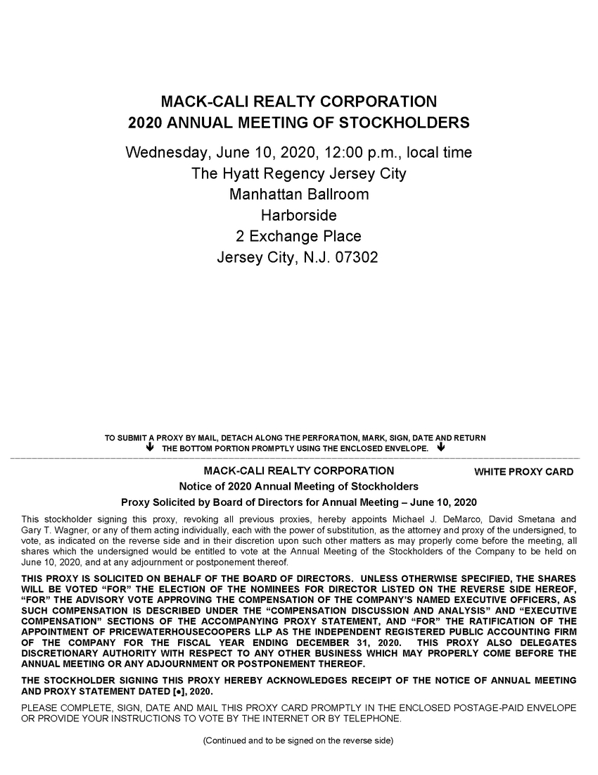 MACK-CALI REALTY CORPORATION 2020 ANNUAL MEETING OF STOCKHOLDERS Wednesday, June 10, 2020, 12:00 p.m., local time The Hyatt Regency Jersey City Manhattan Ballroom Harborside 2 Exchange Place Jersey City, N.J. 07302 TO SUBMIT A PROXY BY MAIL, DETACH ALONG THE PERFORATION, MARK, SIGN, DATE AND RETURN THE BOTTOM PORTION PROMPTLY USING THE ENCLOSED ENVELOPE. MACK-CALI REALTY CORPORATION Notice of 2020 Annual Meeting of Stockholders Proxy Solicited by Board of Directors for Annual Meeting – June 10, 2020 This stockholder signing this proxy, revoking all previous proxies, hereby appoints Michael J. DeMarco, David Smetana and Gary T. Wagner, or any of them acting individually, each with the power of substitution, as the attorney and proxy of the undersigned, to vote, as indicated on the reverse side and in their discretion upon such other matters as may properly come before the meeting, all shares which the undersigned would be entitled to vote at the Annual Meeting of the Stockholders of the Company to be held on June 10, 2020, and at any adjournment or postponement thereof. THIS PROXY IS SOLICITED ON BEHALF OF THE BOARD OF DIRECTORS. UNLESS OTHERWISE SPECIFIED, THE SHARES WILL BE VOTED “FOR” THE ELECTION OF THE NOMINEES FOR DIRECTOR LISTED ON THE REVERSE SIDE HEREOF, “FOR” THE ADVISORY VOTE APPROVING THE COMPENSATION OF THE COMPANY’S NAMED EXECUTIVE OFFICERS, AS SUCH COMPENSATION IS DESCRIBED UNDER THE “COMPENSATION DISCUSSION AND ANALYSIS” AND “EXECUTIVE COMPENSATION” SECTIONS OF THE ACCOMPANYING PROXY STATEMENT, AND “FOR” THE RATIFICATION OF THE APPOINTMENT OF PRICEWATERHOUSECOOPERS LLP AS THE INDEPENDENT REGISTERED PUBLIC ACCOUNTING FIRM WHITE PROXY CARD OF THE COMPANY FOR THE FISCAL YEAR ENDING DECEMBER 31, 2020. THIS PROXY ALSO DELEGATES DISCRETIONARY AUTHORITY WITH RESPECT TO ANY OTHER BUSINESS WHICH MAY PROPERLY COME BEFORE THE ANNUAL MEETING OR ANY ADJOURNMENT OR POSTPONEMENT THEREOF. THE STOCKHOLDER SIGNING THIS PROXY HEREBY ACKNOWLEDGES RECEIPT OF THE NOTICE OF ANNUAL MEETING AND PROXY STATEMENT DATED [●], 2020. PLEASE COMPLETE, SIGN, DATE AND MAIL THIS PROXY CARD PROMPTLY IN THE ENCLOSED POSTAGE-PAID ENVELOPE OR PROVIDE YOUR INSTRUCTIONS TO VOTE BY THE INTERNET OR BY TELEPHONE. (Continued and to be signed on the reverse side)