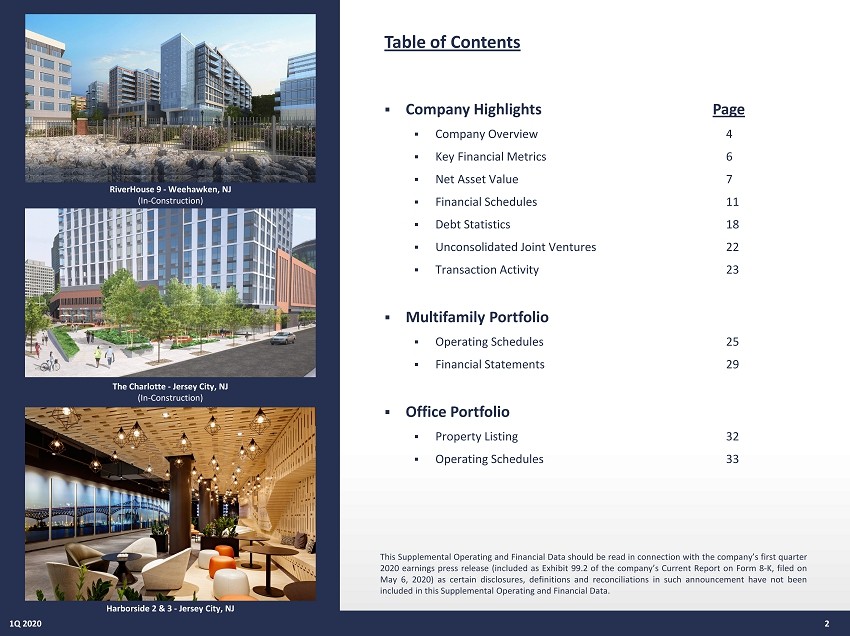 Table of Contents ▪ Company Highlights Page ▪ Company Overview 4 ▪ Key Financial Metrics 6 ▪ Net Asset Value 7 ▪ Financial Schedules 11 ▪ Debt Statistics 18 ▪ Unconsolidated Joint Ventures 22 ▪ Transaction Activity 23 ▪ Multifamily Portfolio ▪ Operating Schedules 25 ▪ Financial Statements 29 ▪ Office Portfolio ▪ Property Listing 32 ▪ Operating Schedules 33 1Q 2020 2 This Supplemental Operating and Financial Data should be read in connection with the company’s first quarter 2020 earnings press release (included as Exhibit 99 . 2 of the company’s Current Report on Form 8 - K, filed on May 6 , 2020 ) as certain disclosures, definitions and reconciliations in such announcement have not been included in this Supplemental Operating and Financial Data . RiverHouse 9 - Weehawken, NJ (In - Construction) The Charlotte - Jersey City, NJ (In - Construction) Harborside 2 & 3 - Jersey City, NJ