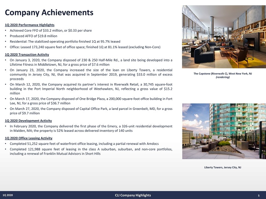 Company Overview 4 1Q 2020 Corporate Profile Mack - Cali (CLI) is a fully integrated REIT with a dual asset platform comprised of residential holdings and waterfront office . We are geographically focused on the high barrier - to - entry Hudson River waterfront targeting cash flow growth through all economic cycles . Company Objectives Mack - Cali’s office portfolio strives to achieve the highest possible rents in select markets with a continuous focus on improving the quality of our portfolio . Mack - Cali’s residential portfolio, via our Roseland Residential platform, is a market - leading residential developer and owner of class A properties . We have experienced and expect continued growth and cash flow contribution from our residential holdings as our development pipeline of active construction projects and planned starts is put into service . CLI Company Highlights District Kitchen, Harborside 2 & 3 Jersey City, NJ Key Statistics 1Q 2020 4Q 2019 Company Market Capitalization $5.0 billion $5.7 billion Net Asset Value (Midpoint) $3.3 billion $3.4 billion Core FFO $33.2 milion $44.1 million Core FFO Per Diluted Share $0.33 $0.44 AFFO $19.8 million $26.2 million Residential Portfolio Operating Units/Keys 6,896 6,896 % Leased 95.7% 95.0% Average Rent Per Unit $3,028 $2,974 In-Construction Units 1,942 1,942 Land Bank Units 9,373 9,373 Office Portfolio Square Feet of Office Space 10.3 million 10.5 million Consolidated In-Service Properties 39 40 % Leased Office (Excl. Non-Core) 81.1% 80.7% % Commenced Occupancy (Excl. Non-Core) 78.8% 79.2% Cash Rental Rate Roll-Up (Excl. Non-Core) 4.6% 6.5% GAAP Rental Rate Roll-Up (Excl. Non-Core) 19.7% 19.9% Average In-Place Rent Per Square Foot $36.58 $36.03